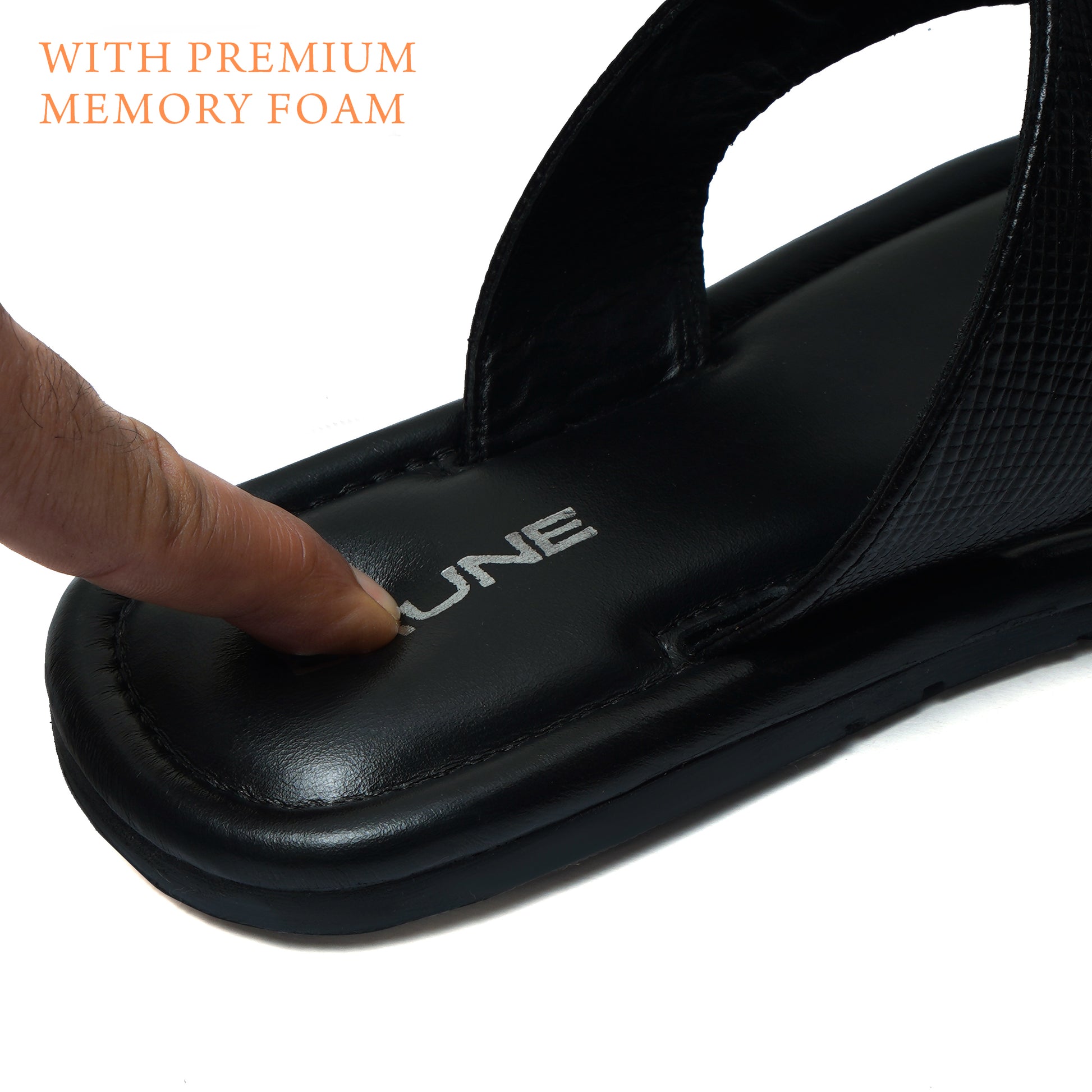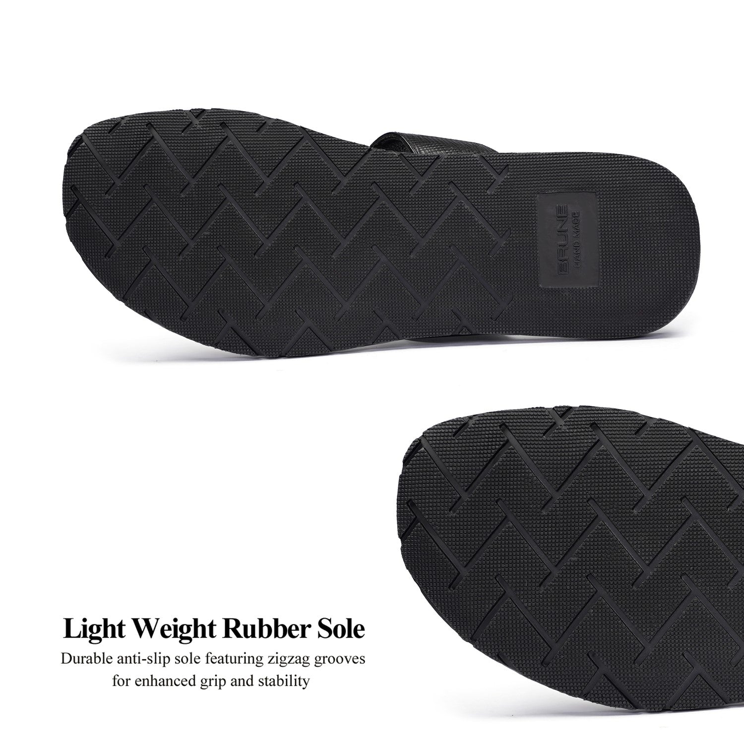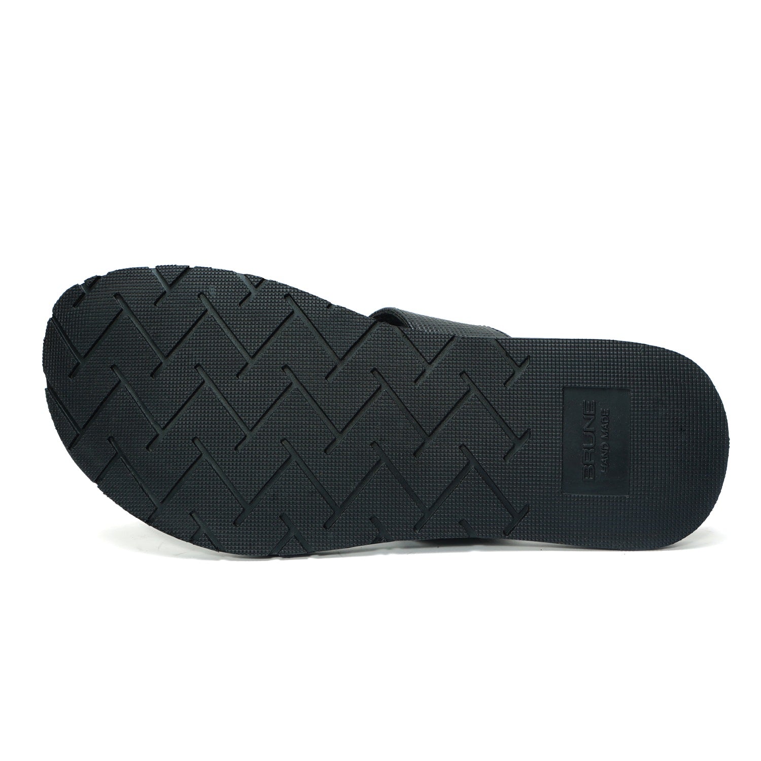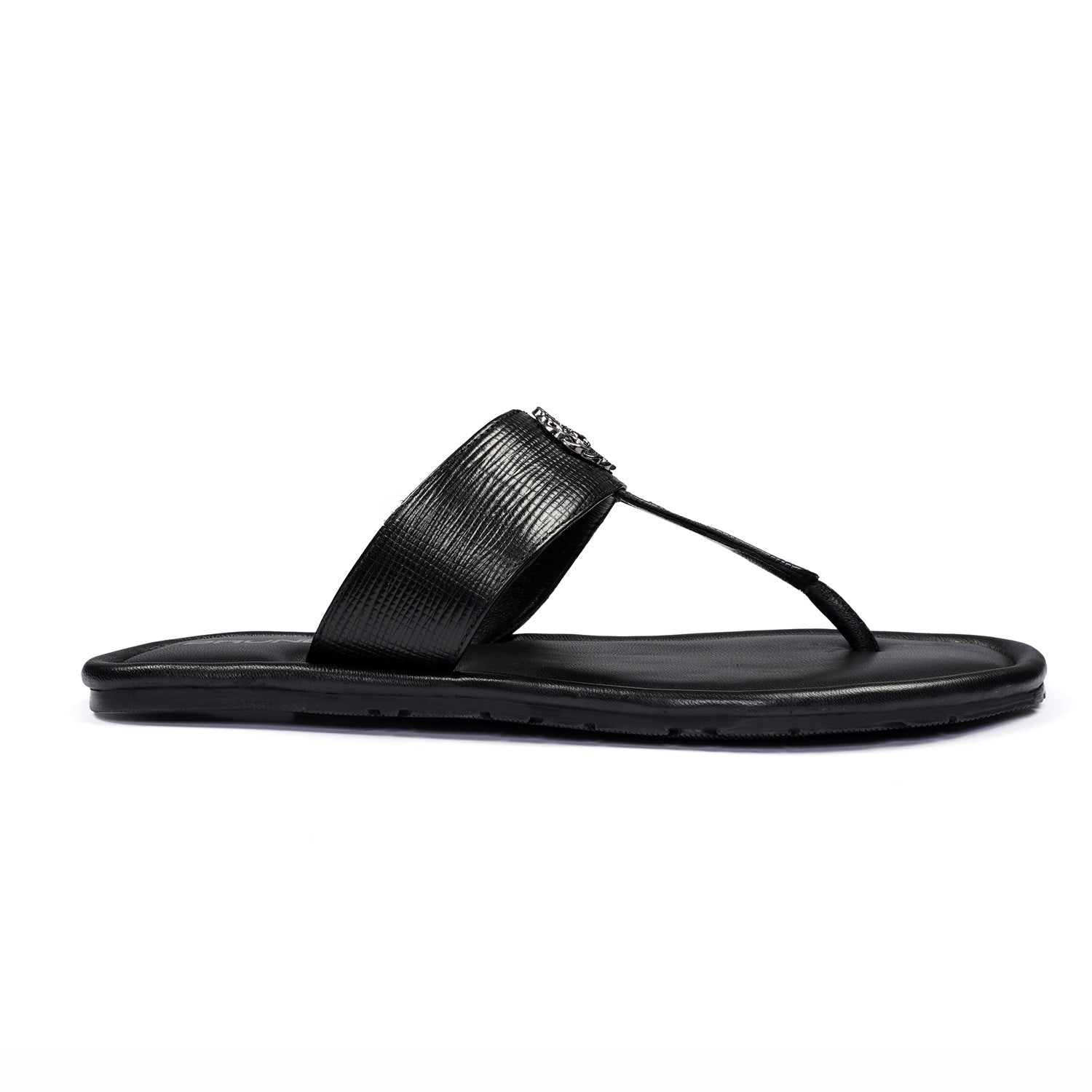 Introducing the ultimate in luxury, the Brune & Bareskin Saffiano T-Strap Black Slide-in Slipper. Hand crafted and hand stitched with exotic saffiano genuine leather, this sleek t-strap slipper exudes sophistication with a gunmetal chain embellishment and trademark lion logo. Enjoy both comfort and style with the super-soft base and rubberized flat sole. Perfect for the fashion-forward man. You can customize this chic boots in any of your favorite color with our bespoke services.