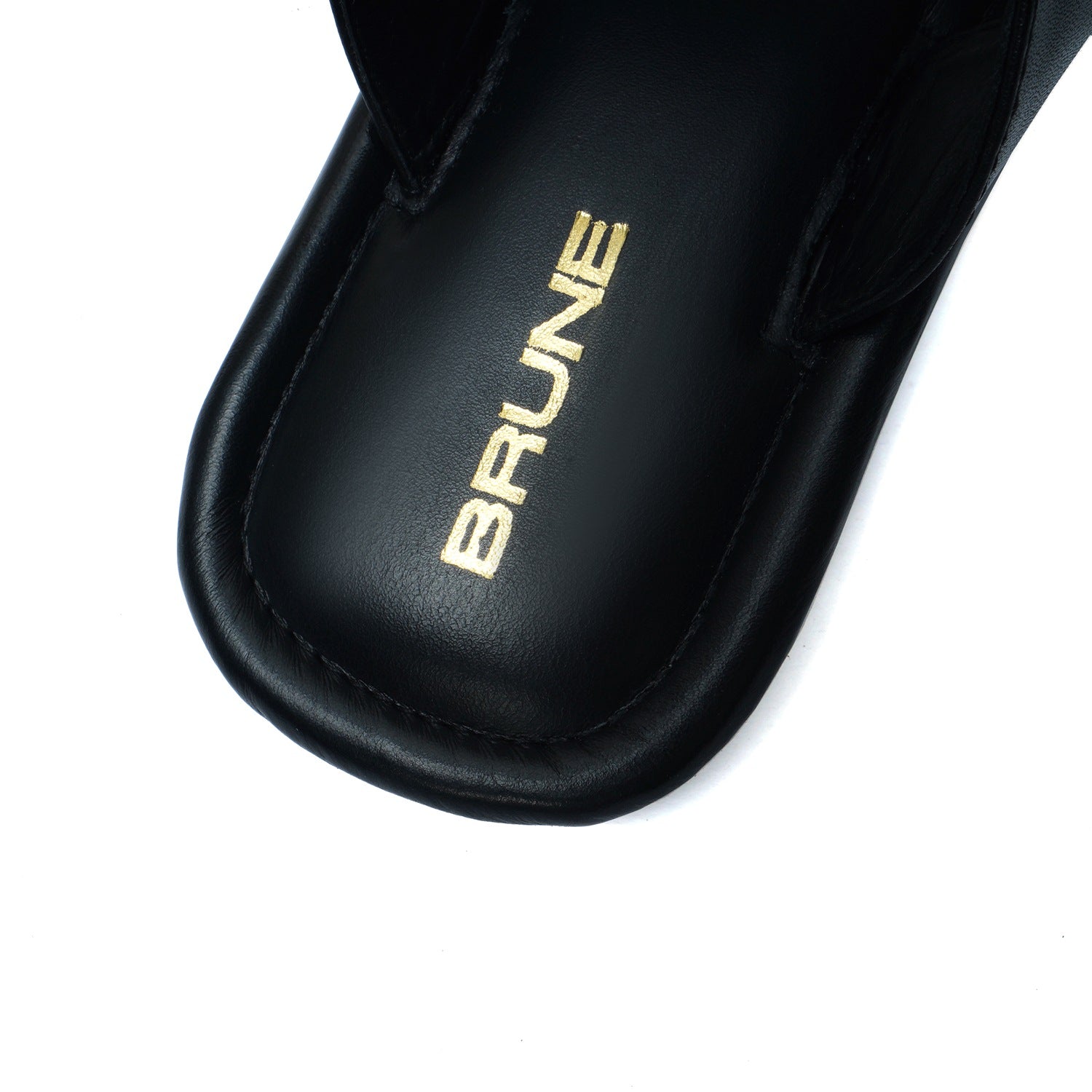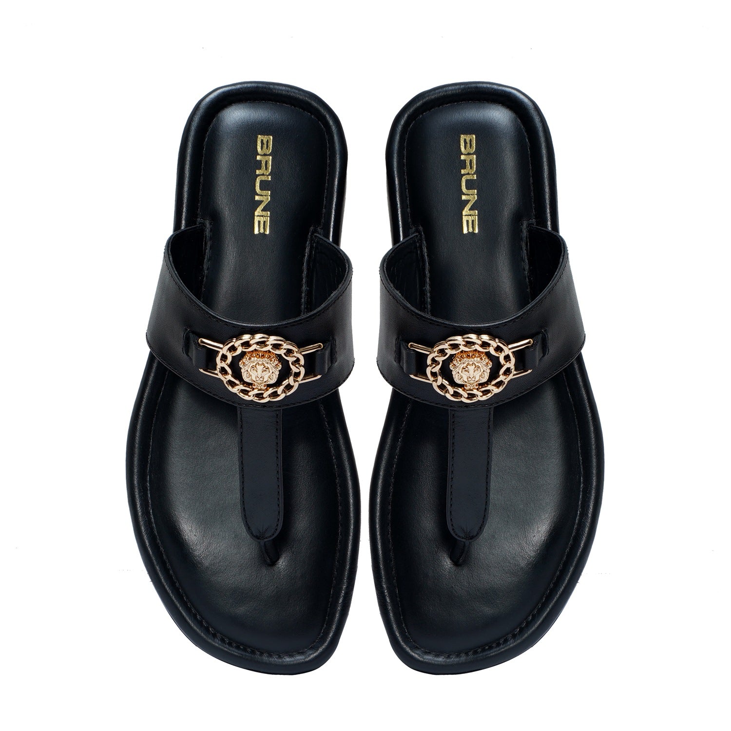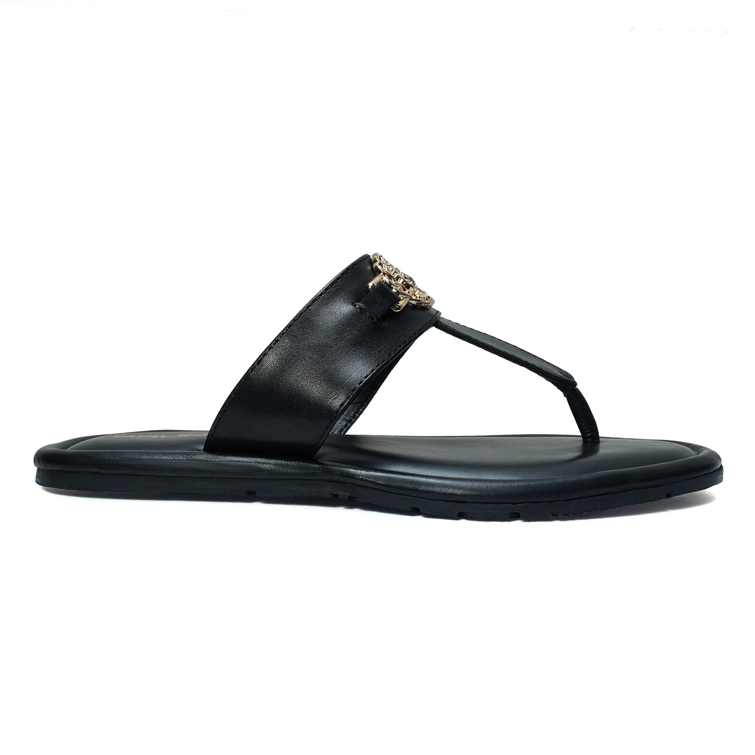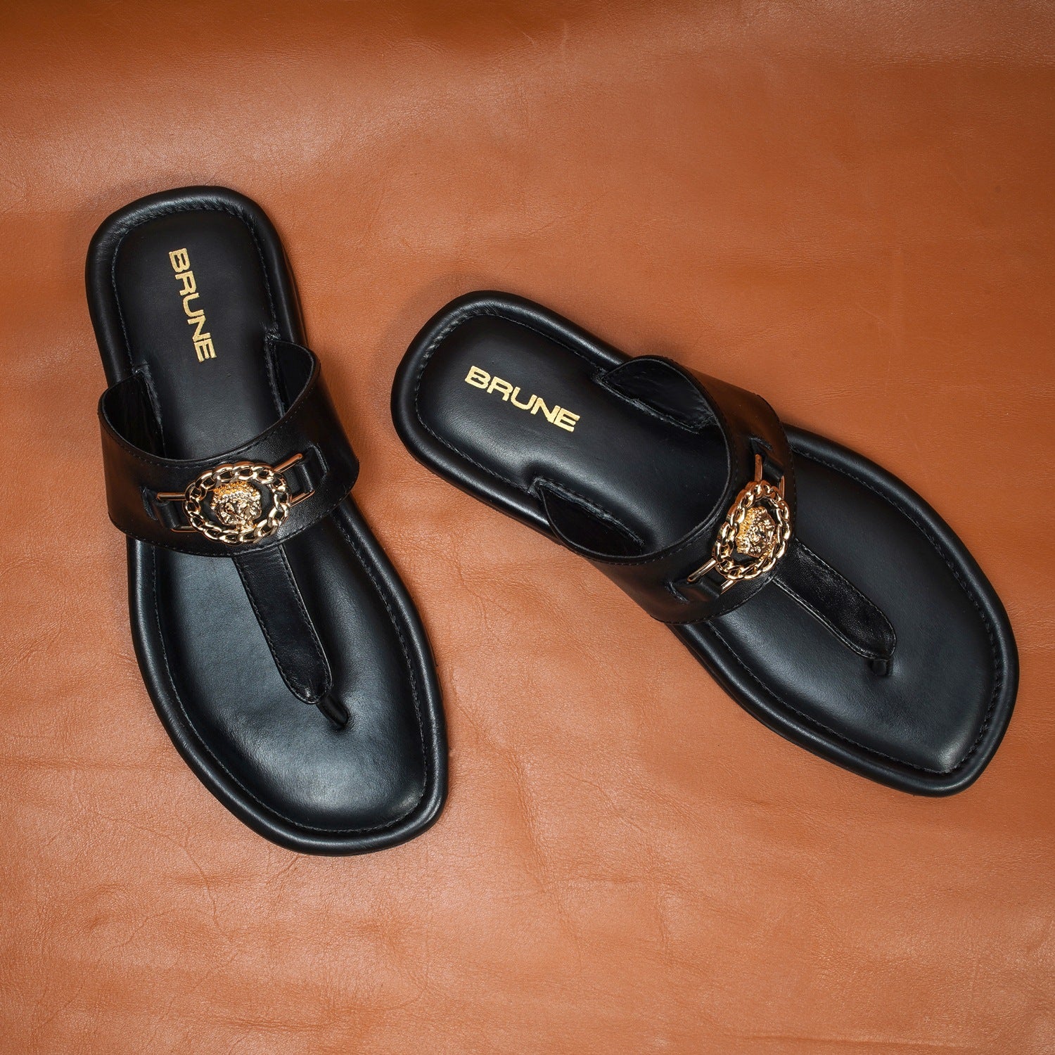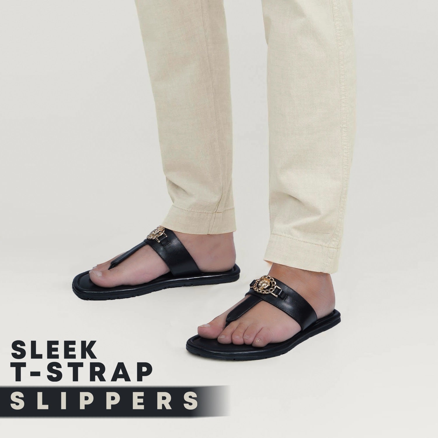 These T-Strap Black Slide-in Slippers feature the trademark lion logo buckle, adding a touch of luxury to a casual summer fashion. Made with premium leather and a memory foam insole, these comfortable slippers are perfect for everyday wear. The rubberized flat outsole provides stability for all-day errands.