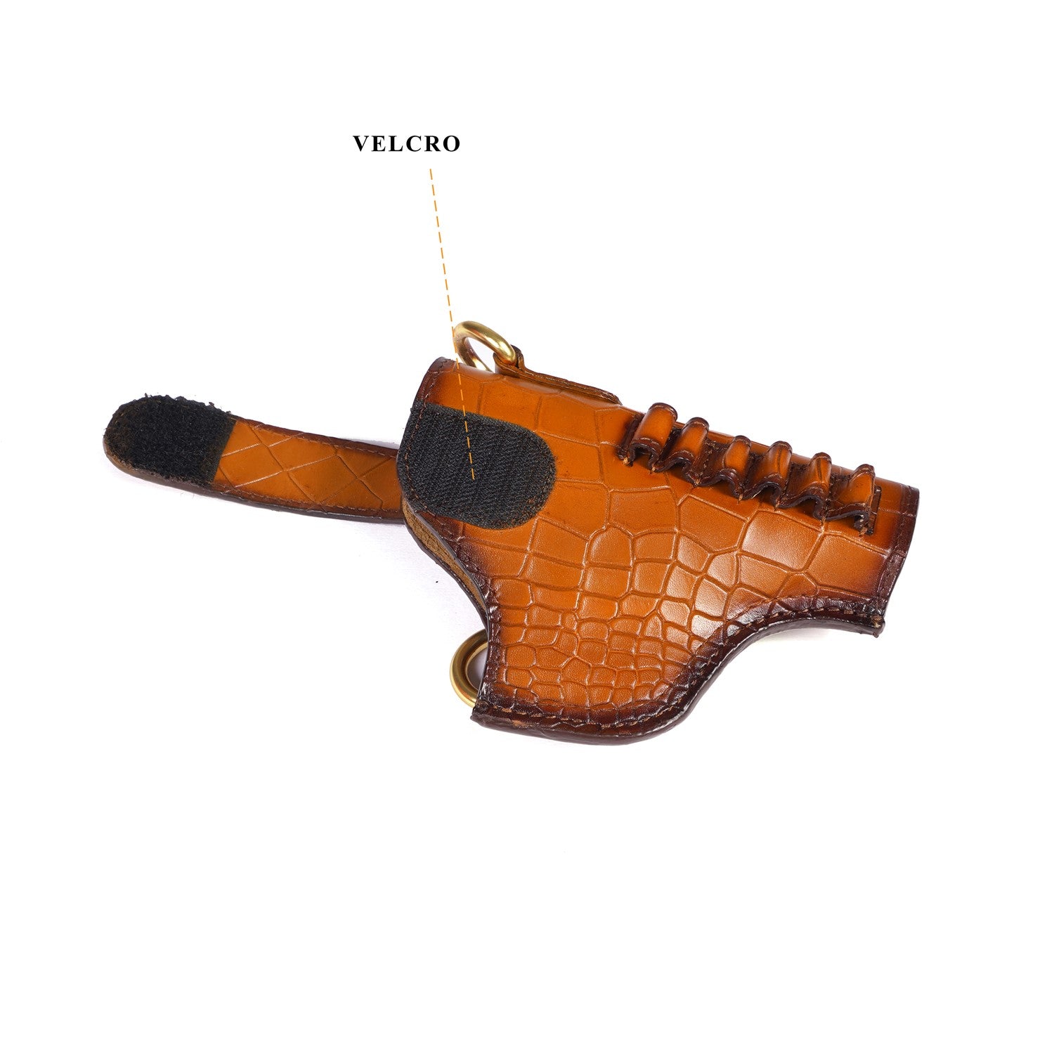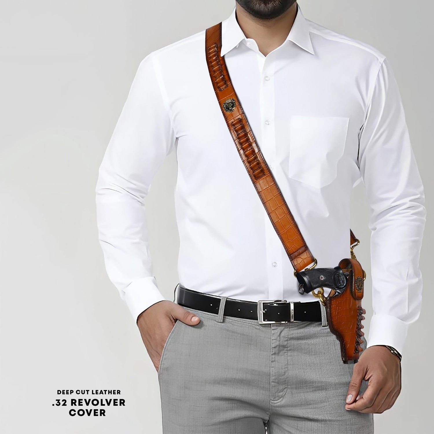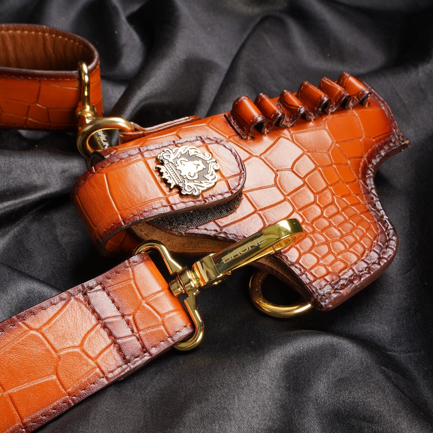 It's super stylish & elegant gun cover by Brune & Bareskin. Made of Deep cut croco leather in Tan color. This specific cover is for .45 revolver, ideal for Webley or Indian ordinance revolver. Strong & wide adjustable Strap is attached to maintain its durability & comfort to wear through your chest. Bullet Holders on wide adjustable leather strap added to enhance the elegance further. BRUNE & BARESKIN'S signature metal lion logo on wide Velcro strap is added to enhance the elegance further. It gives classy look to a person when some one holds it. These can be customized to any size weapon .32, 9mm and .45 pistol and revolvers. We offer name Initials and other personalization like color change , laser engraving of logos or slogans. For this please write to us by choosing the "customization tab".