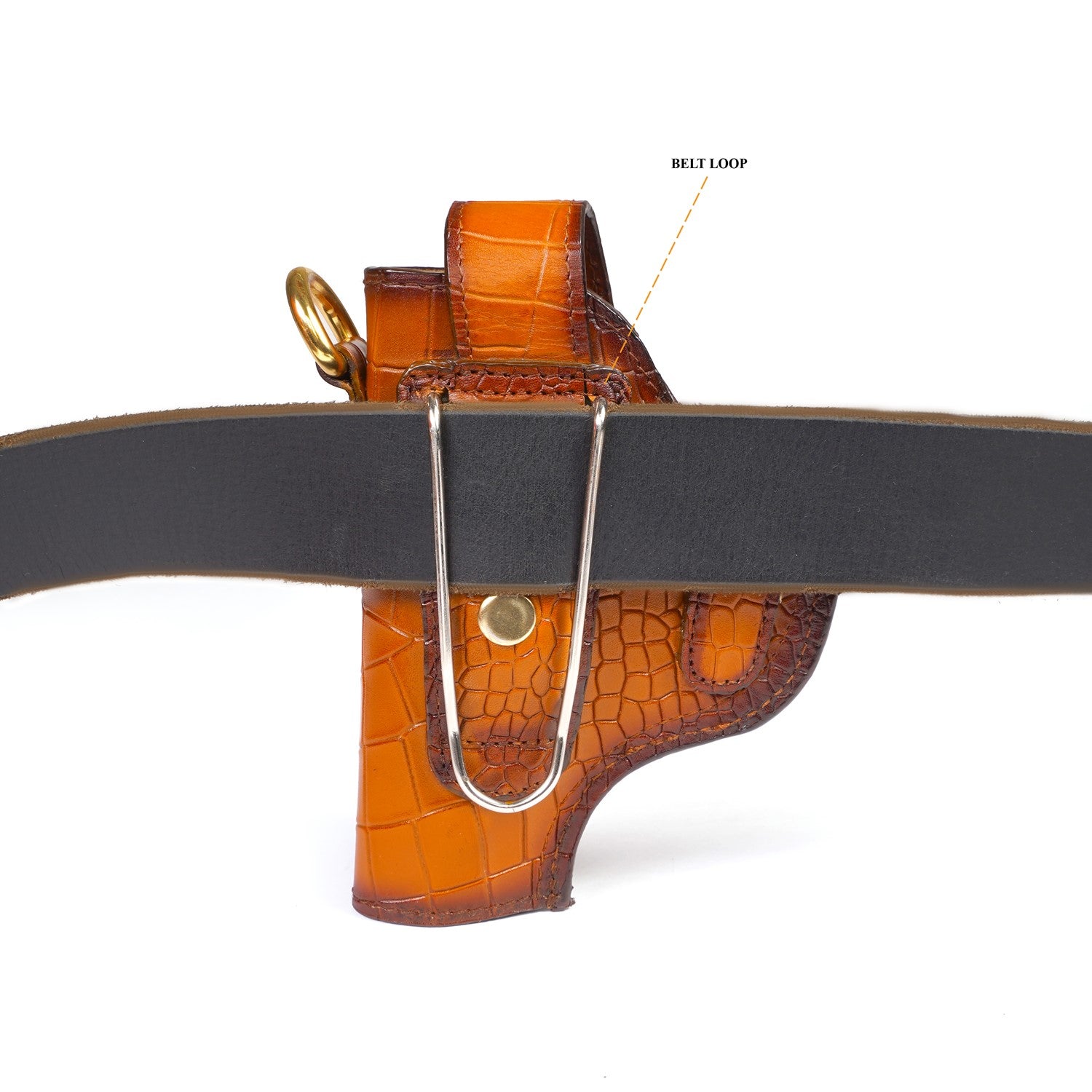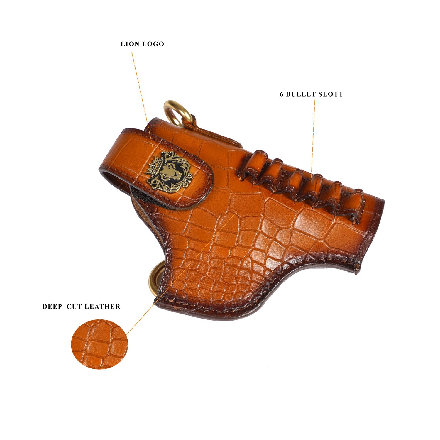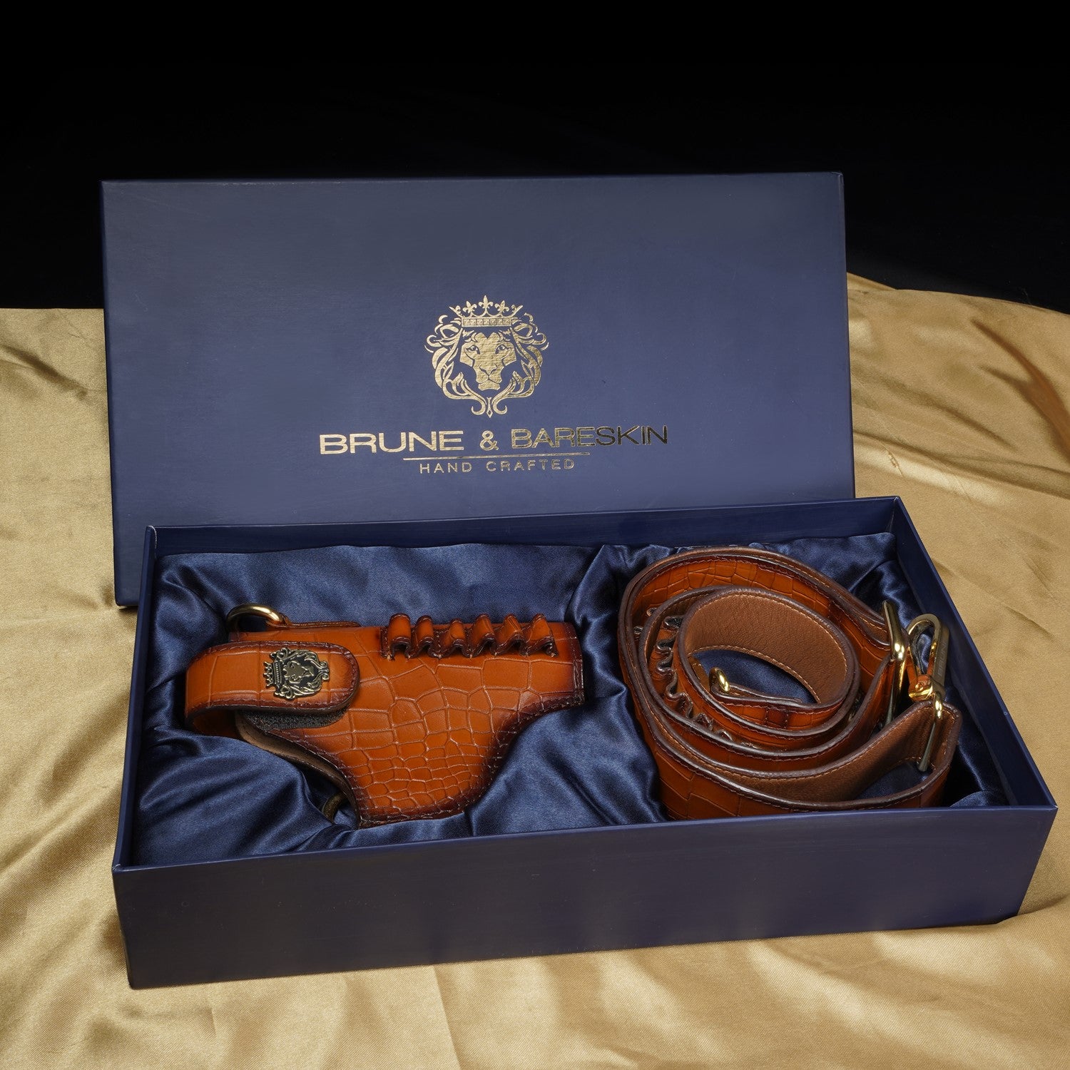 It's super stylish & elegant gun cover by Brune & Bareskin. Made of Deep cut croco leather in Tan color. This specific cover is for .45 revolver, ideal for Webley or Indian ordinance revolver. Strong & wide adjustable Strap is attached to maintain its durability & comfort to wear through your chest. Bullet Holders on wide adjustable leather strap added to enhance the elegance further. BRUNE & BARESKIN'S signature metal lion logo on wide Velcro strap is added to enhance the elegance further. It gives classy look to a person when some one holds it. These can be customized to any size weapon .32, 9mm and .45 pistol and revolvers. We offer name Initials and other personalization like color change , laser engraving of logos or slogans. For this please write to us by choosing the "customization tab".