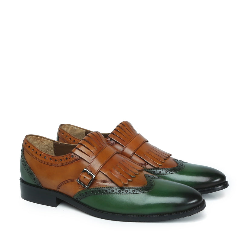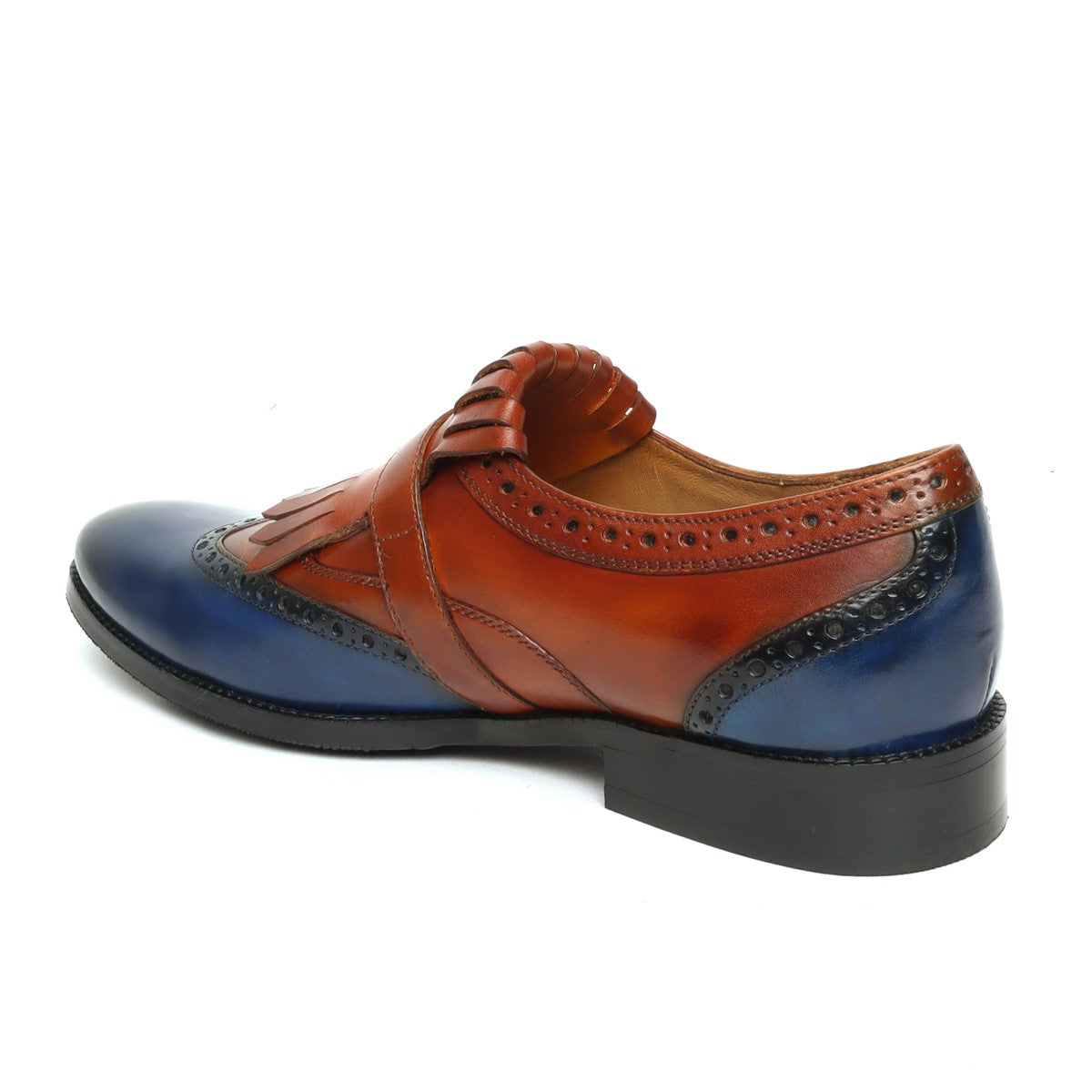 Tan/Blue Leather Fringed Single Monk Strap Shoes By Brune & Bareskin
