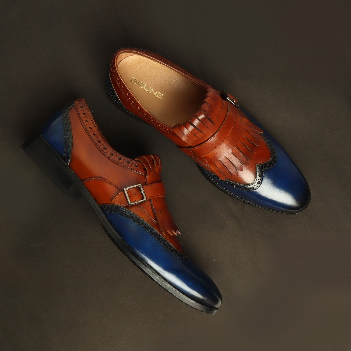 If it is a pair of hand-finished Blue/Tan leather monk shoes with stylish fringes by BRUNE & BARESKIN, then you are sure to be satisfied with the fit and the style. It is often said that finding the perfect pair of shoes to wear for formal occasions is tough. Finding shoes that spell your style, besides being comfortable to wear is definitely a challenge. However, if the shoes are made by BRUNE you can be sure to find comfort and style.