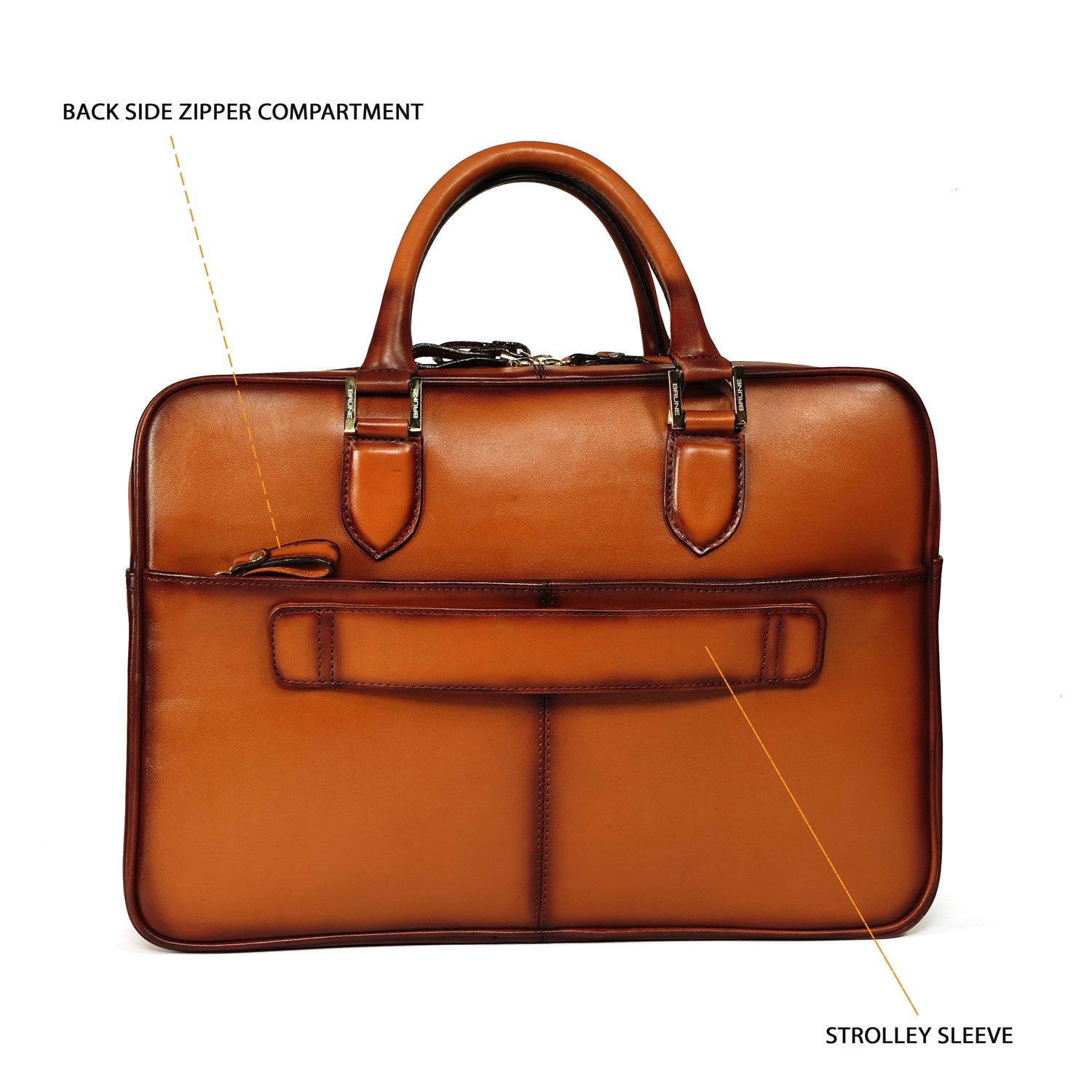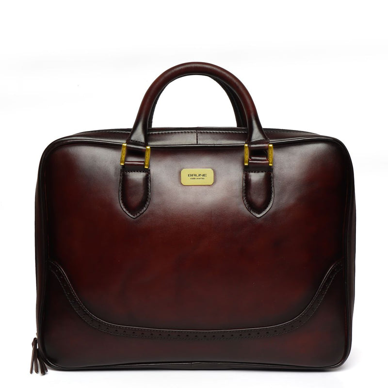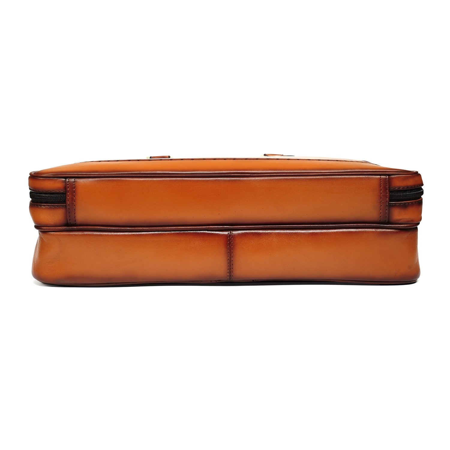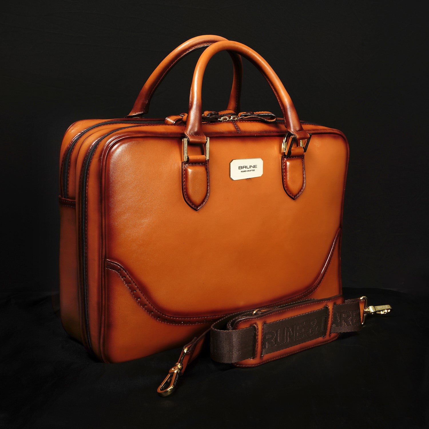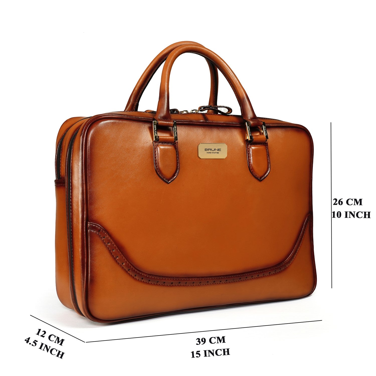 Get the style and convenience at the same time with this Brune & Bareskin Laptop Bag. The genuine leather provides the durability which is hard to find anywhere else. The Tan Italian leather office laptop briefcase provides the perfect gentleman look. The brogue detail on front make it more elegant. It has a dedicated laptop sleeve inside with the ultra soft lining. Due to an extra compartment It provides ample space and multiple small pockets in main compartment. The adjustable shoulder strap connects and removes easily with the hidden hardware loops. A Perfect Bag For A Perfectionist Gentleman to organize his daily on goings in his way. You can get it customized in your favorite color shade with Name Initials with our bespoke services. What are you waiting for? You can click on CUSTOMIZE NOW Button (Just above the "ADD TO CART" button) & fill out the form to submit your customization requirements. Or you can reach us by Call, Email, WhatsApp, and DM.