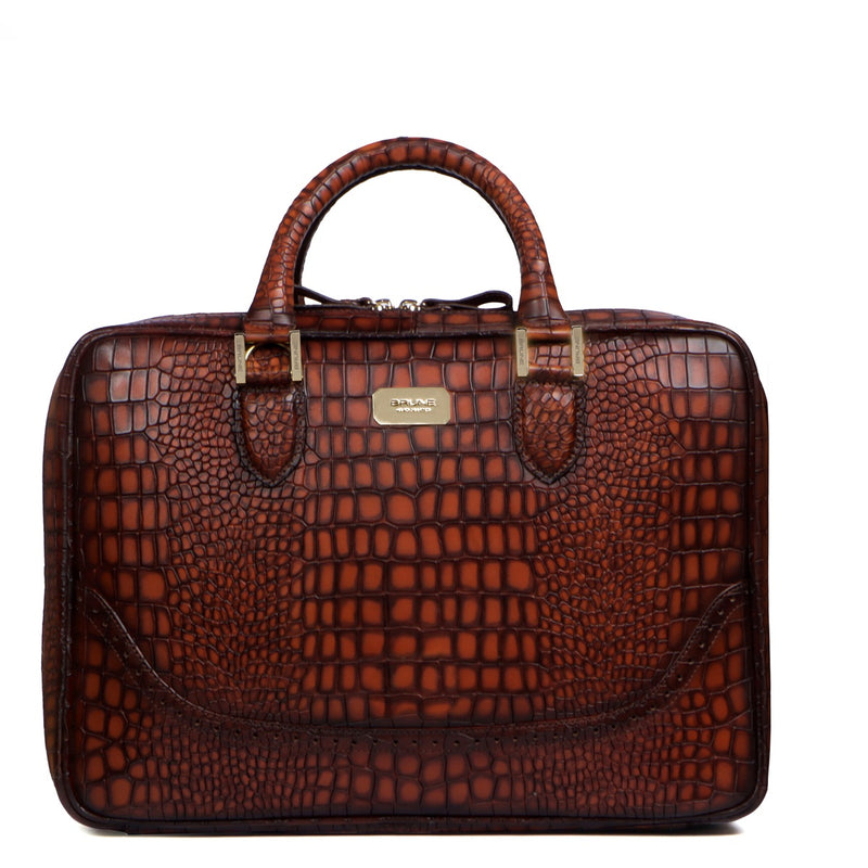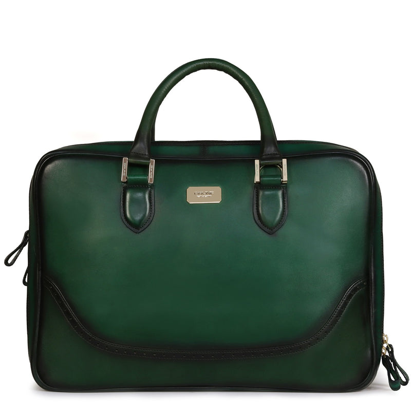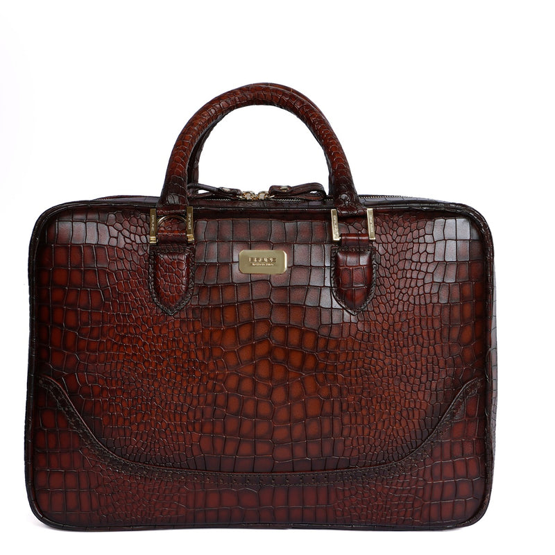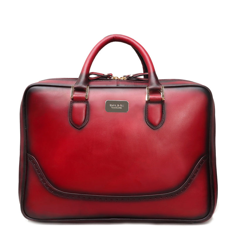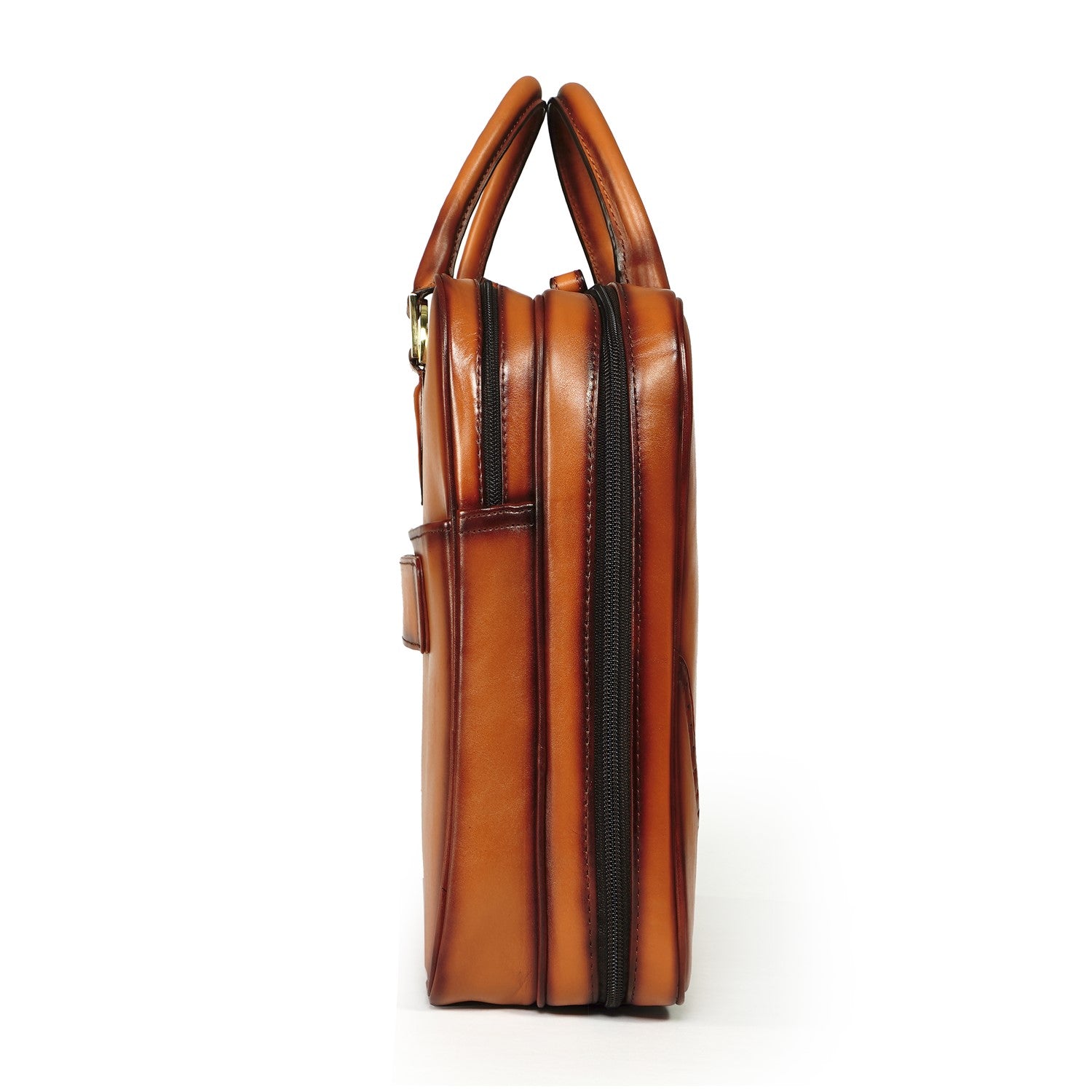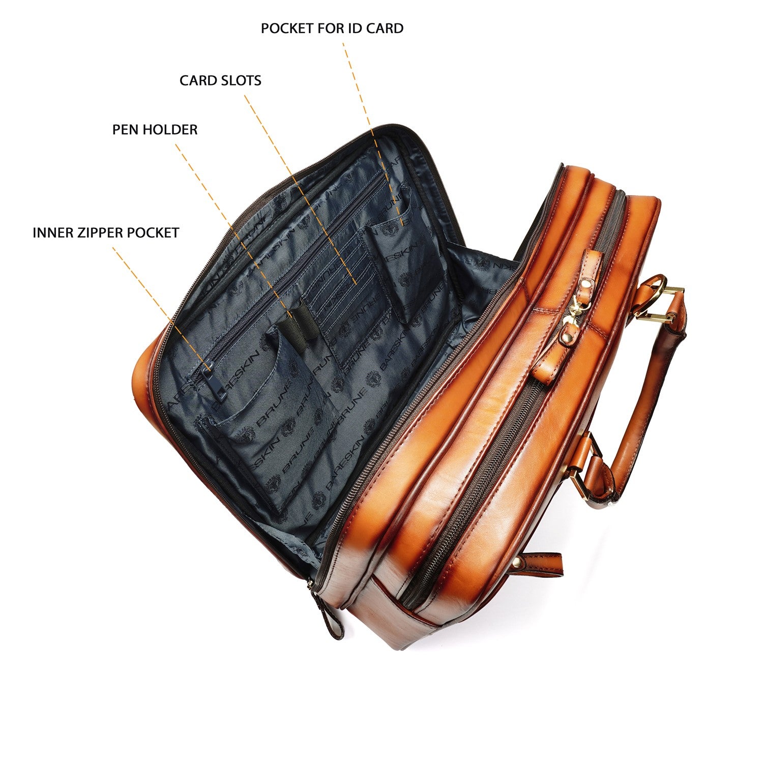 Get the style and convenience at the same time with this Brune & Bareskin Laptop Bag. The genuine leather provides the durability which is hard to find anywhere else. The Tan Italian leather office laptop briefcase provides the perfect gentleman look. The brogue detail on front make it more elegant. It has a dedicated laptop sleeve inside with the ultra soft lining. Due to an extra compartment It provides ample space and multiple small pockets in main compartment. The adjustable shoulder strap connects and removes easily with the hidden hardware loops. A Perfect Bag For A Perfectionist Gentleman to organize his daily on goings in his way. You can get it customized in your favorite color shade with Name Initials with our bespoke services. What are you waiting for? You can click on CUSTOMIZE NOW Button (Just above the "ADD TO CART" button) & fill out the form to submit your customization requirements. Or you can reach us by Call, Email, WhatsApp, and DM.