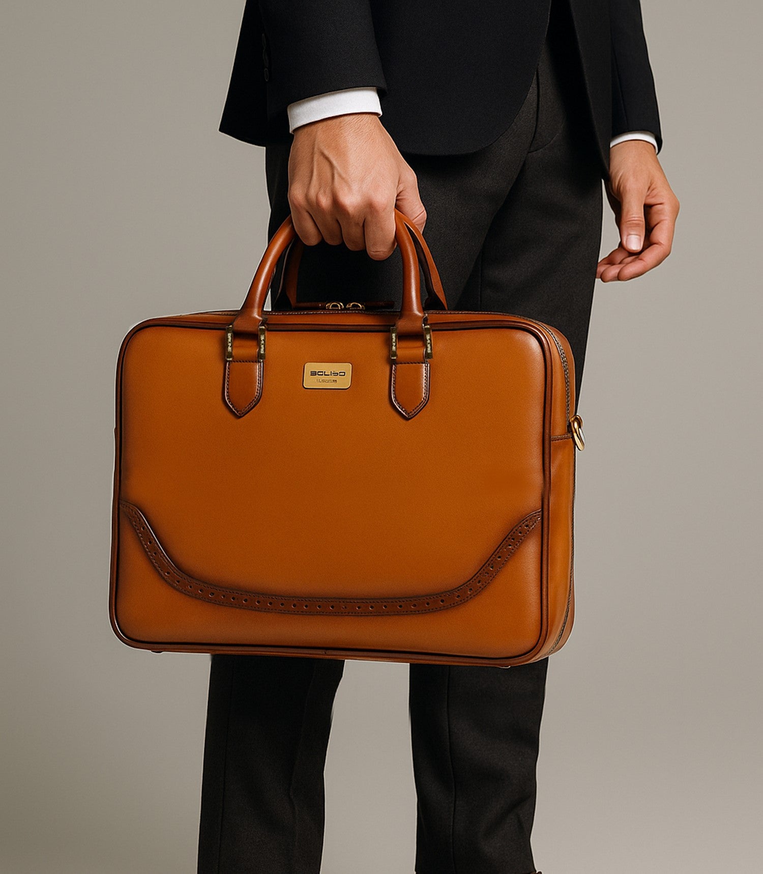 Leather Laptop/Office Tan Briefcase With Brogue Detailing
