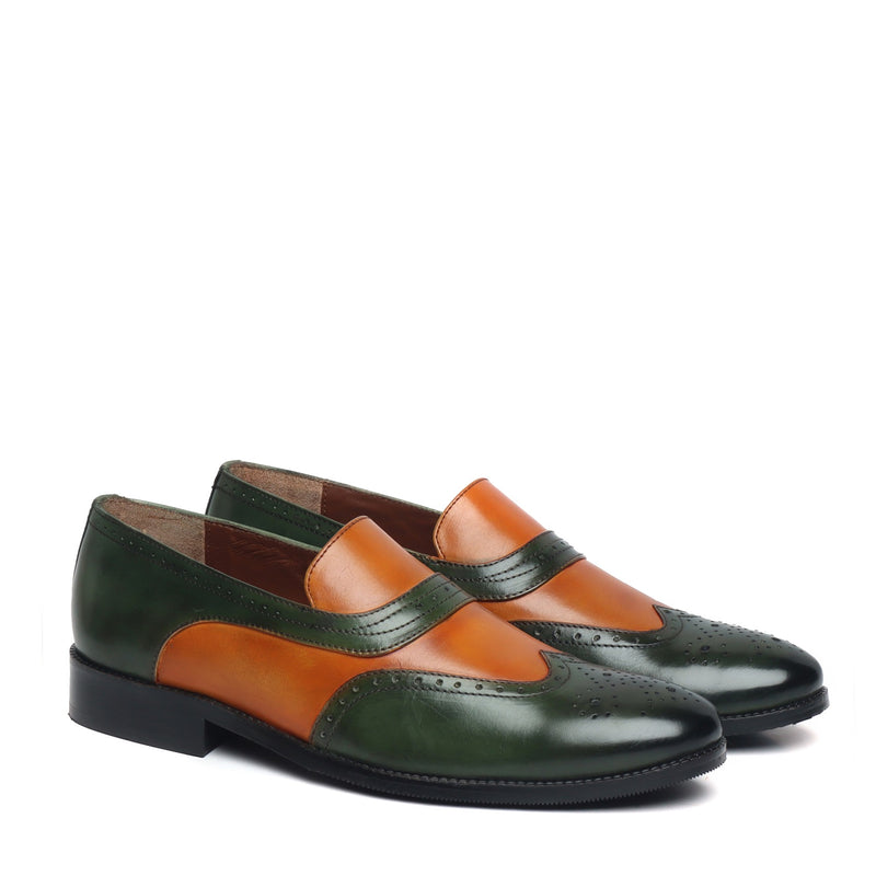 This is very stylish and elegant pair of shoes out there. It is the perfect merger of Italian Leather. The dark brown and rich tan color looks very chic together. It is a perfect pair of footwear for parties. Slip-on closure provides the easy access to wear it. Wingtip Brogue toe enhances its presence. It is a must have accessory for the modern gentlemen. This pair of snug-fit, loafers shoes in astonishing leather is ideal for everyday wear to the office or for meetings with clients. Flaunt your style in this pair of hand painted leather slip-ons for your first one-to-one with your boss, and come away leaving an unforgettable impression.