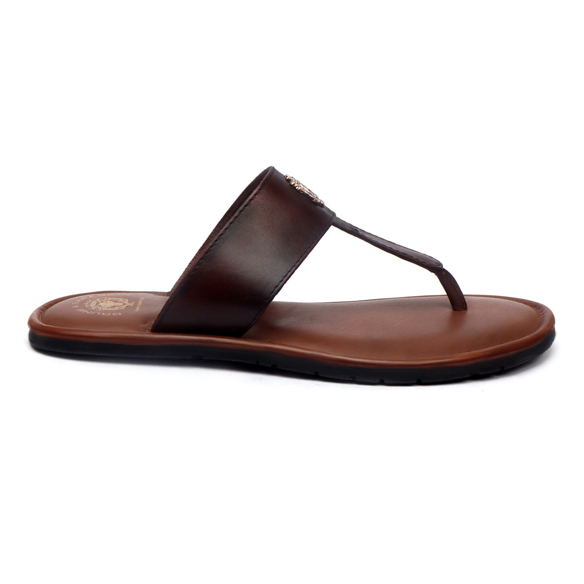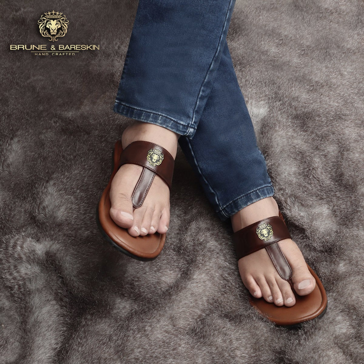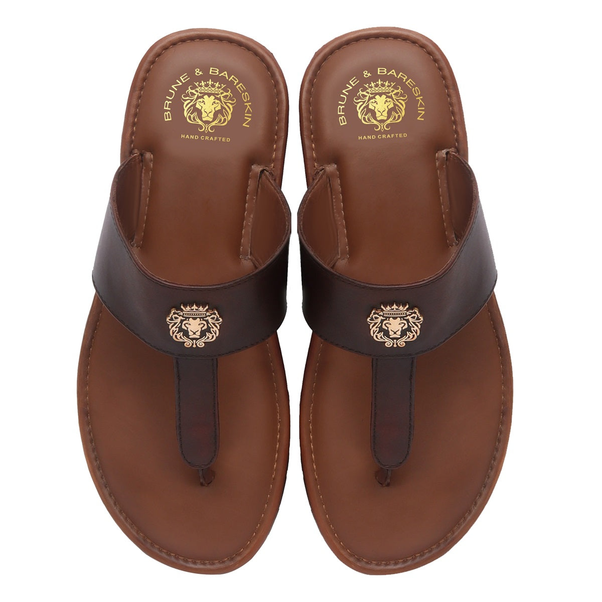 These Tan Leather fashion slippers with metal lion logo are designed to give the complete comfort and style to the feet in this season. Brown Upper Genuine Leather strap with contrasting golden lion logo provides vogue and ruggedness at the same time. This super soft base gives you all day comfort. These men's casual footwears are a good pick to wear with casuals and ethnics.