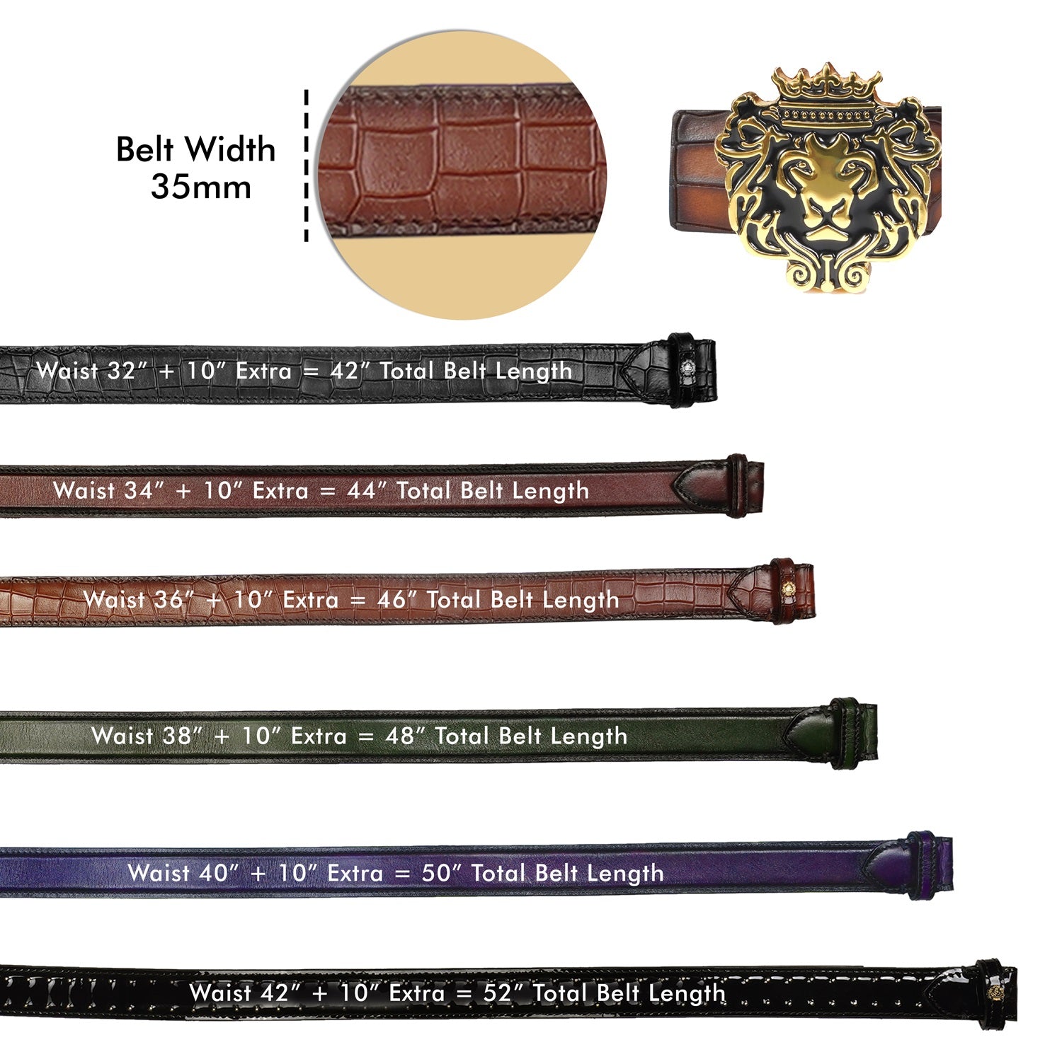 This Men's Tan Belt made with deep cut croco textured leather by Brune & Bareskin is an elegant and sophisticated addition to any wardrobe. The fixed lion logo buckle, made from heavy duty metal, adds an air of exclusivity, while the metal buckle ensures a secure fit and superior durability. Perfect for formal occasions or everyday wear, this belt will keep you looking your best.