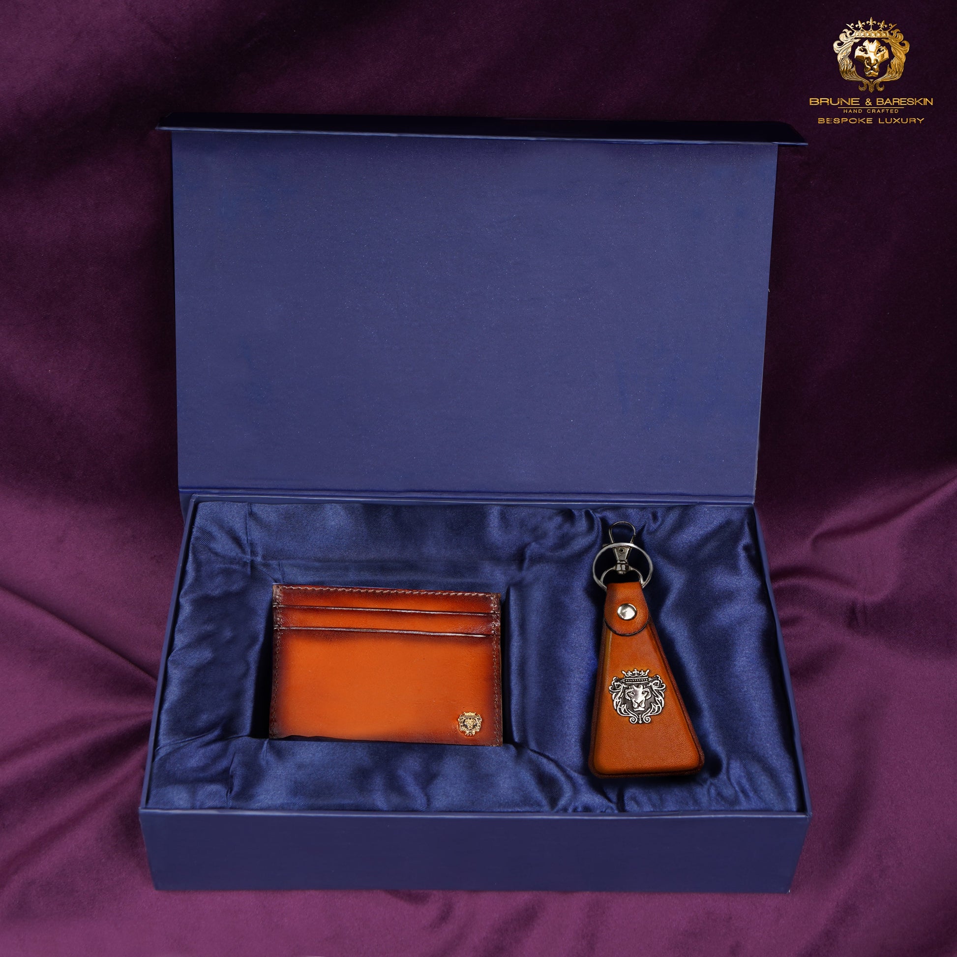 This premium quality combo pack includes a stylish tan genuine leather card holder and keychain, perfect for the rakhi gifting season. Handcrafted with high-quality materials and featuring a unique patina finish, this specially designed set from Brune & Bareskin combines style and practicality with the signature metal lion brand logo. Give the gift of style and functionality with this ultimate gifting combo.