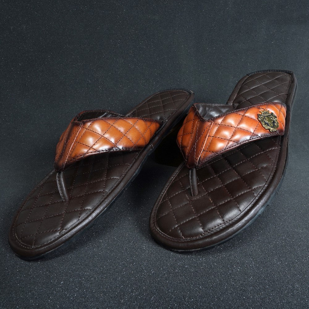 Tan Contrasting V-Strap Leather Slippers