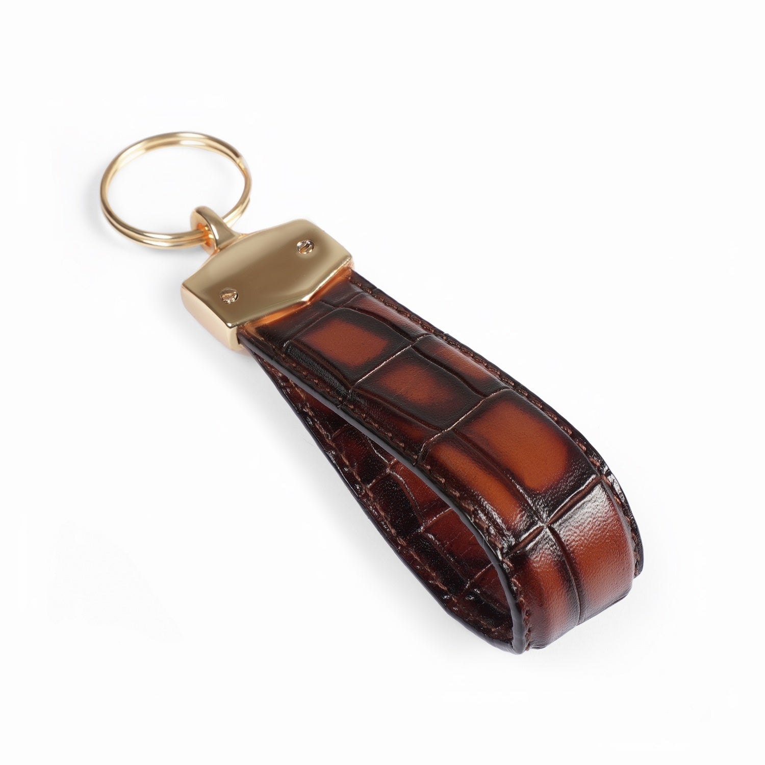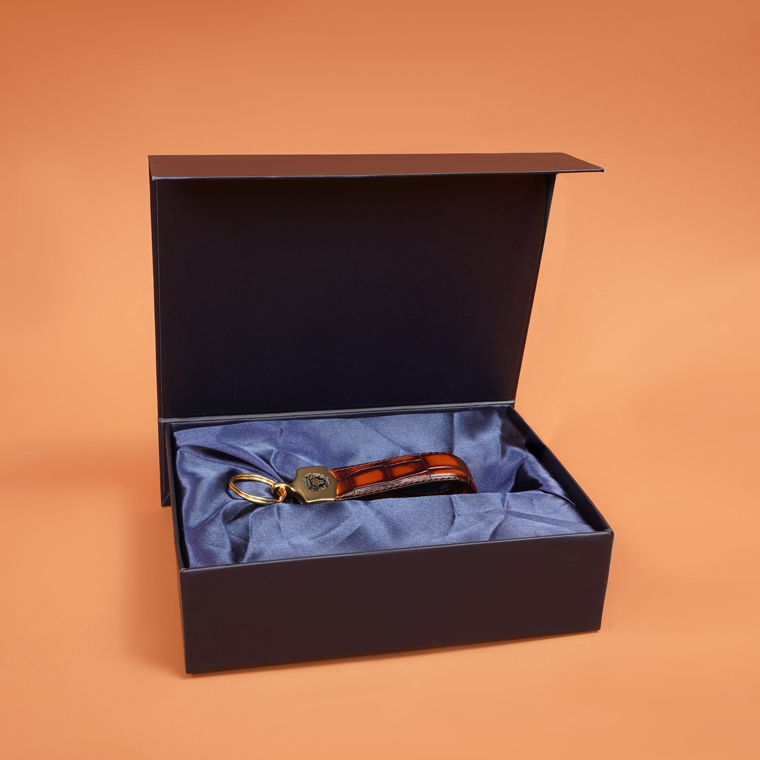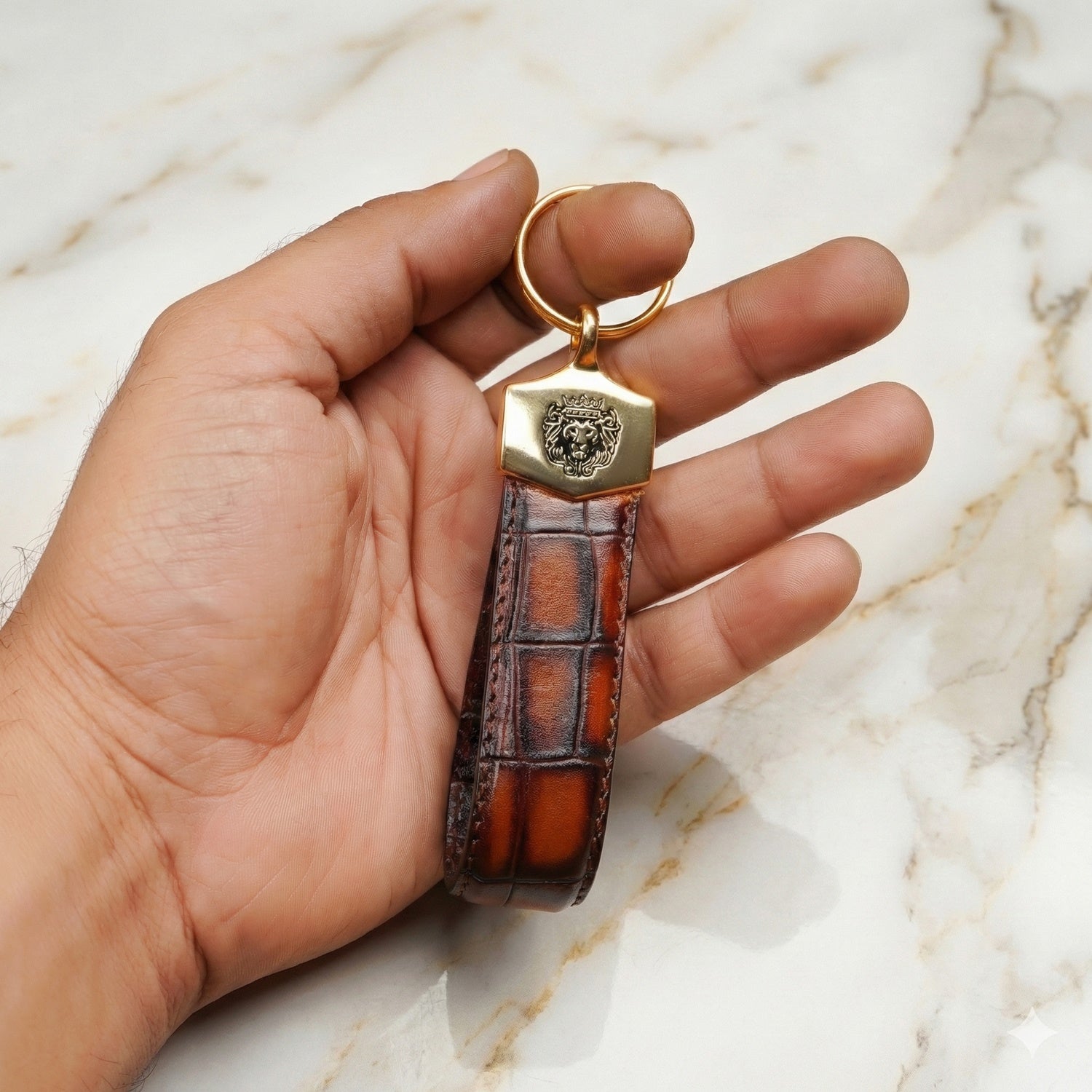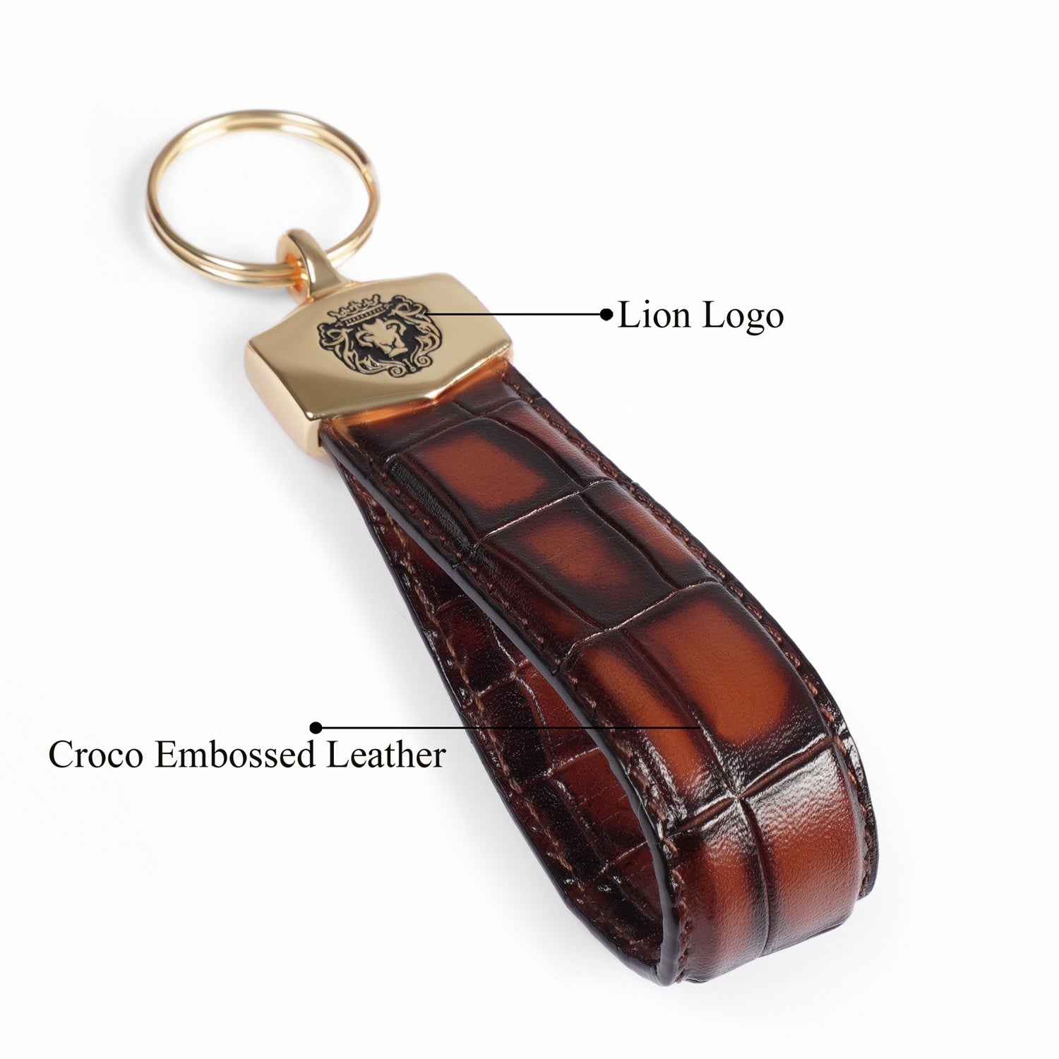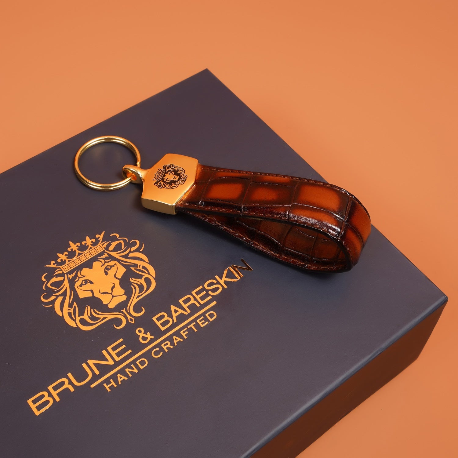 This elegant croco embossed leather keychain is a stylish travel accessory. The tan color provides a very chic look. The gold finish fittings compliments its overall color. Brune & Bareskin signature lion logo on the center looks very elegant. You can also get it customized especially for you with your name initials and favorite color.