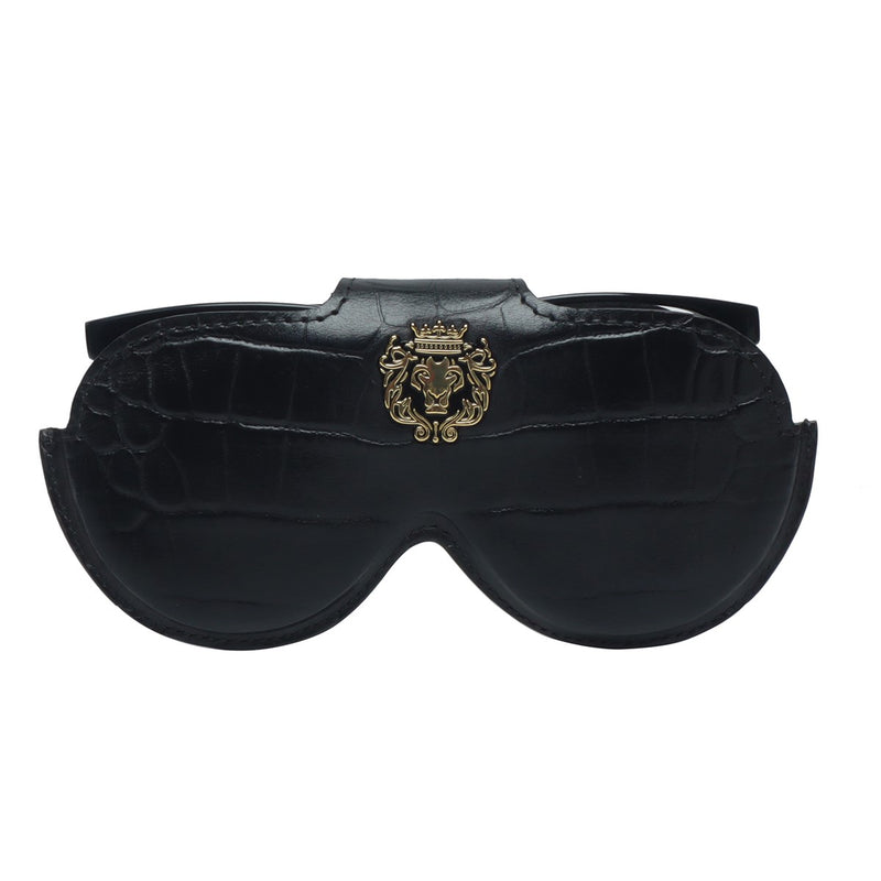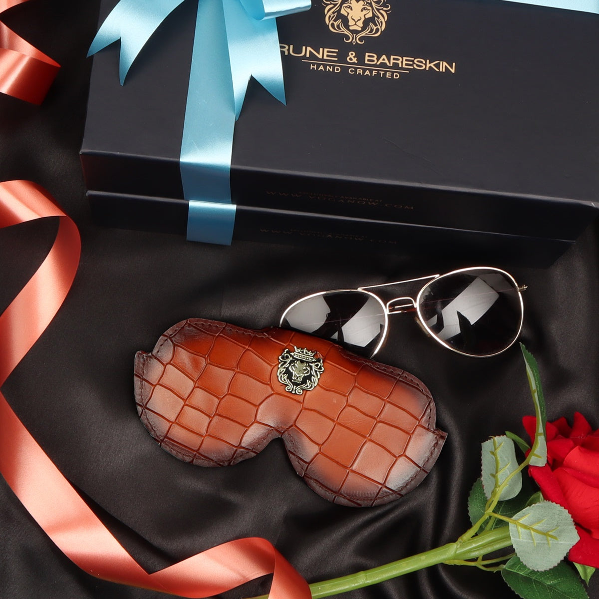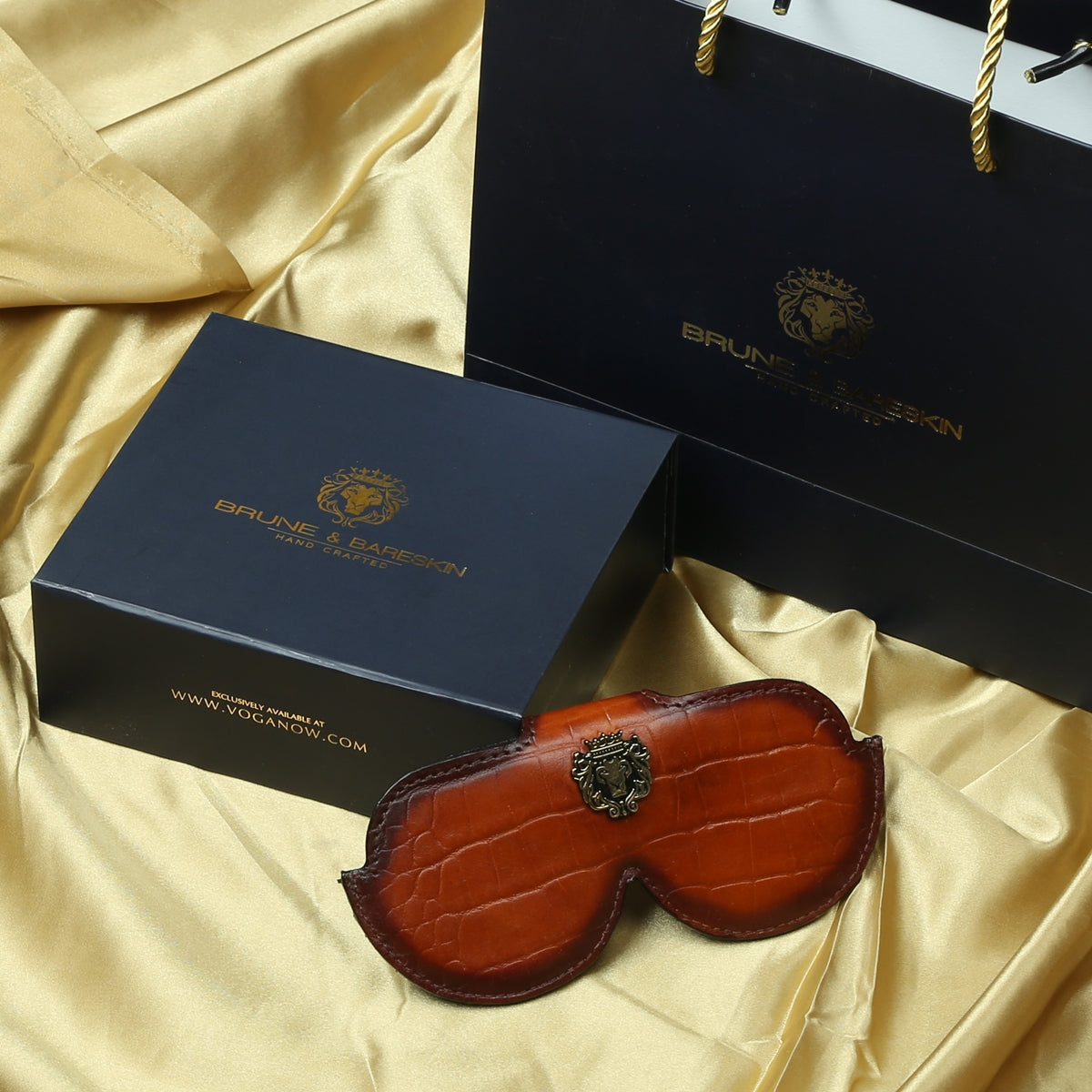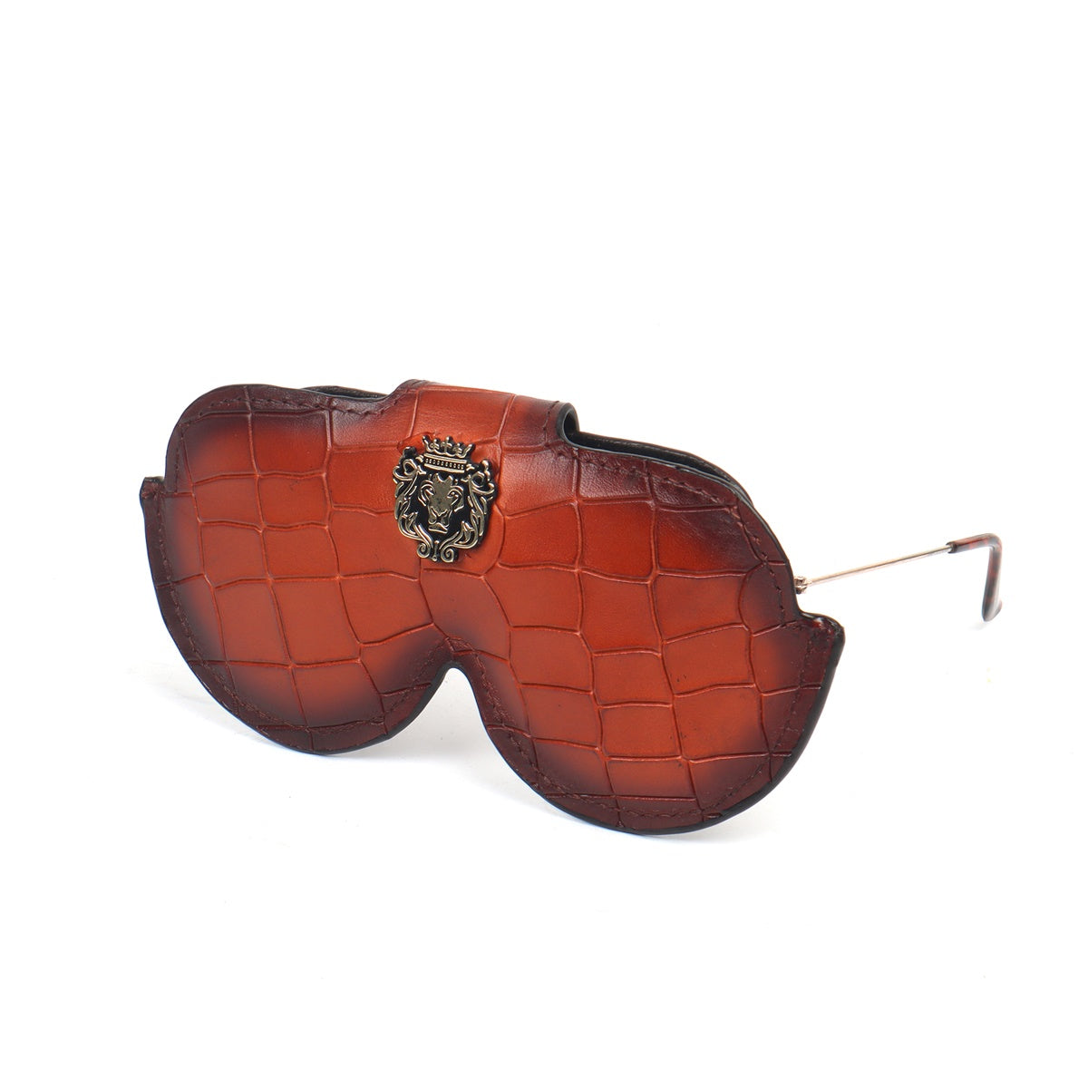 Tan Croco Print Leather With Metal Lion Eyewear Glasses Cover by Brune & Bareskin