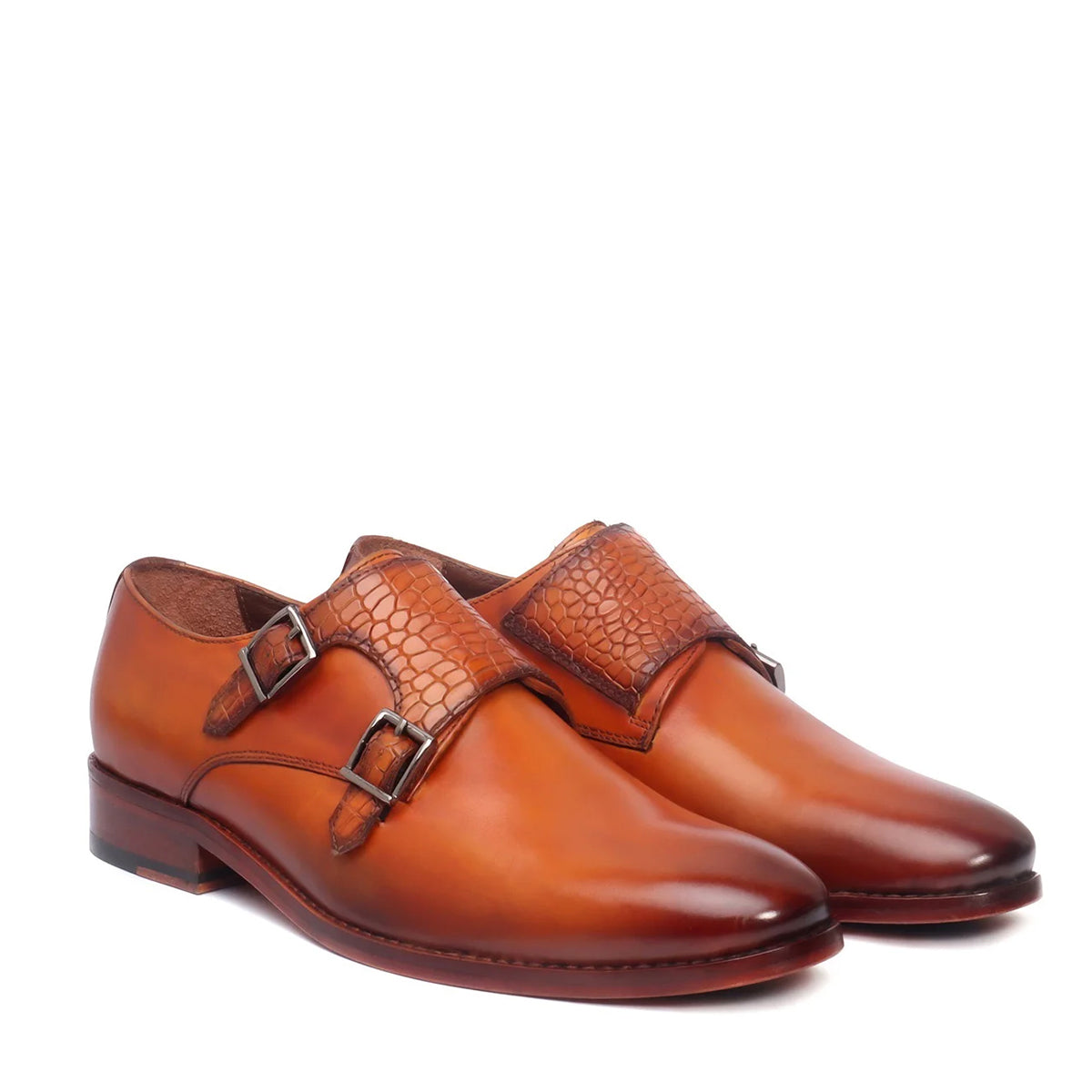 Orangish Tan Croco Strap Double Monk Leather Shoes by Brune & Bareskin