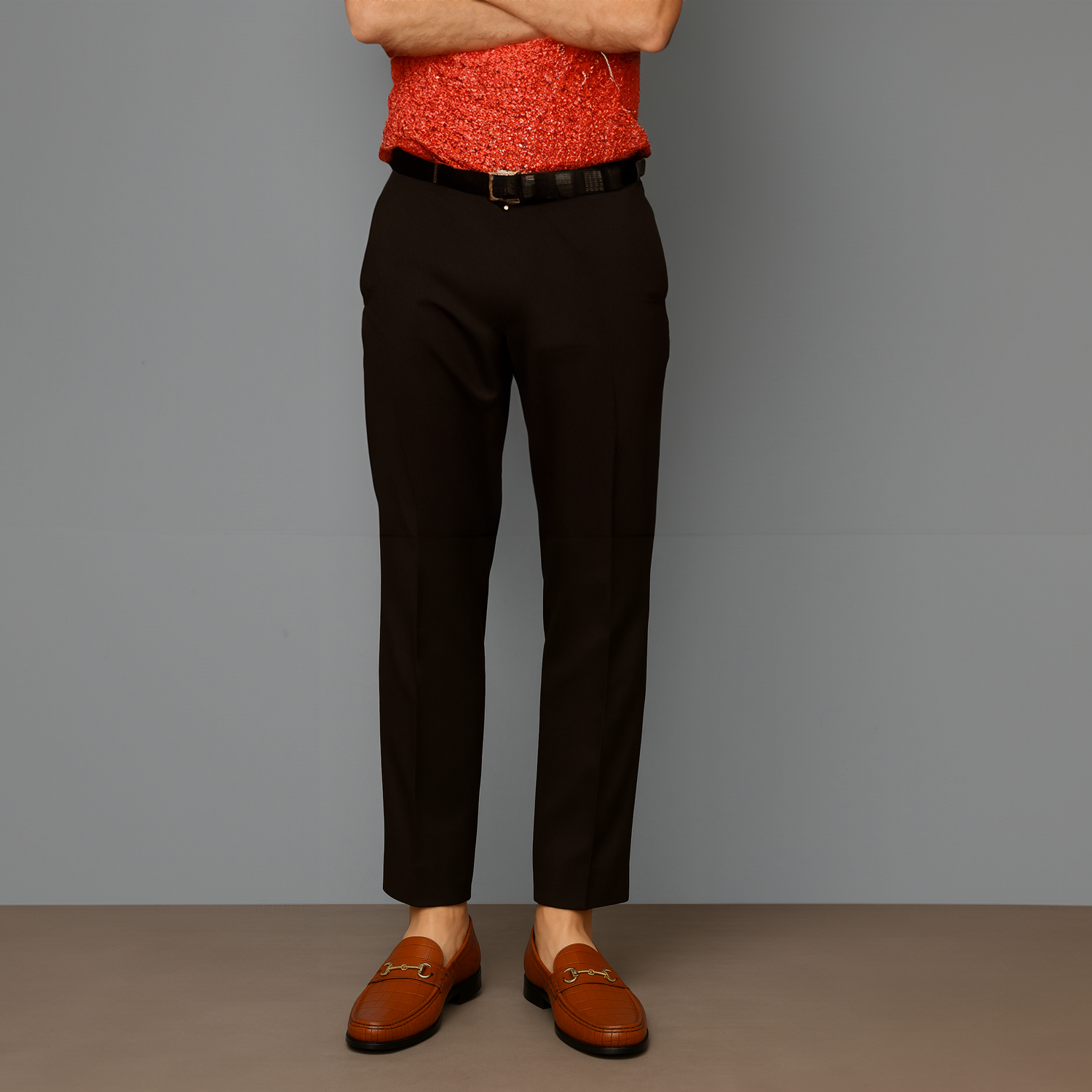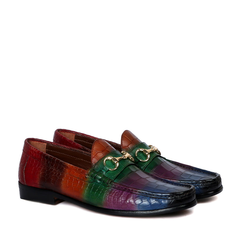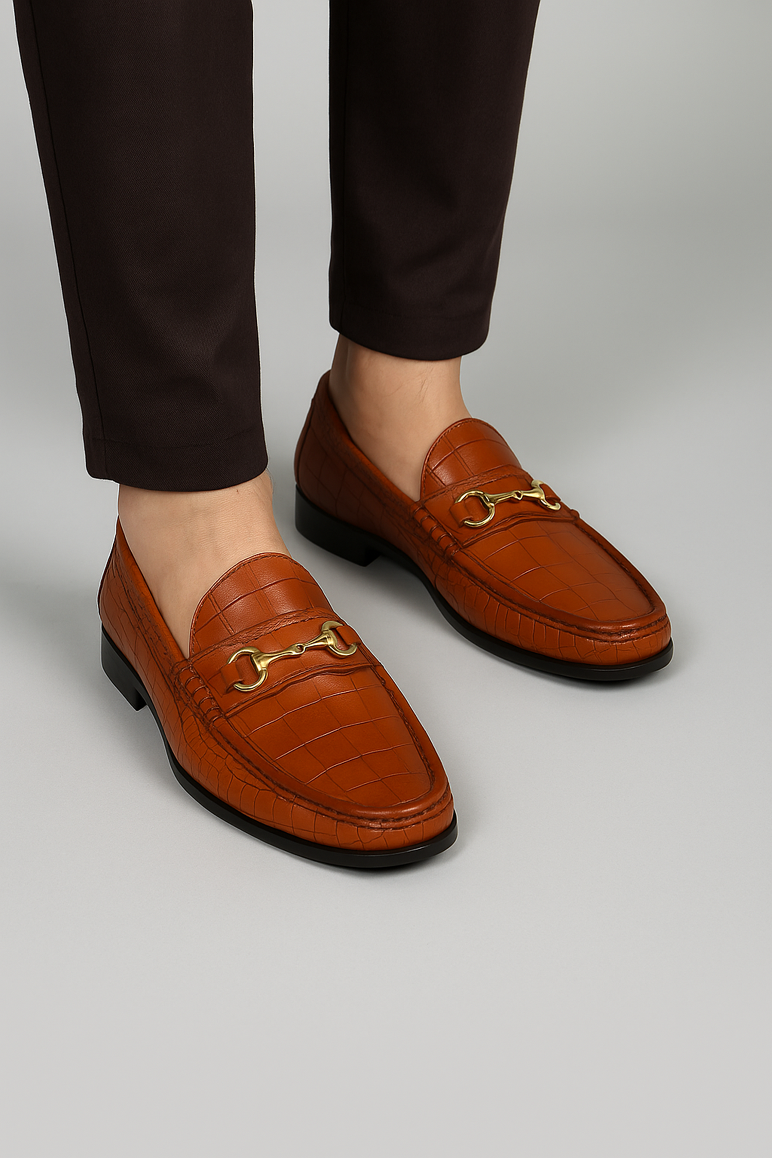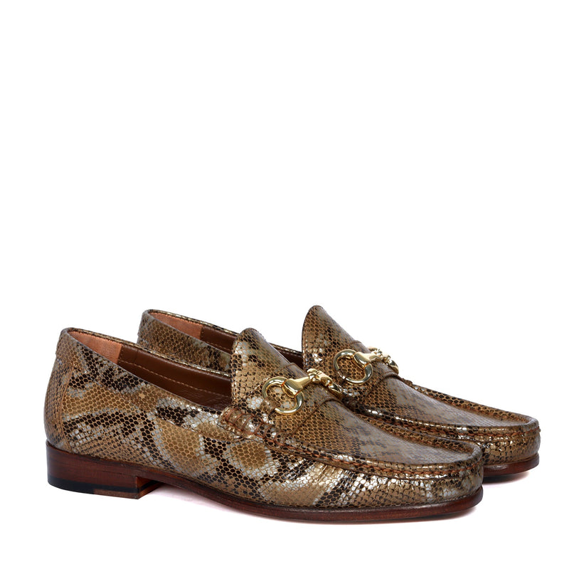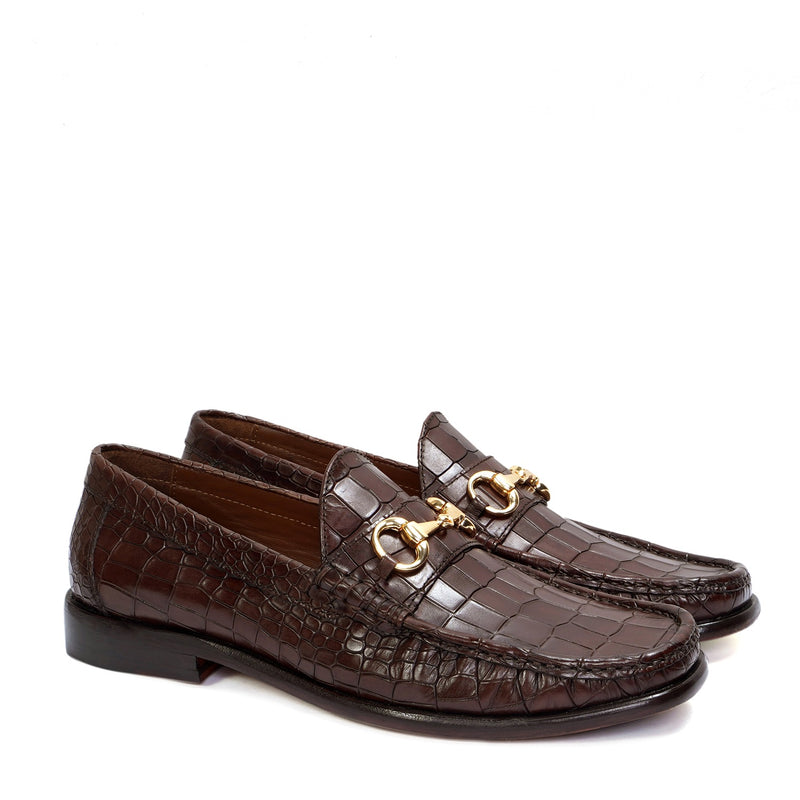 Tan Croco Texture Leather Loafers with Horse-Bit Buckle