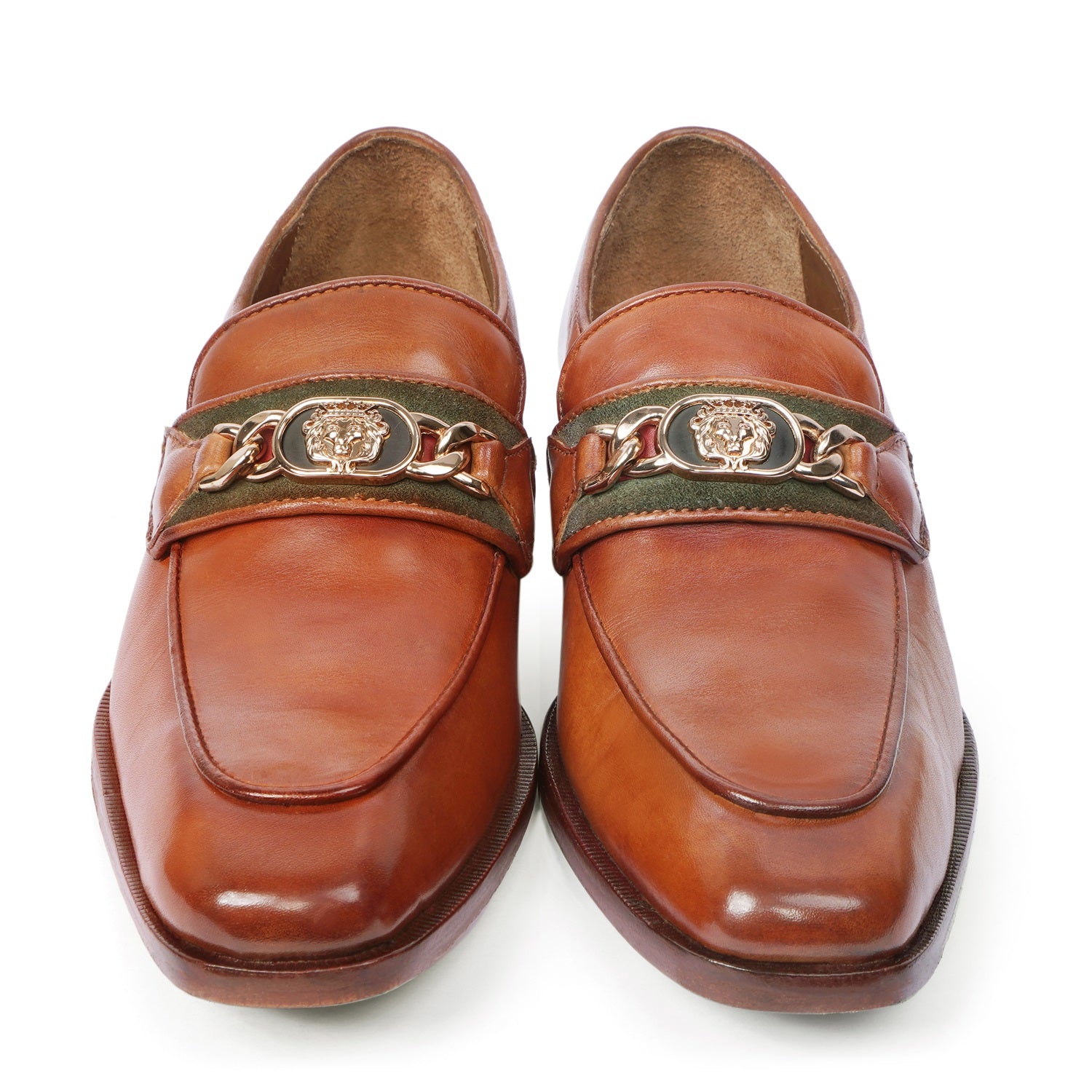 Tan Cuban Heel Leather Slip-On with Trademark Chain Logo