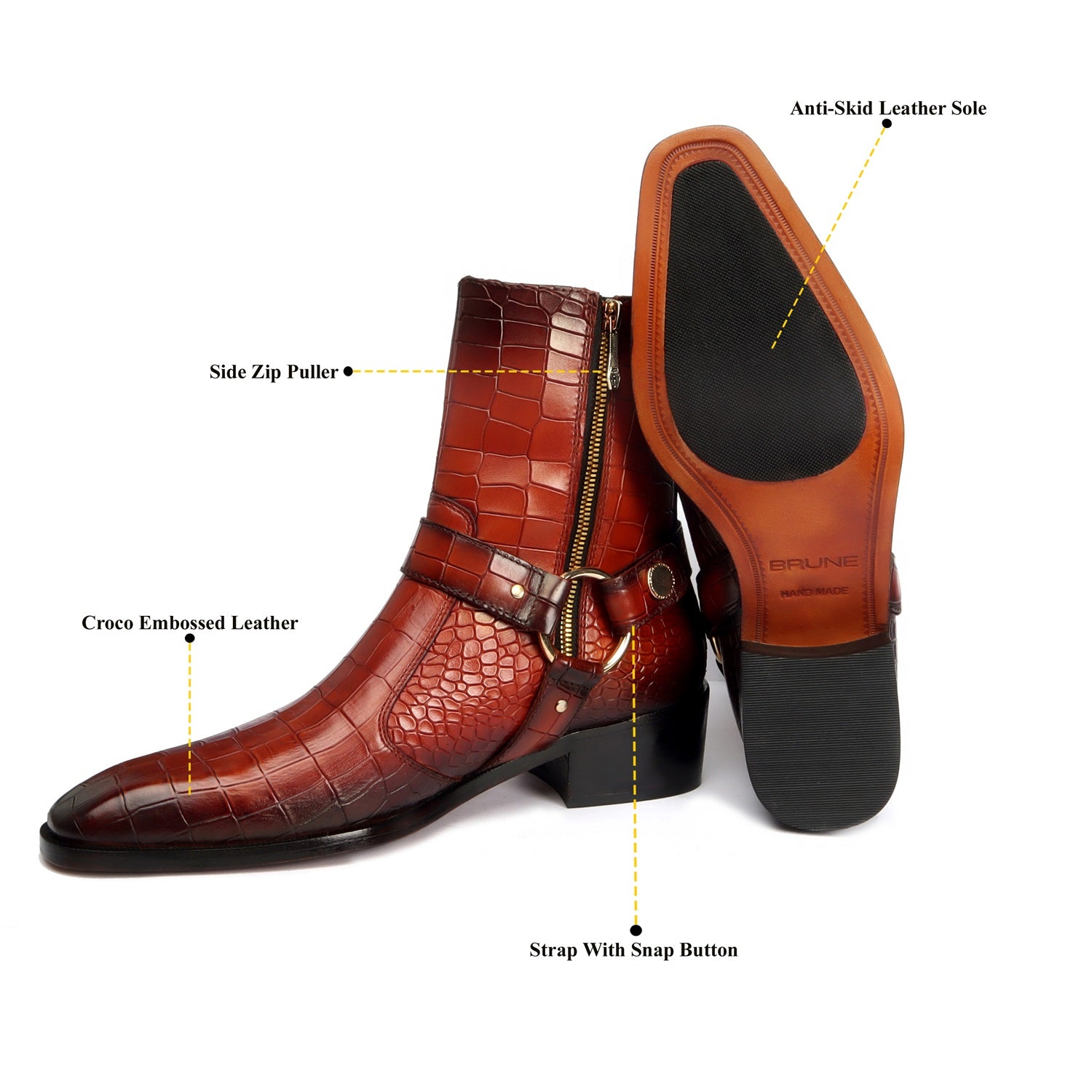 Ankle boot in leather are a dream come true for many a fashion-aware executives. We craft these Burnished Tan high ankle leather boots to give you an elite look. The greater detailing of the side zipper closure at the ankles lend a classy look to these deep cut croco textured leather boots. Fixed Stylish buckles Straps around the ankle take care of the appropriate fit and comfort. These deep cut croco print genuine leather ankle-length shoes are fitted to emphasize the size and shape of your feet to perfection. These boots provide the distinct and sassy look. They are easy to team with formal trousers as they blend well with the classic fabrics as well as the modern blended synthetic fabric pants, slacks and trousers. The leather sole and Cuban heel adds the extra elegance to it. You can customize this chic boots in any of your favorite color with our bespoke services.