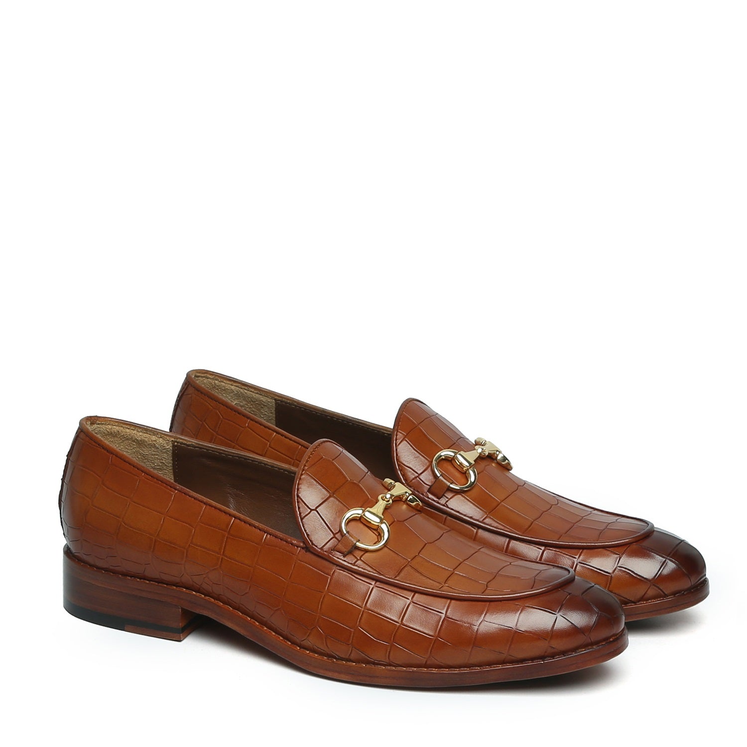 Make your everyday special with these classy men's loafers. It is the best shoe category for any men's closet. Loafers remain favorite style of shoes, as they are convenient to use and spell minimum fuss. Tan Deep Cut Croco Leather shoe looks lavishing with metal horse-bit on it. And when they are made of exemplary fitting and finish as that of the brand Brune & Bareskin, you can be sure that the shoes are nothing short of excellence. These tan leather shoes, with perfectly round apron toe design have a very rich appearance. This is a must have pair in your footwear collection.