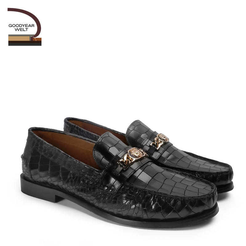 Tan Deep Cut Croco Moccasin Goodyear Welted Sole Loafer with Chain Embellishment Trademark Lion Logo
