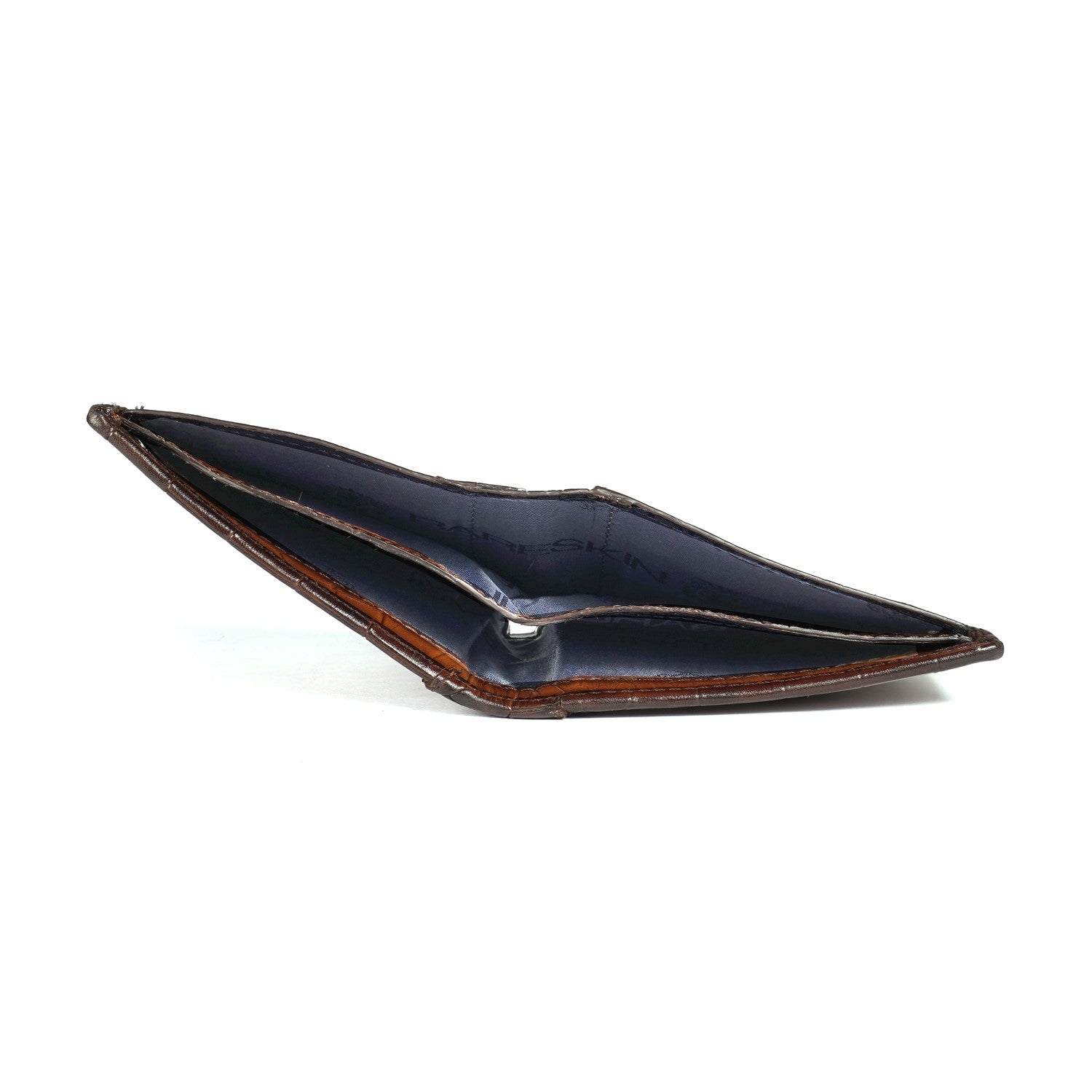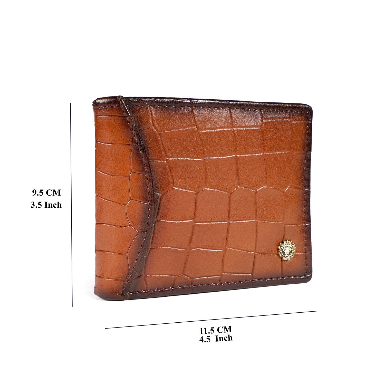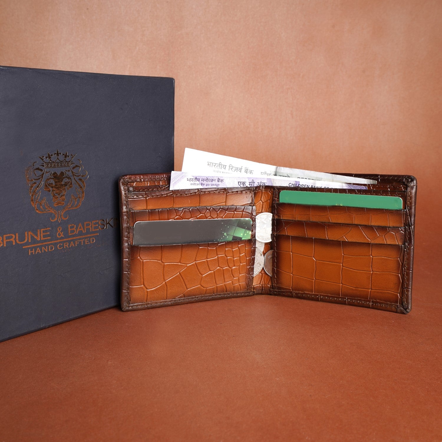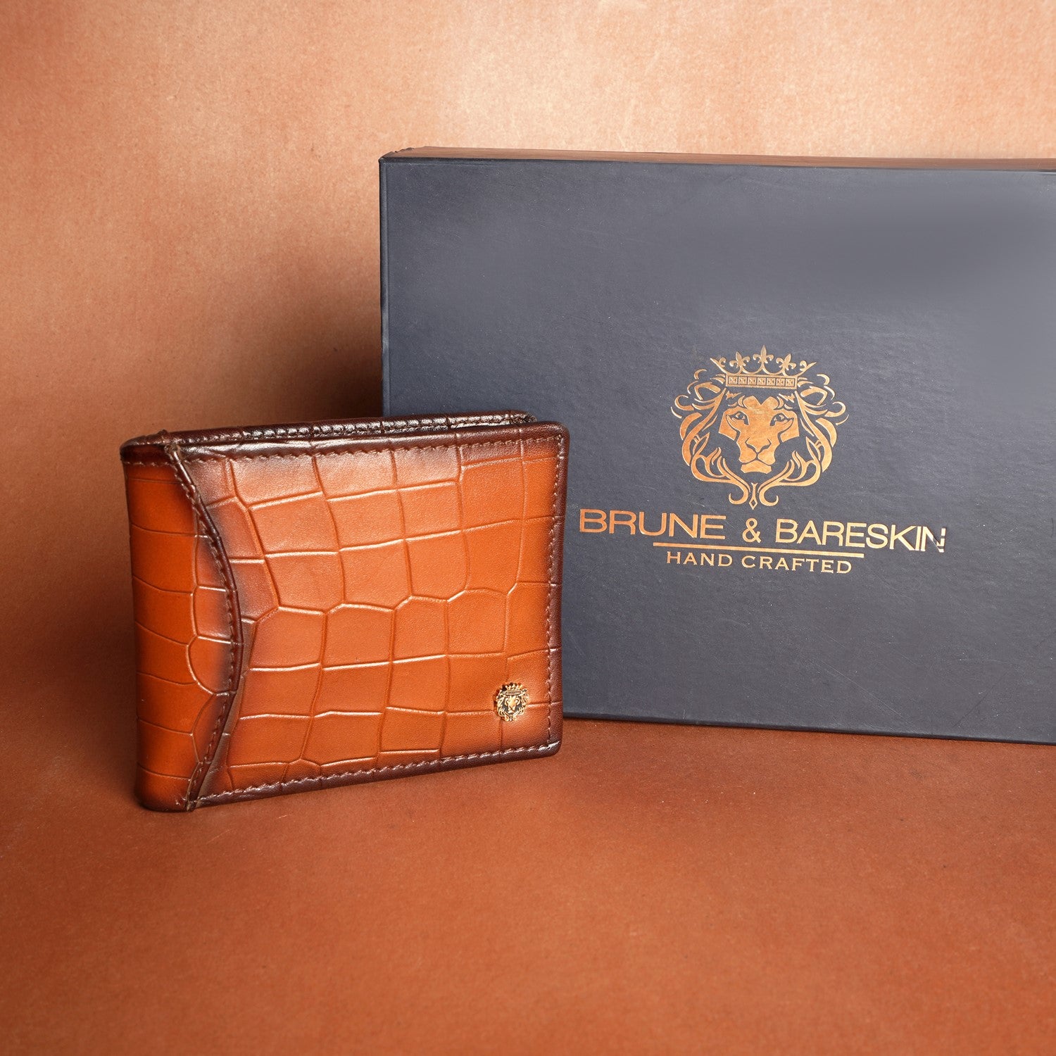 This bi-fold Tan Croco print leather wallet with darker smudged edges looks very elegant. The Brune & Bareskin signature metal Lion brand logo increases the style quotient. Bi-fold opening wallet features two main pockets along with small secure pocket on both sides. It has the total of 10 pockets, which makes it a perfect buy for today's generation. It provides the style and storage with artistic Patina regime leather color shades. You can get your name initials on wallet with our bespoke services.
