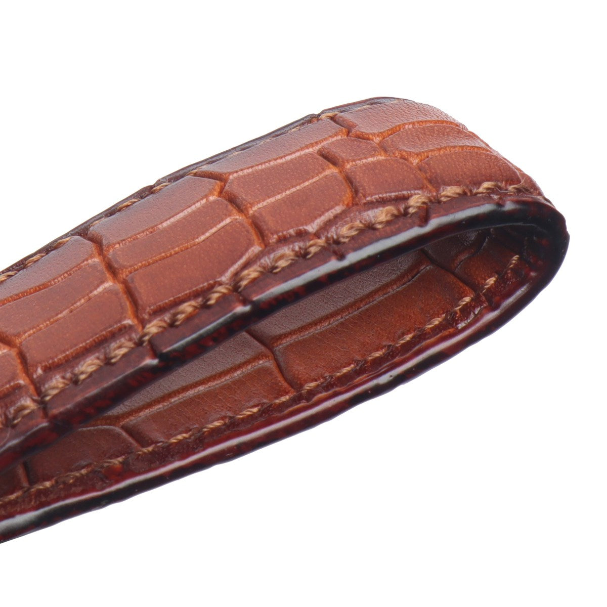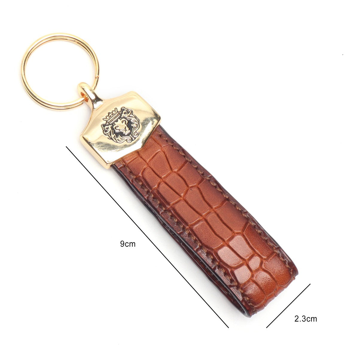 This elegant Croco print leather keychain is a stylish travel accessory. The tan color deep cut leather provides a very chic look. The gold finish fittings complement its overall color. Brune & Bareskin signature lion logo on the center looks very elegant. You can also get it customized especially for you with your name initials and favorite color.