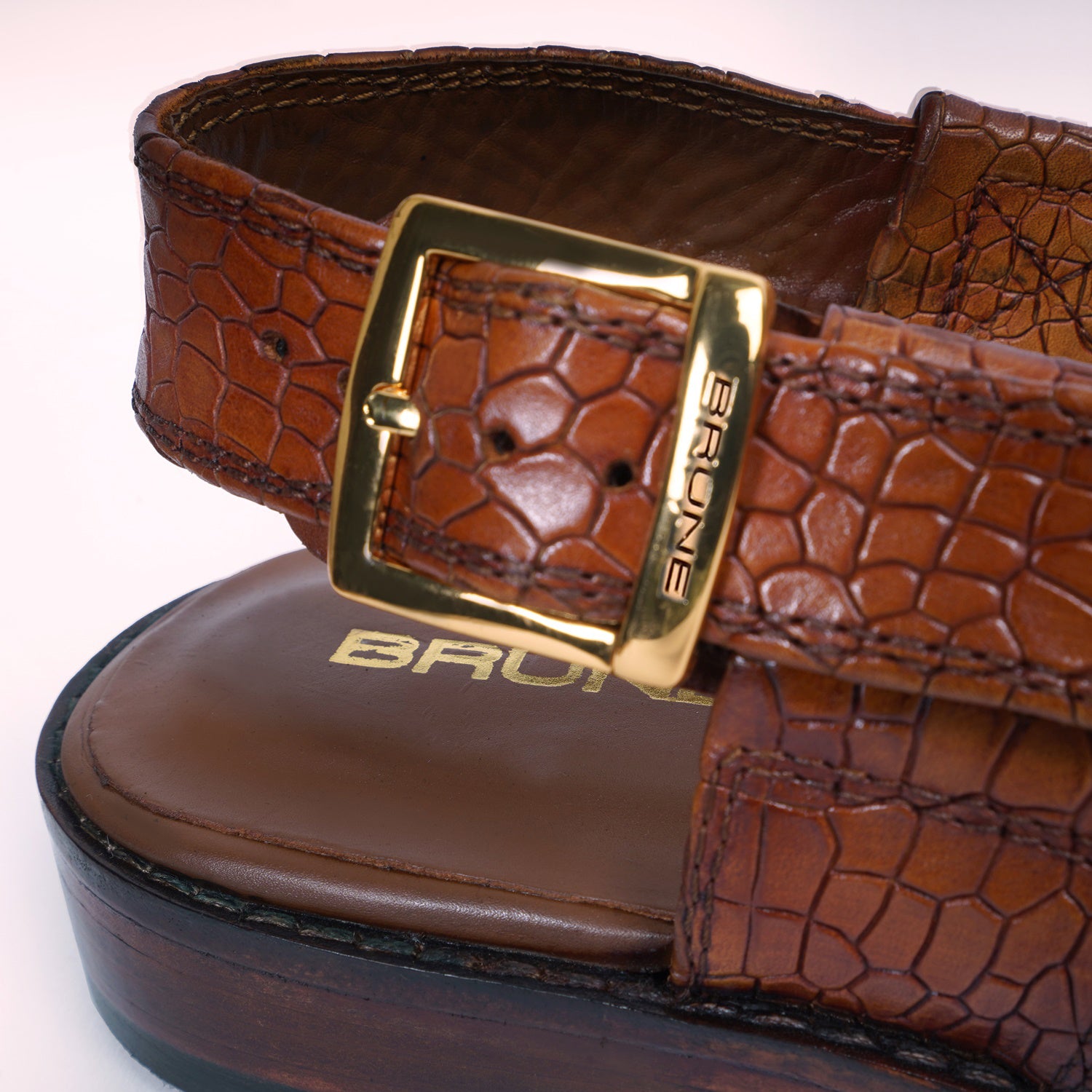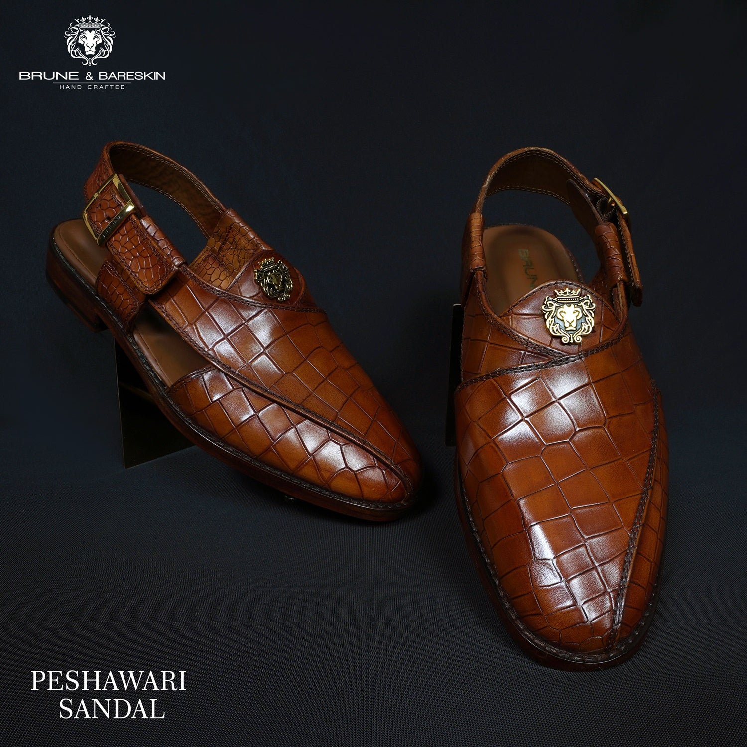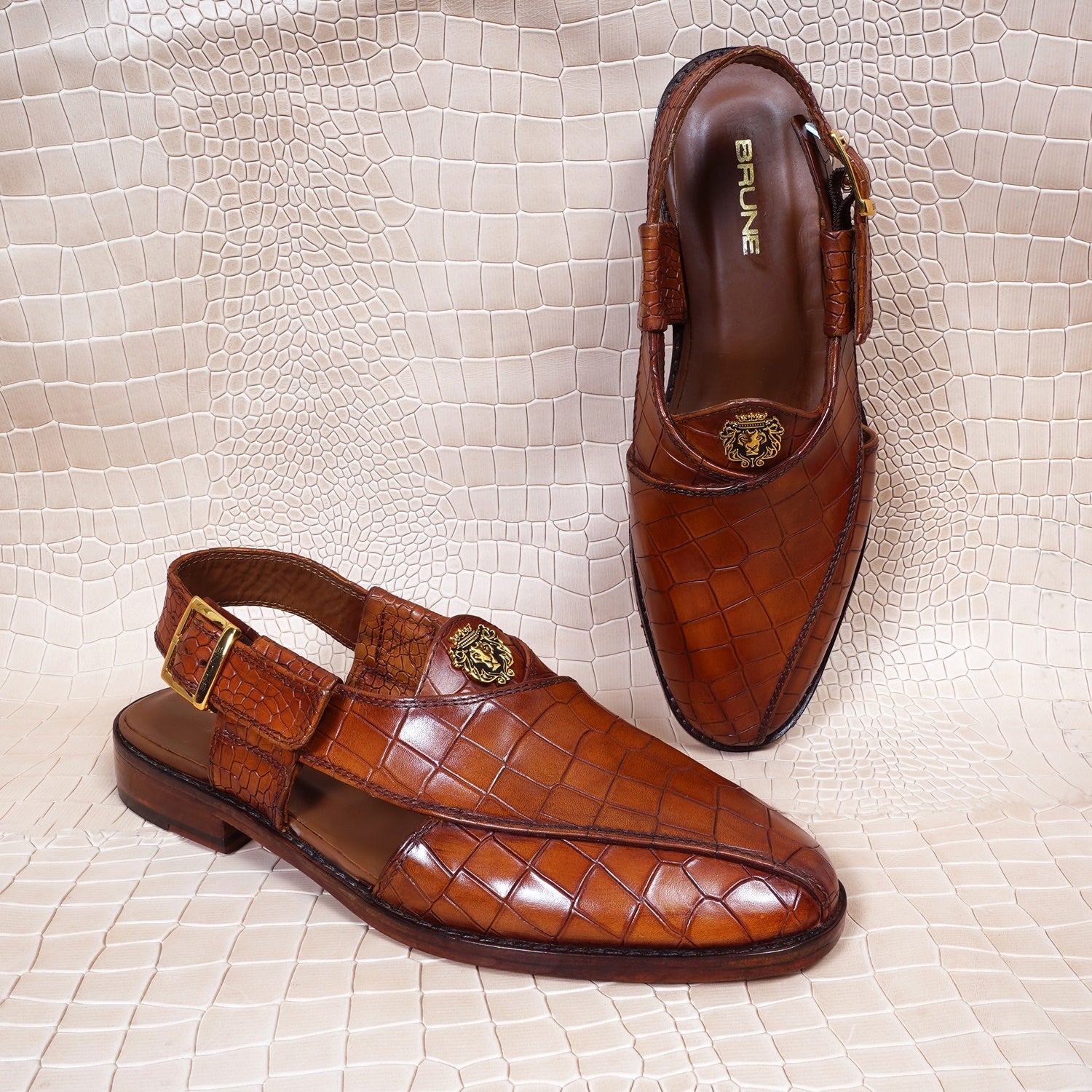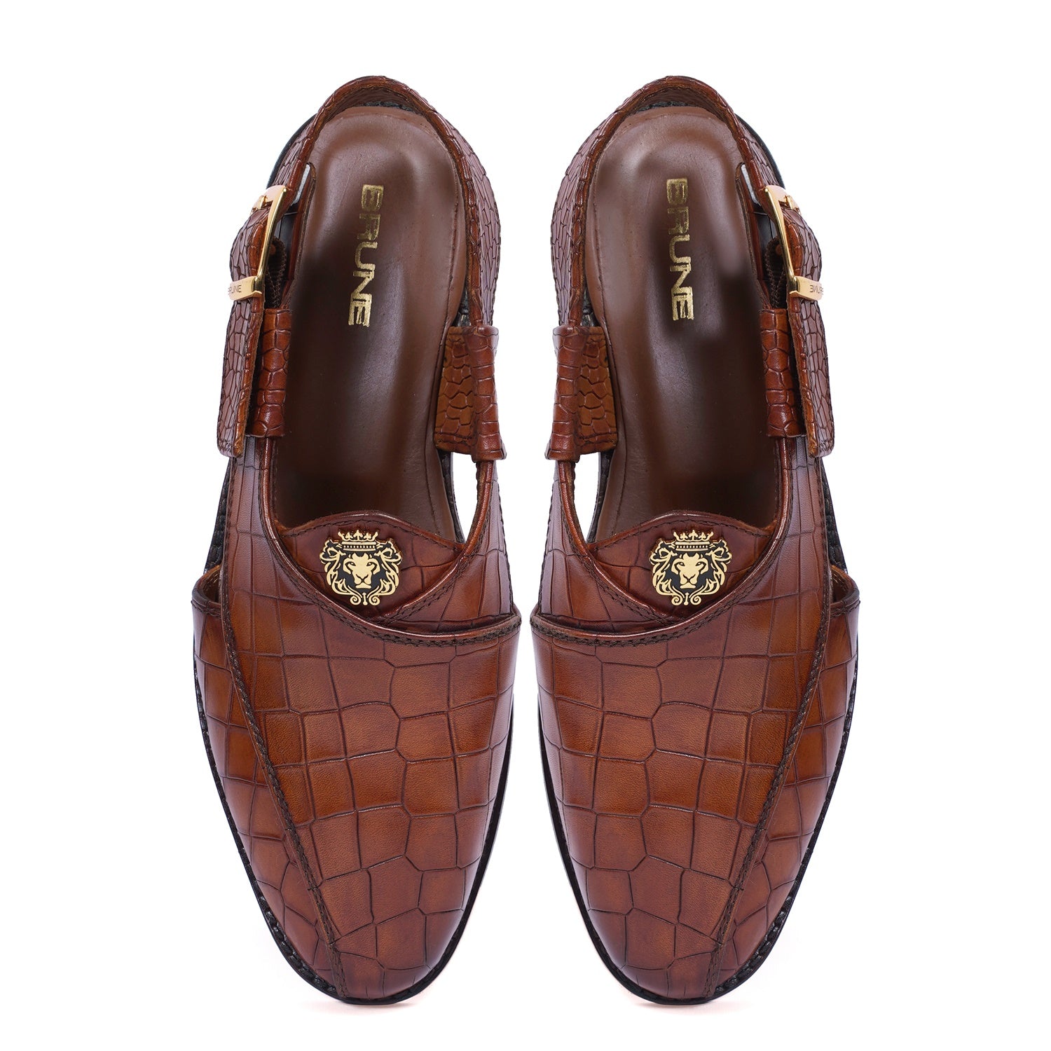 These Branded Sandals are precisely crafted with quality and the latest trends in mind. Discover the beauty of traditional design in these Tan Deep Cut Peshawari Sandals from Brune & Bareskin. Crafted from croco textured Leather and featuring an eye catching cross strap design, these stylish sandals are perfect for daily-wear. Ankle strap is attached along with golden buckle to wear it at your comfort level & size. The Brune & Bareskin signature golden finish lion brand logo increases the style quotient further. Gives you a marvelous look to team up with any casual or ethnic wear.