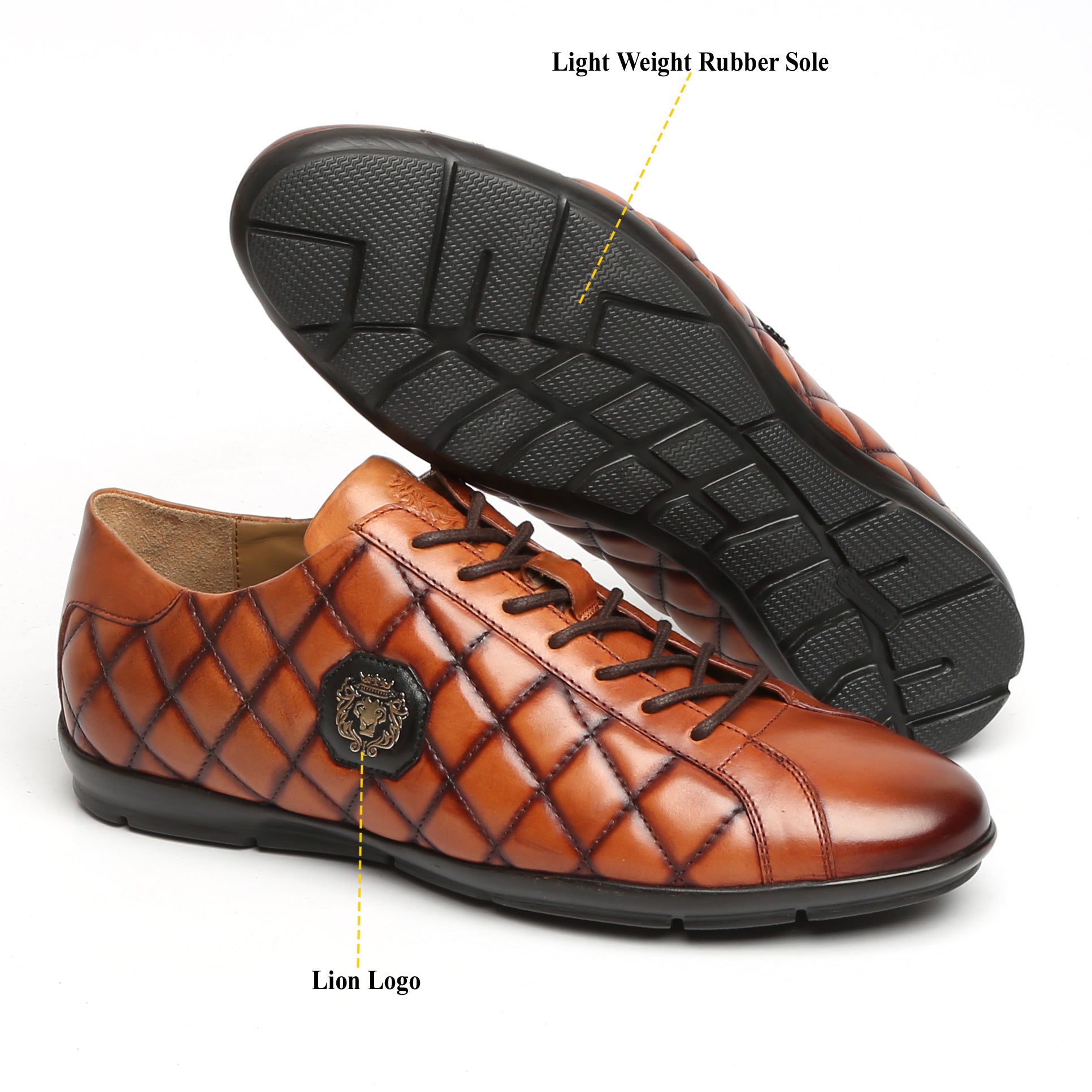 Look sporty and smart by wearing these Brune & Bareskin Tan Leather Diamond Stitched Sneakers Shoes. The metal BRUNE & BARESKIN Lion logo enhances its elegance. These Diamond Stitched sneakers have a 100% Genuine Leather upper which is crafted very precisely. Patterned Rubber Sole provided the all-day long wearability. Team these shoes with casual attires of your choice to look astonishing.
