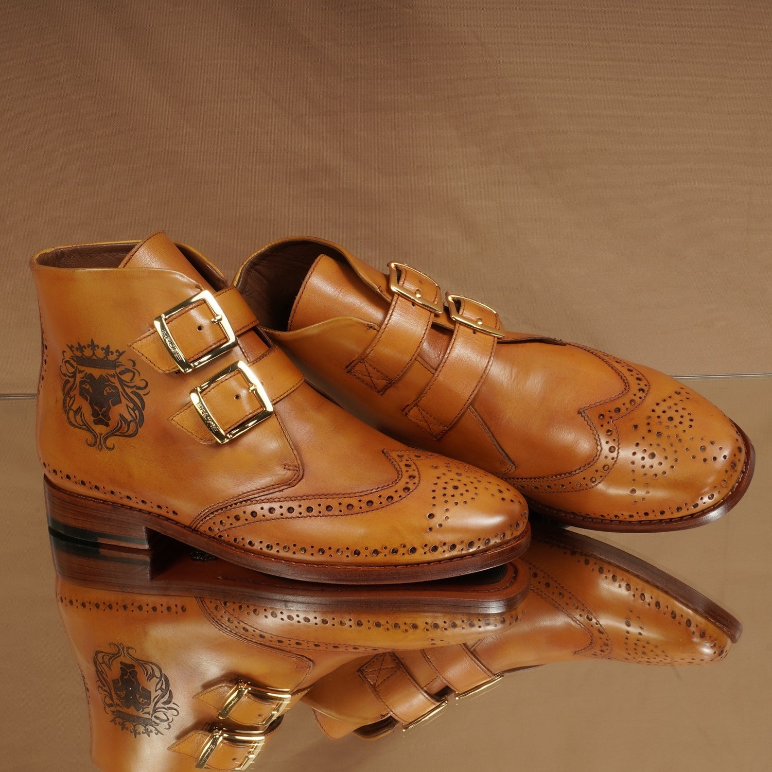 Tan Double Monk Strap Lion Detailing Leather Boots by Brune & Bareskin