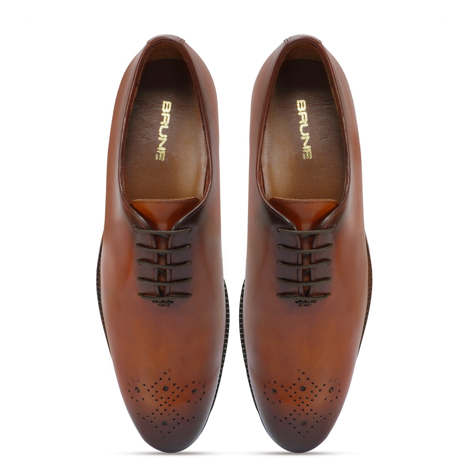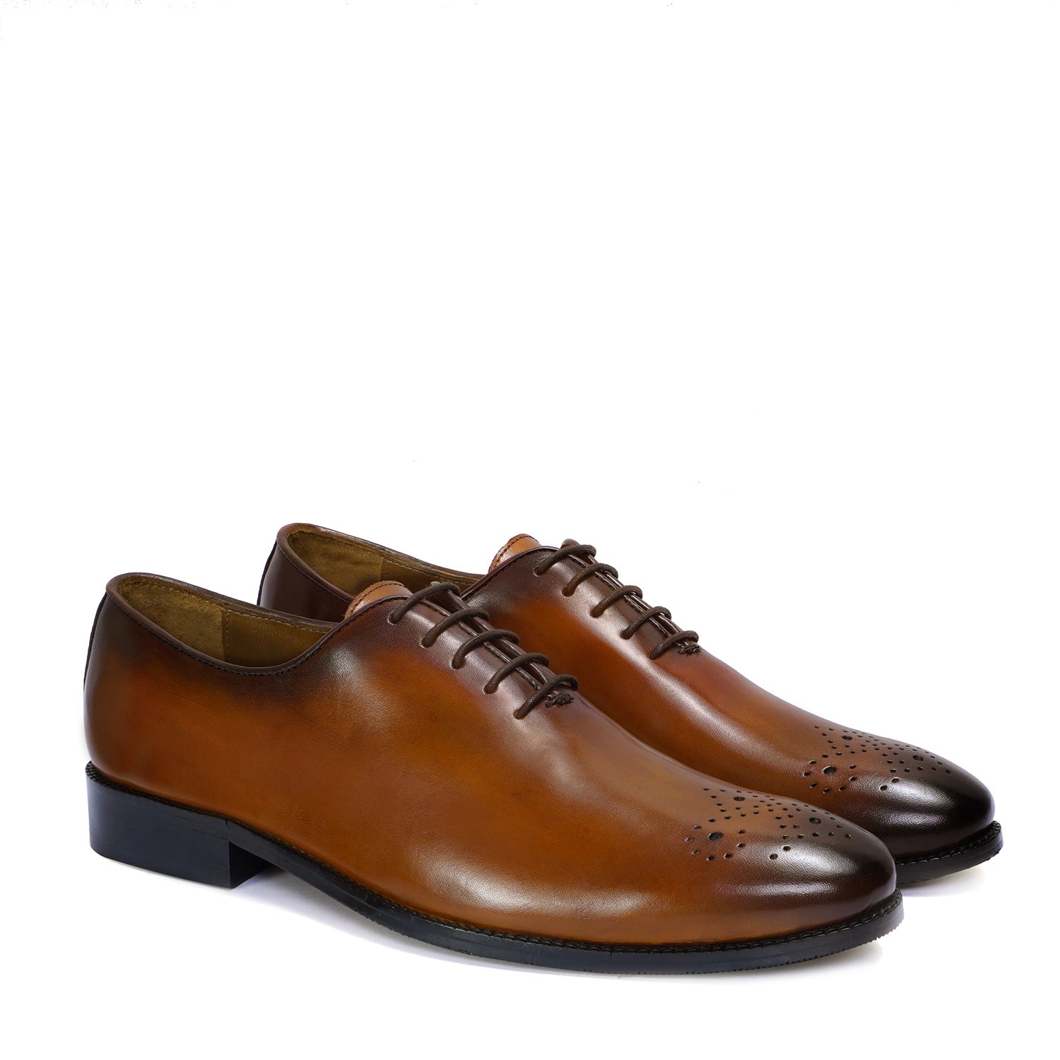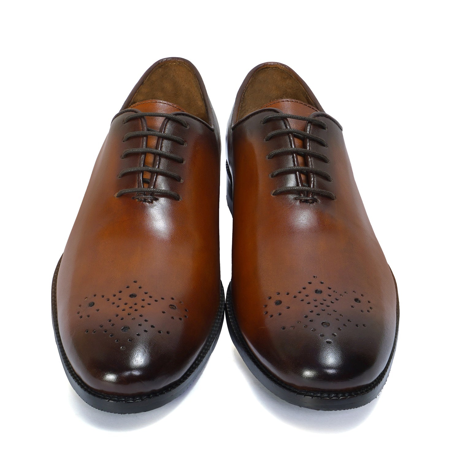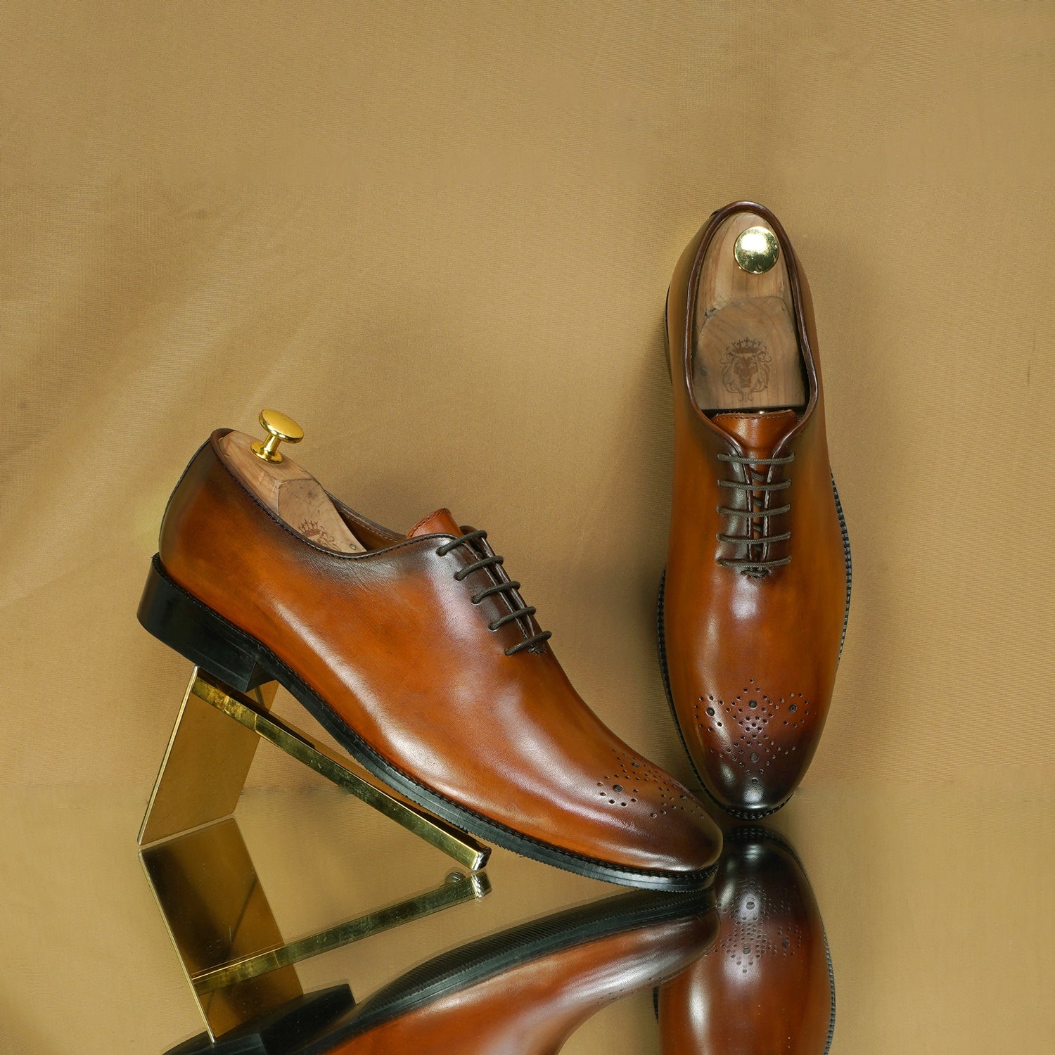Tan Leather Oxford Lace-Up Shoes Whole Cut/One Piece Medallion Toe
