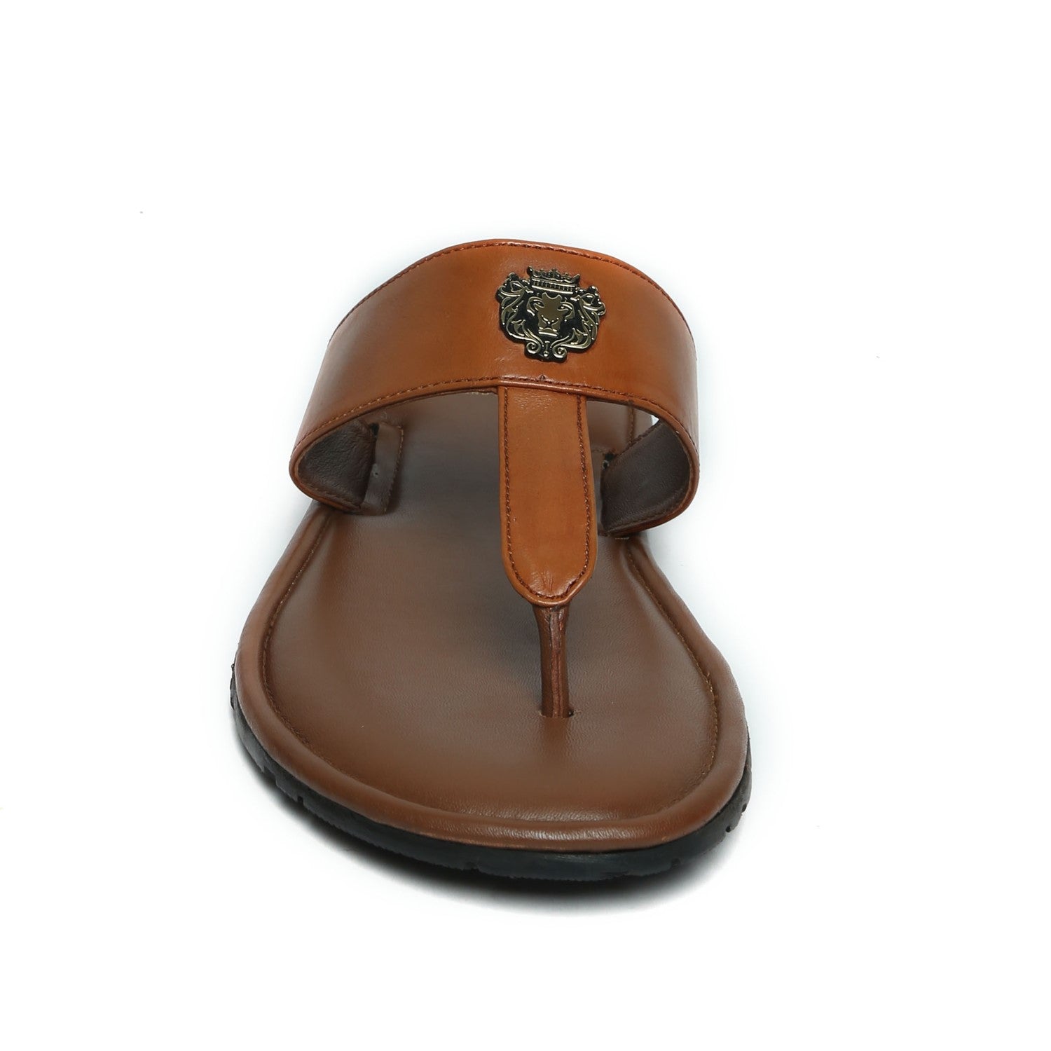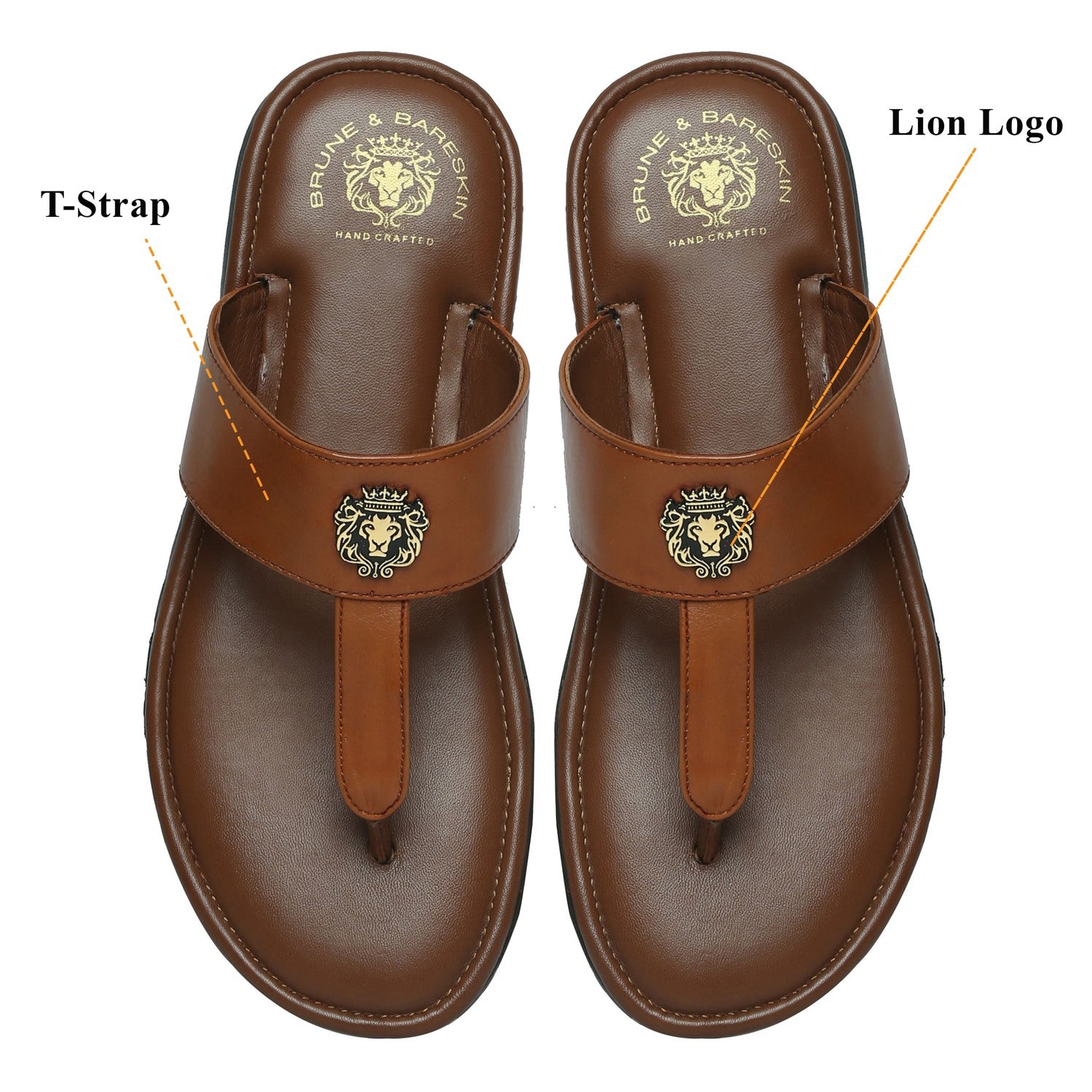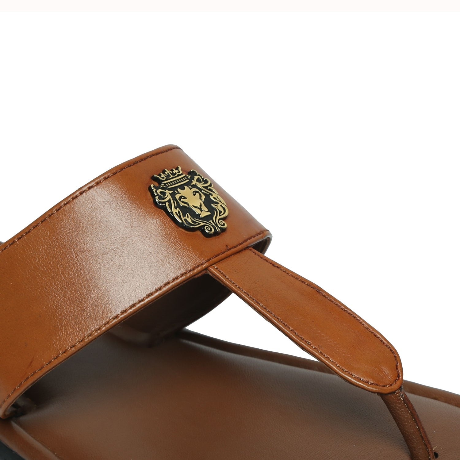 These Tan Leather slippers with a metal lion logo are designed to give complete comfort and style to the feet in this season. Tan Upper Genuine Leather strap with contrasting golden lion logo provides vogue and ruggedness at the same time. The super-soft base gives you all-day comfort. They are a good pick to wear with casuals and ethnicities.