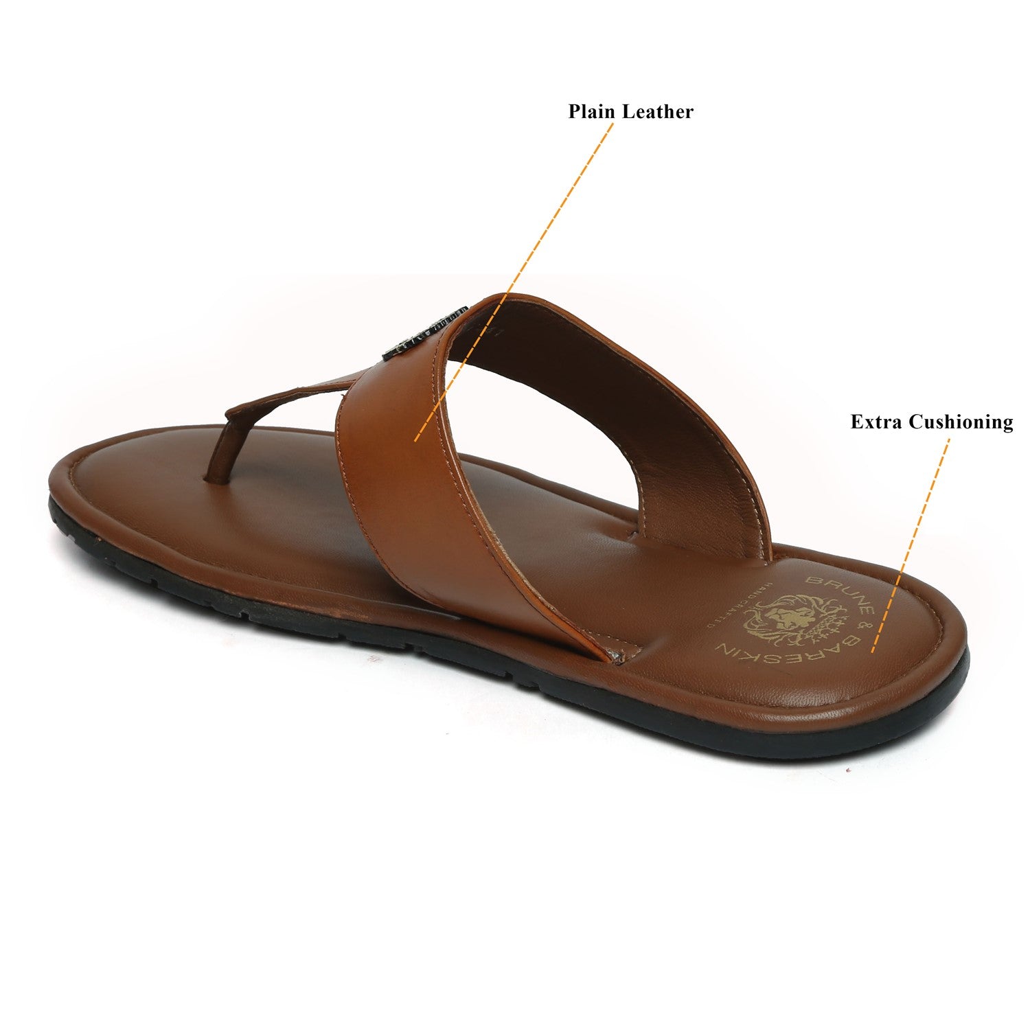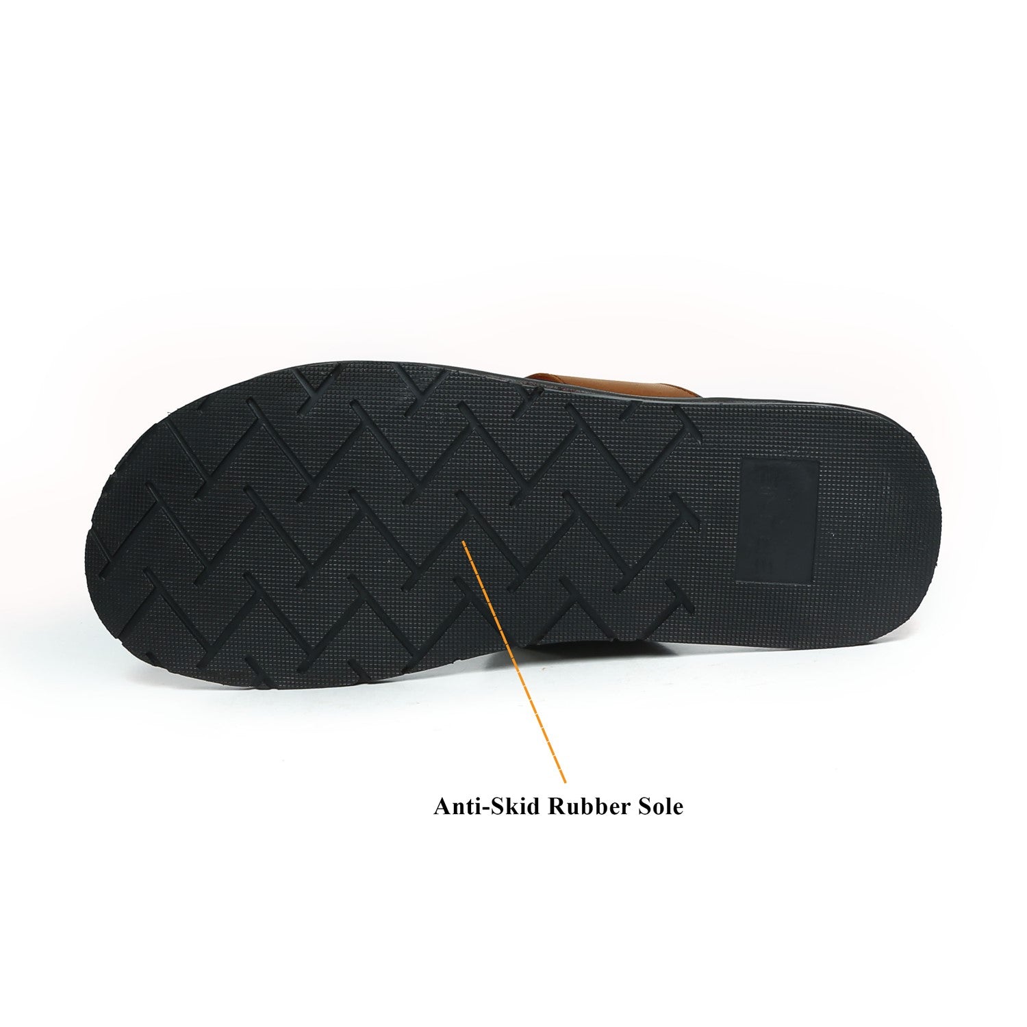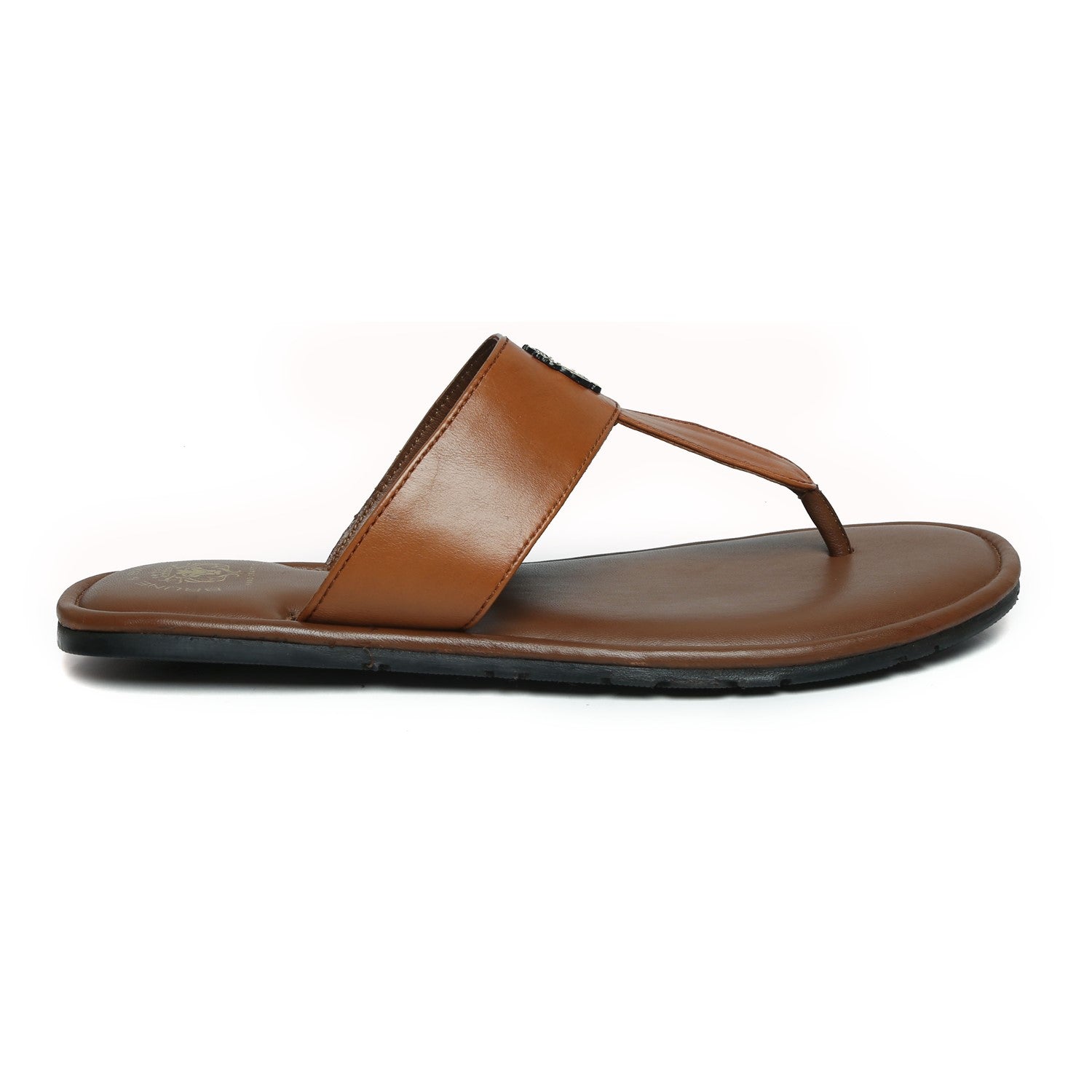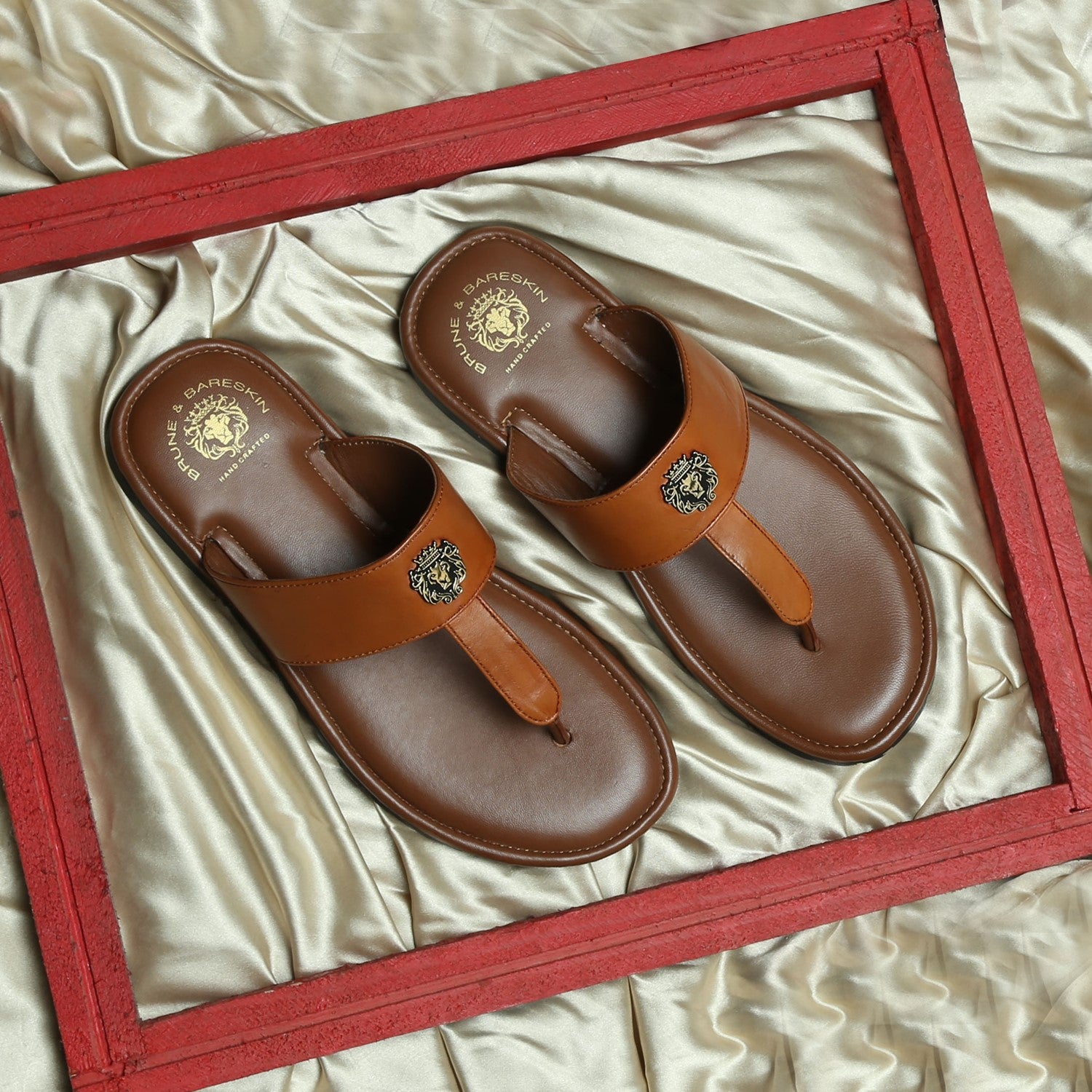 These Tan Leather slippers with a metal lion logo are designed to give complete comfort and style to the feet in this season. Tan Upper Genuine Leather strap with contrasting golden lion logo provides vogue and ruggedness at the same time. The super-soft base gives you all-day comfort. They are a good pick to wear with casuals and ethnicities.