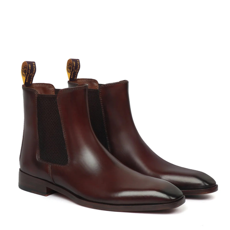 This high-ankle length tan leather boots can be customized to your liking. Tips of these pointed leather shoes enhance the style statement. The deep detailing with leather sole and the side elastic closure lend a classy look to these leather formal shoes. Wear it and make a rememberable mark of fashion.
