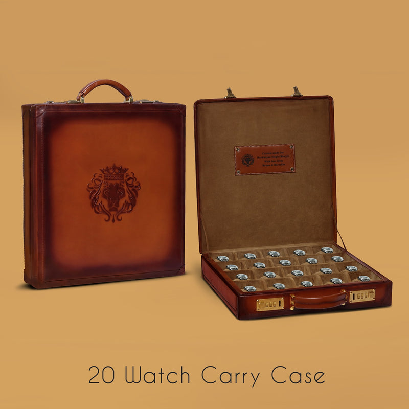 This wrist watch carry briefcase provides the ample space to carry your watches with security and style. The genuine leather made ensures the longevity of this carry case. The perfect blend of outer hard casing and the internal suede leather lining provides protection while travelling. The Number lock mechanism add an extra layer of security to it. You can carry 12 watches in it. You can get it made in any color you want along with your logo & name initials with our bespoke services. It is one of the most sophisticated & luxurious watch accessory you can buy in genuine leather.