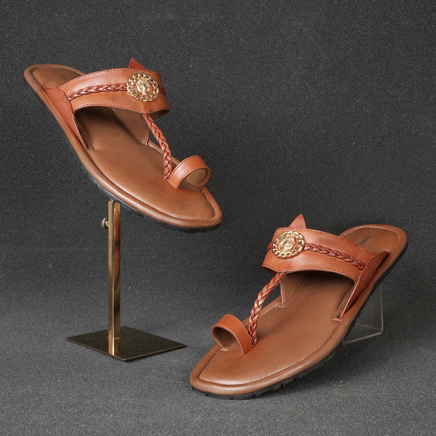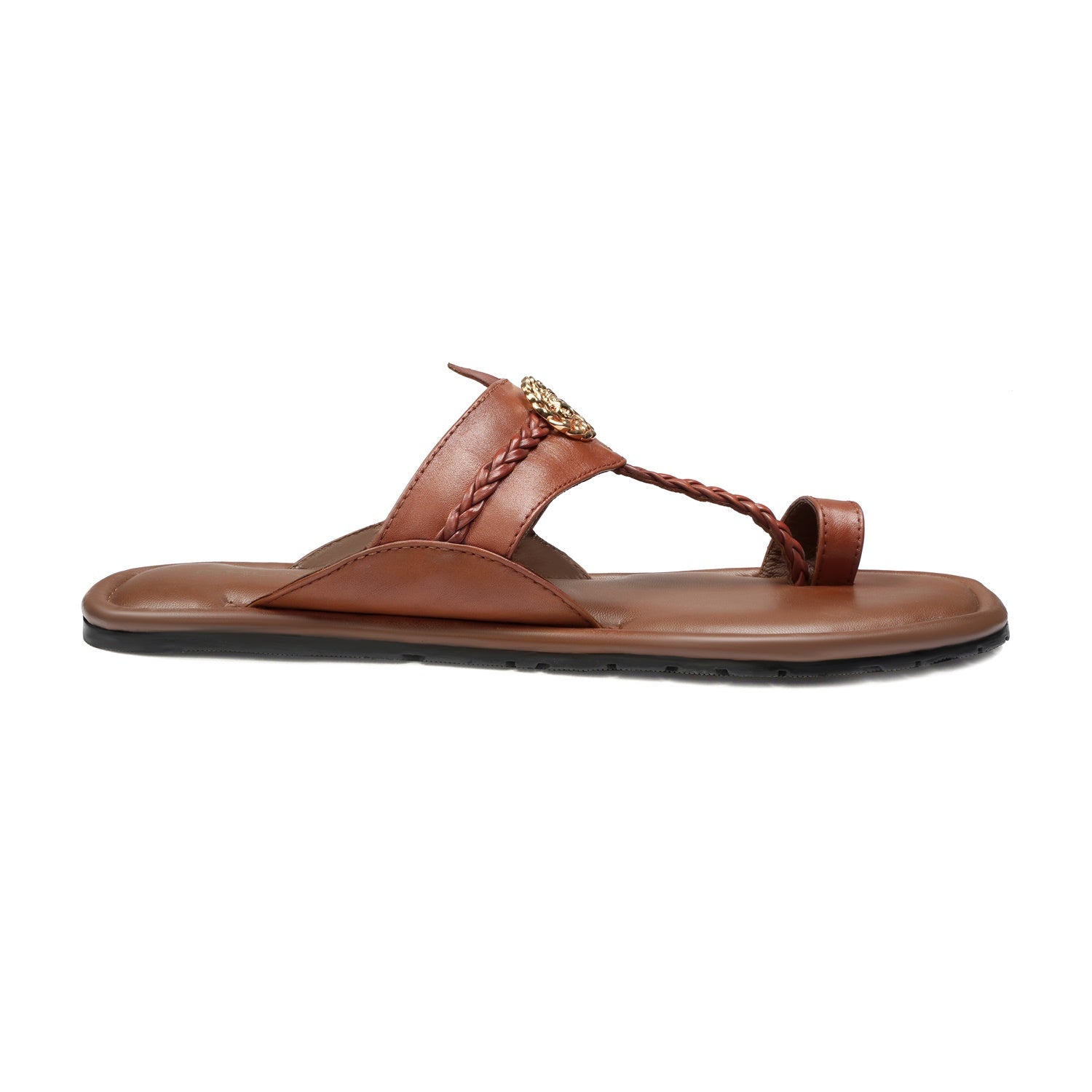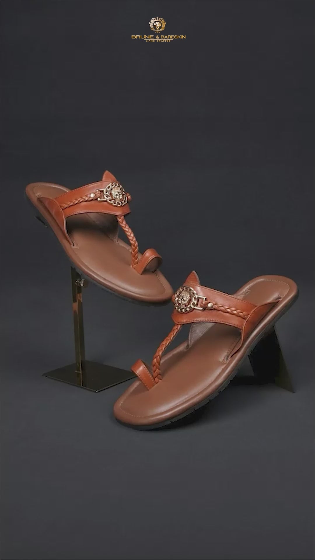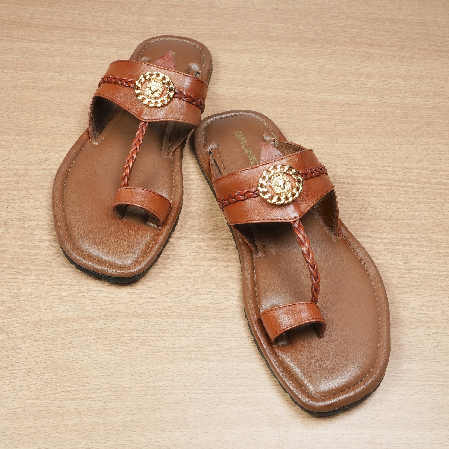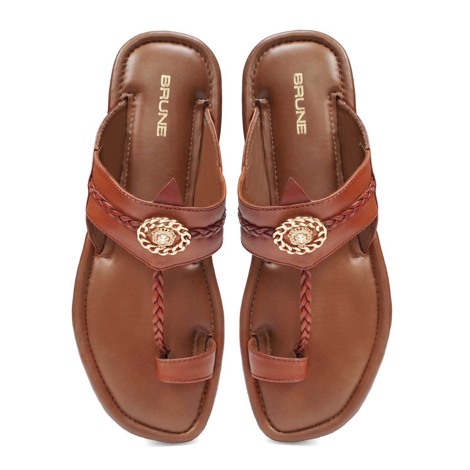 Introducing the Tan Kolhapuri Slipper - a premium quality, handcrafted ethnic slipper perfect for men. With a comfortable and stylish round toe design and genuine leather construction, these slippers are sure to be a favorite in your footwear collection. The gold finish metal lion buckle with chain embellishment on vamp adds a touch of elegance to the T-Bar weaved style strap. Trust Brune & Bareskin for superior craftsmanship and a super soft, anti-skid rubber sole.