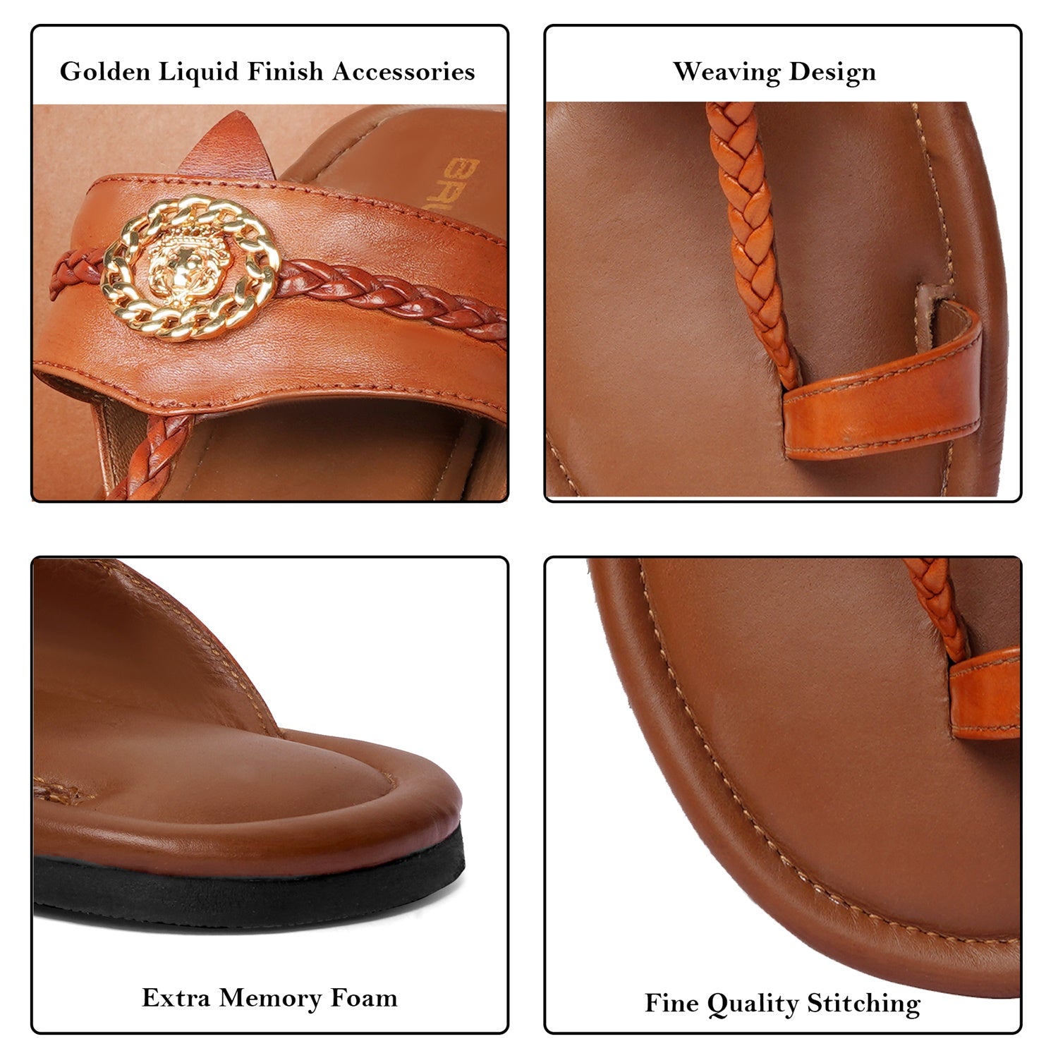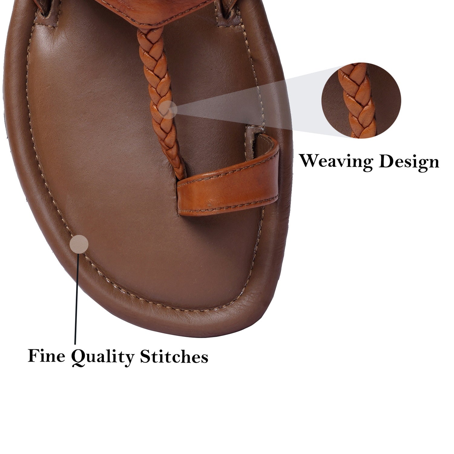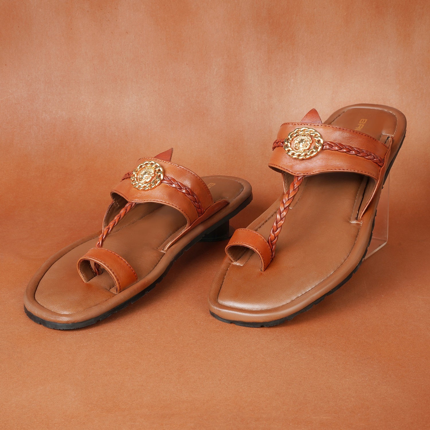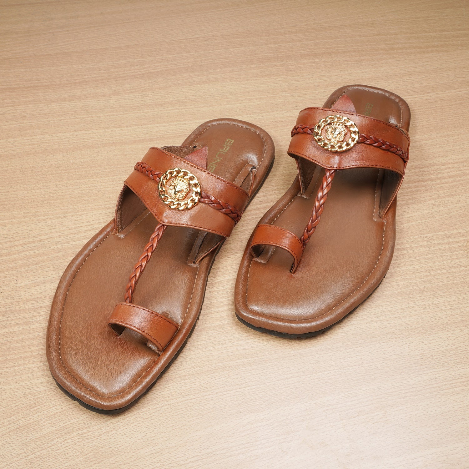 Introducing the Tan Kolhapuri Slipper - a premium quality, handcrafted ethnic slipper perfect for men. With a comfortable and stylish round toe design and genuine leather construction, these slippers are sure to be a favorite in your footwear collection. The gold finish metal lion buckle with chain embellishment on vamp adds a touch of elegance to the T-Bar weaved style strap. Trust Brune & Bareskin for superior craftsmanship and a super soft, anti-skid rubber sole.