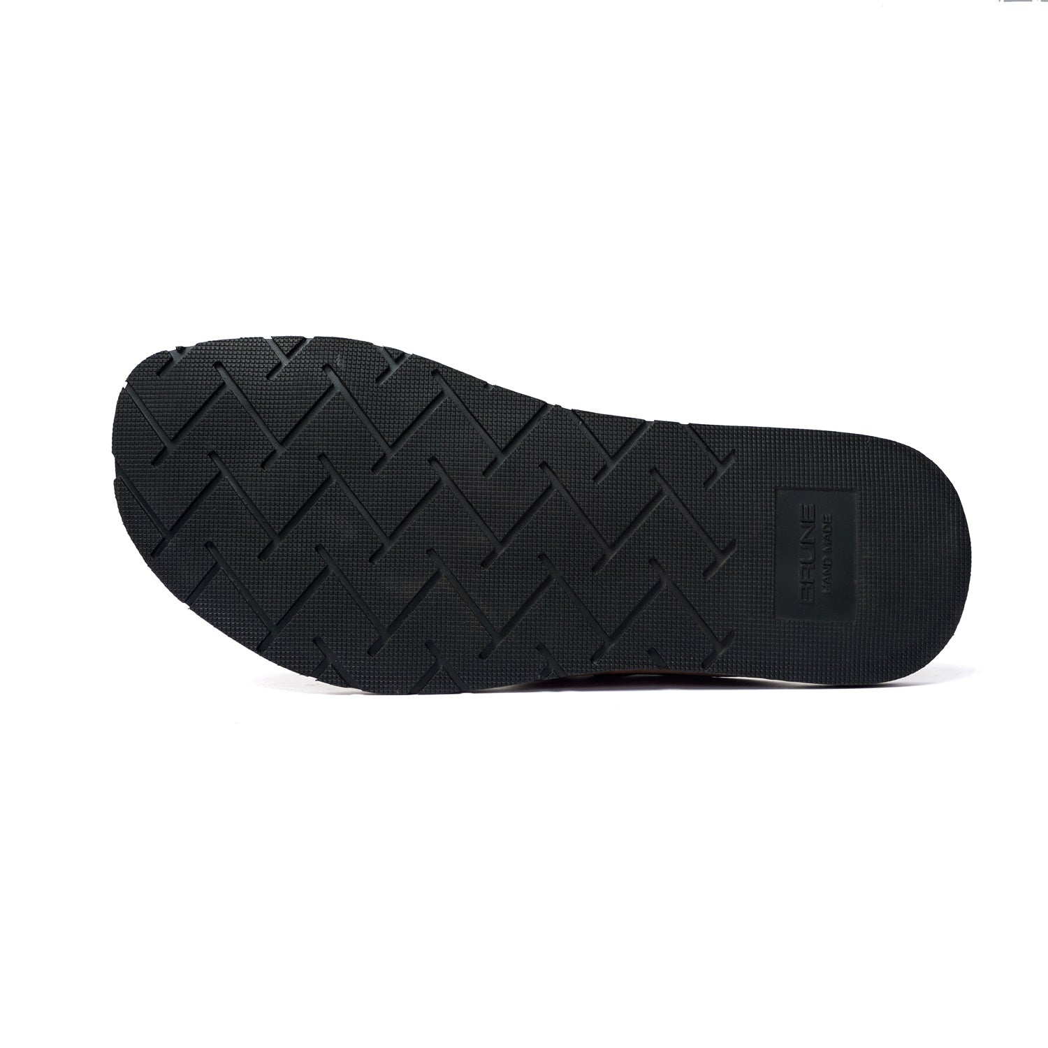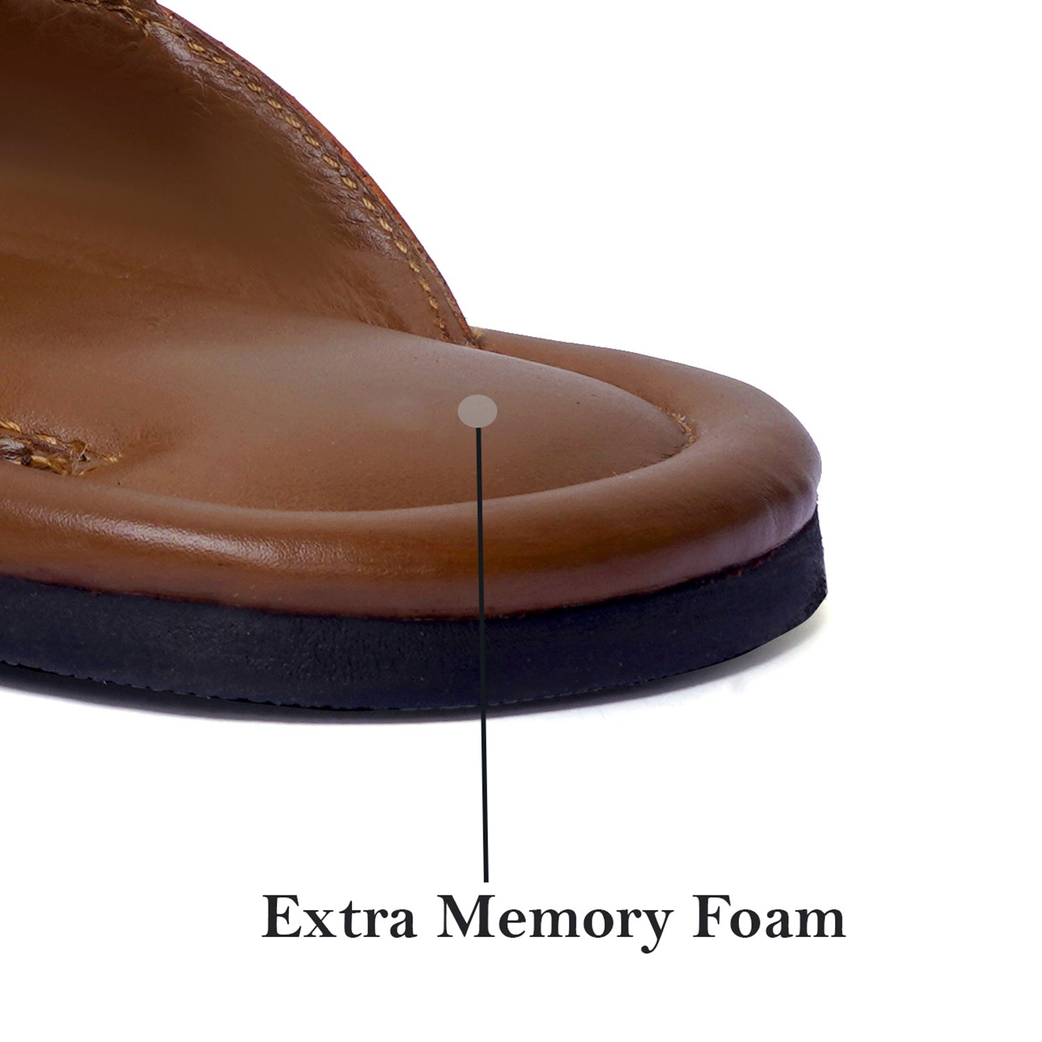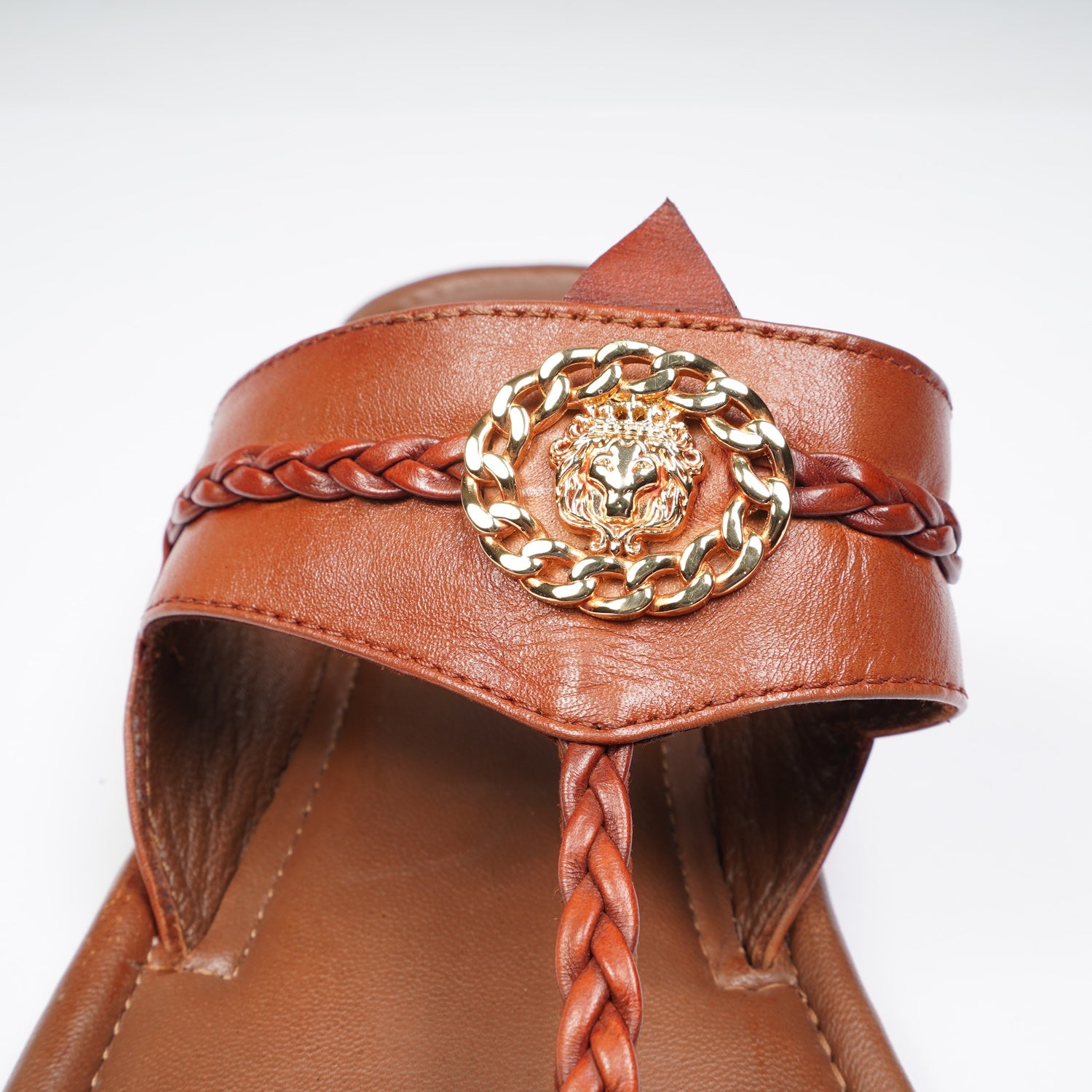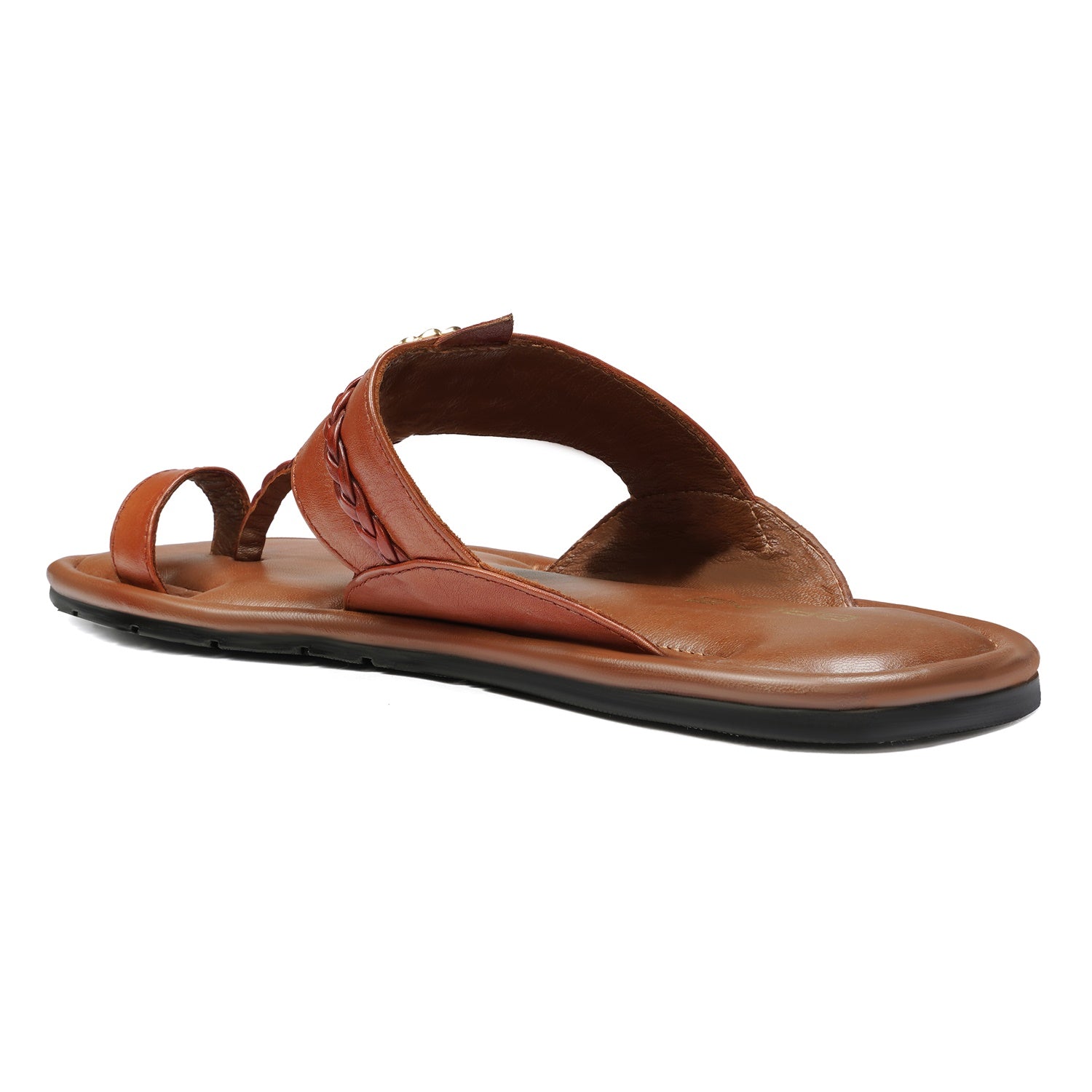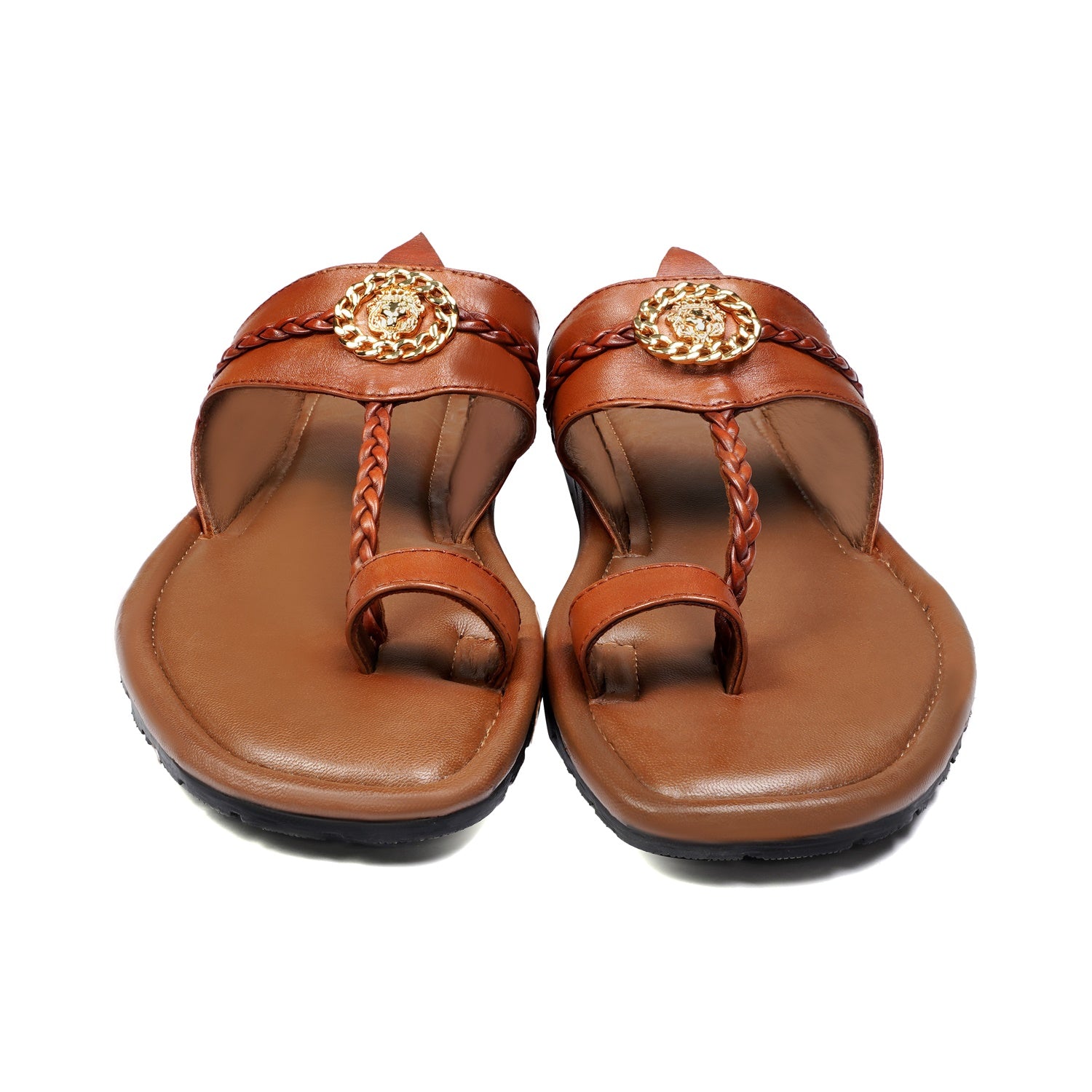 Introducing the Tan Kolhapuri Slipper - a premium quality, handcrafted ethnic slipper perfect for men. With a comfortable and stylish round toe design and genuine leather construction, these slippers are sure to be a favorite in your footwear collection. The gold finish metal lion buckle with chain embellishment on vamp adds a touch of elegance to the T-Bar weaved style strap. Trust Brune & Bareskin for superior craftsmanship and a super soft, anti-skid rubber sole.