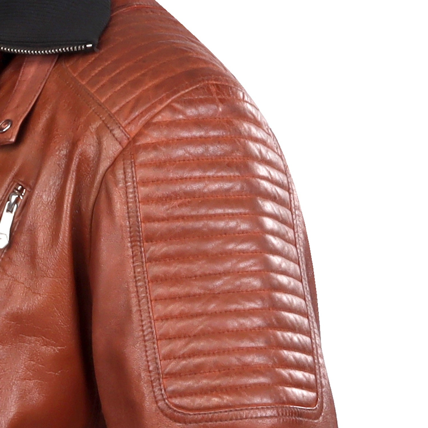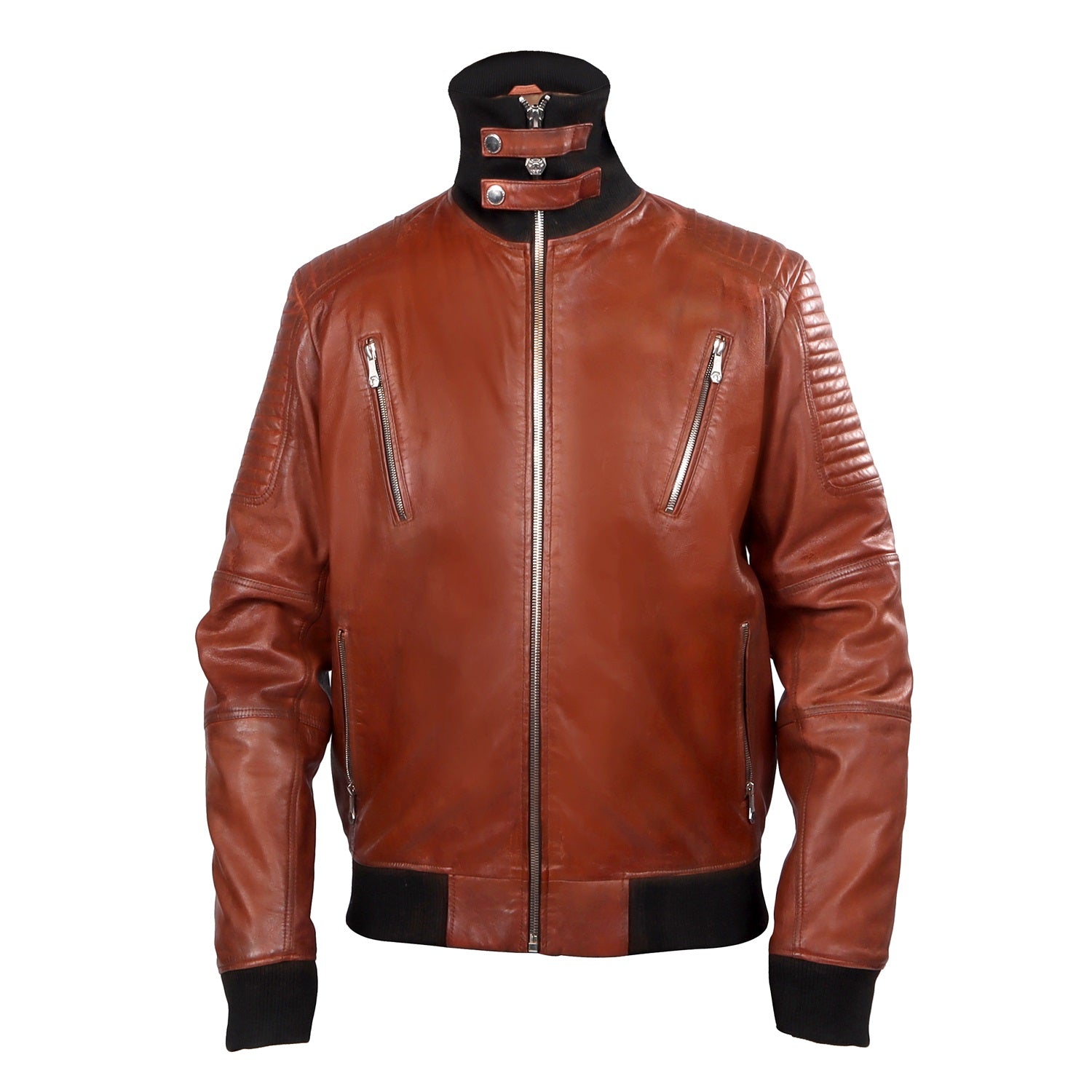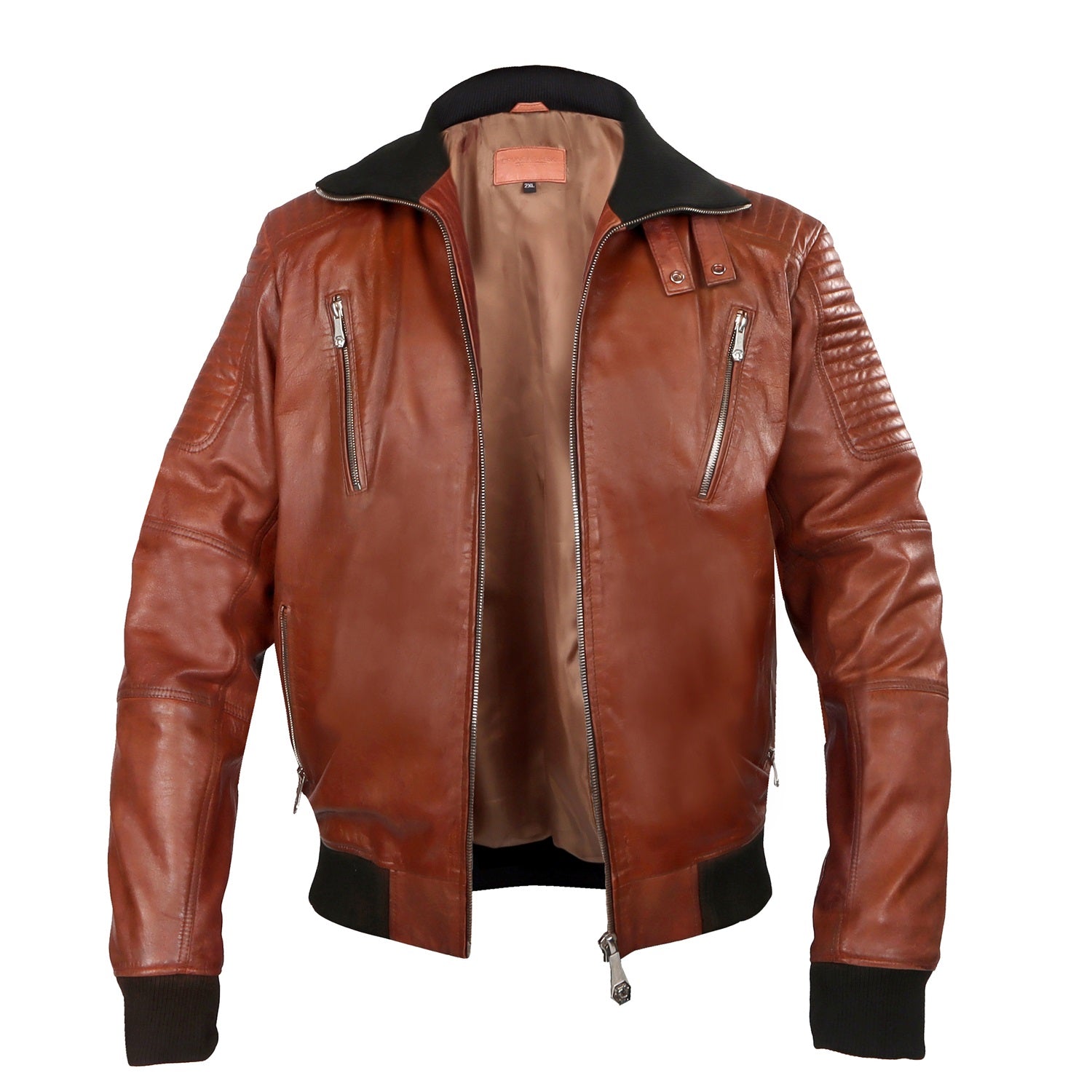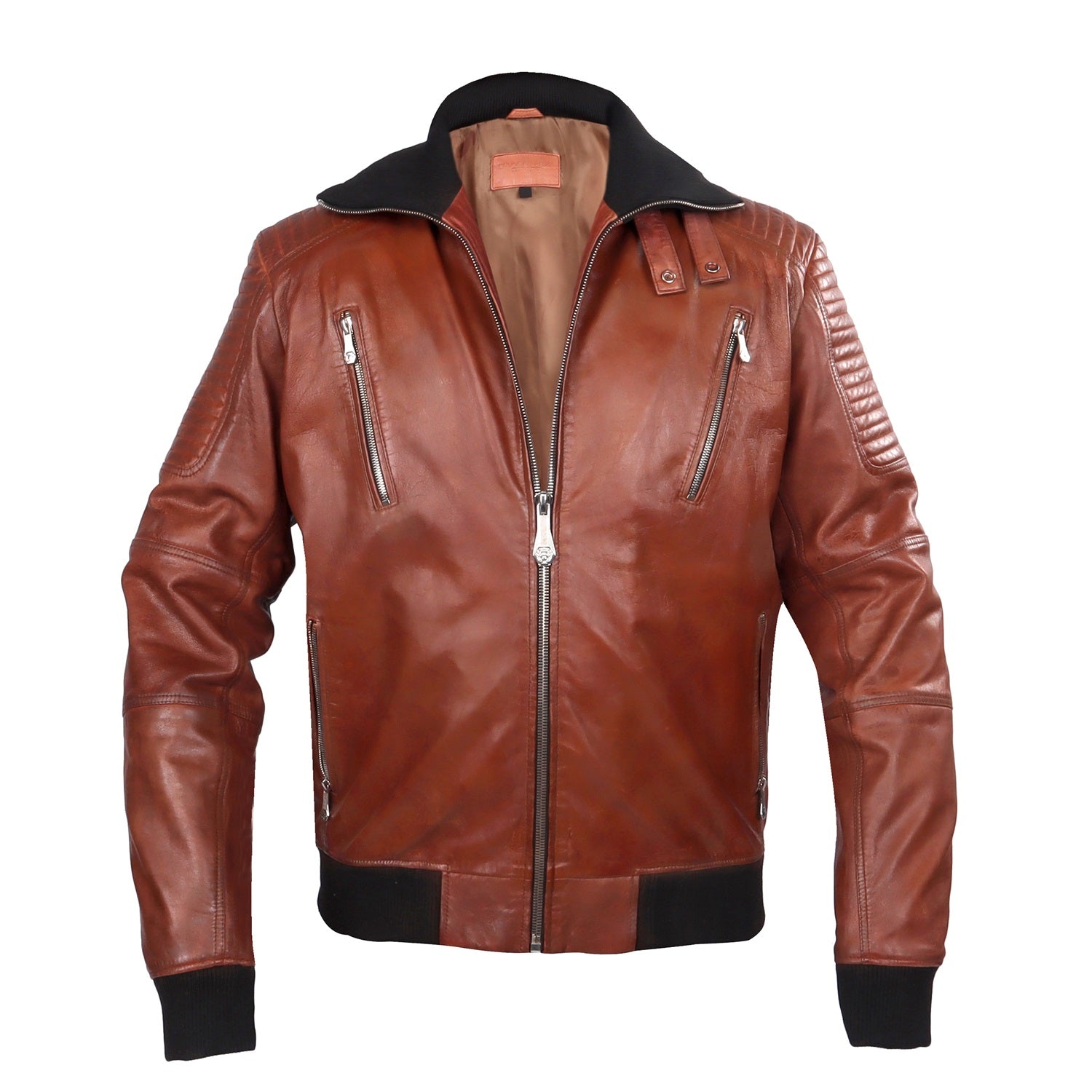 This Tan color leather jacket with black contrasting collar and bottom rib looks lavishing. The genuine leather in tan color looks very stylish with a classic accent tint. This jacket features a woven collar which looks very impressive in both the modes, laying and standing collar. This textured Brune & Bareskin full grain Italian Leather jacket is made to stay with you across generations. Wear it for work or any other occasion when you need to step up your look. This Jacket is such a dress to impress product. All our Brune & Bareskin brand Jackets have an ageless attitude and a modern fit.