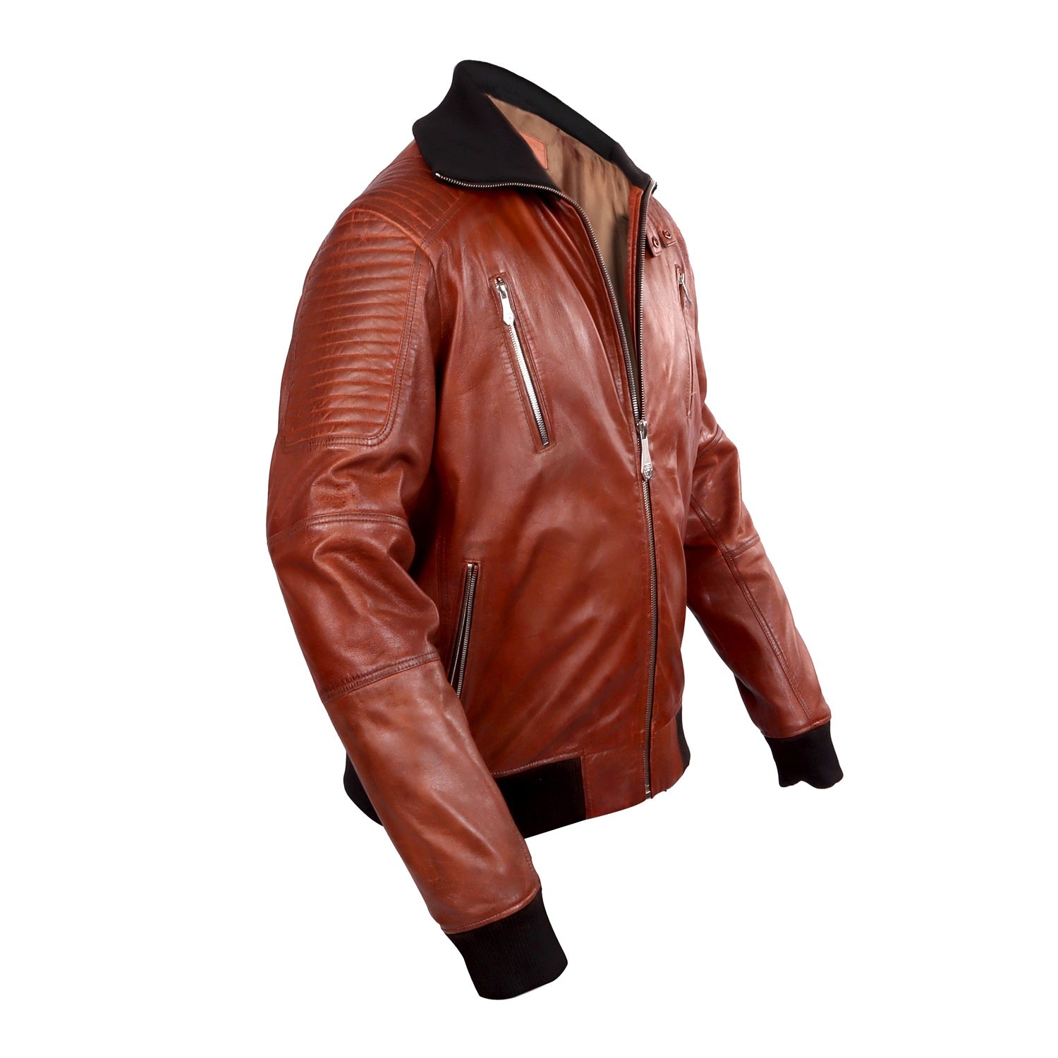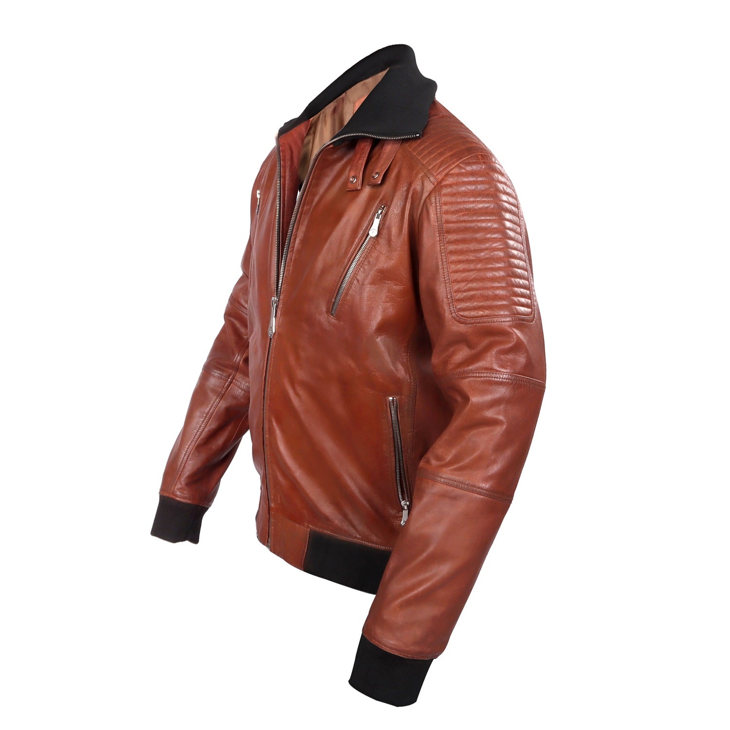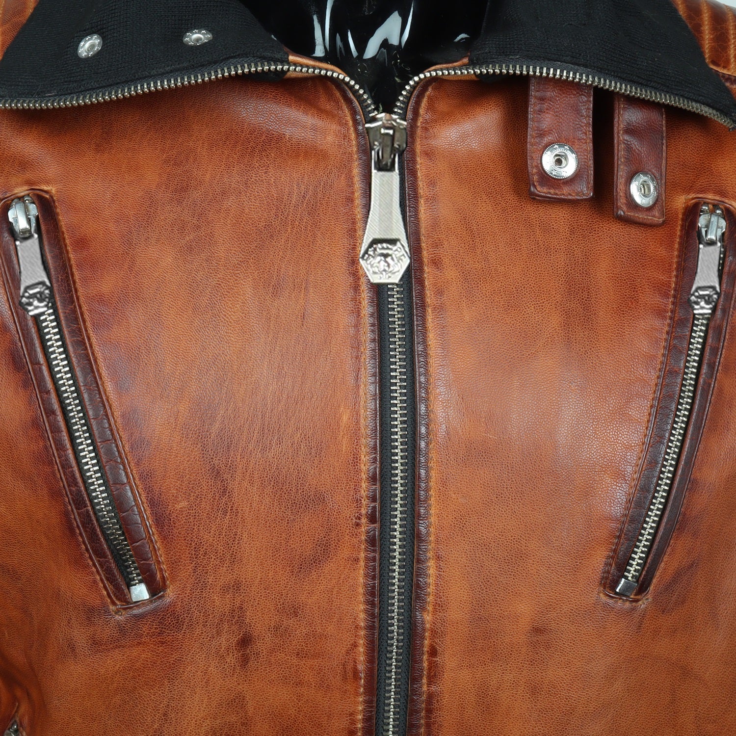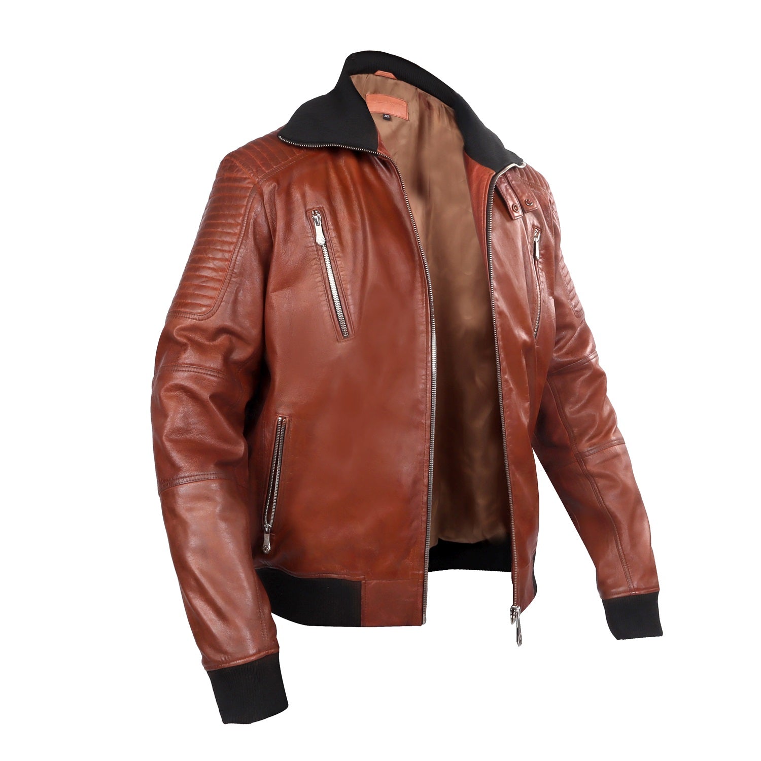 This Tan color leather jacket with black contrasting collar and bottom rib looks lavishing. The genuine leather in tan color looks very stylish with a classic accent tint. This jacket features a woven collar which looks very impressive in both the modes, laying and standing collar. This textured Brune & Bareskin full grain Italian Leather jacket is made to stay with you across generations. Wear it for work or any other occasion when you need to step up your look. This Jacket is such a dress to impress product. All our Brune & Bareskin brand Jackets have an ageless attitude and a modern fit.