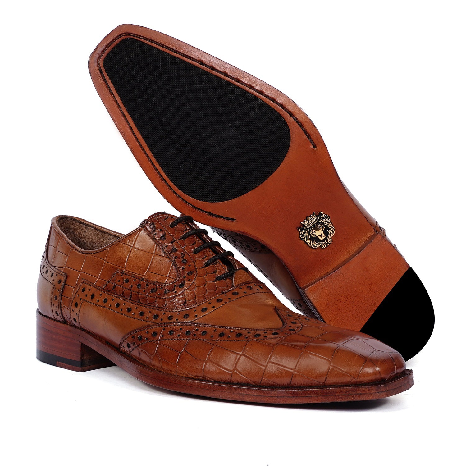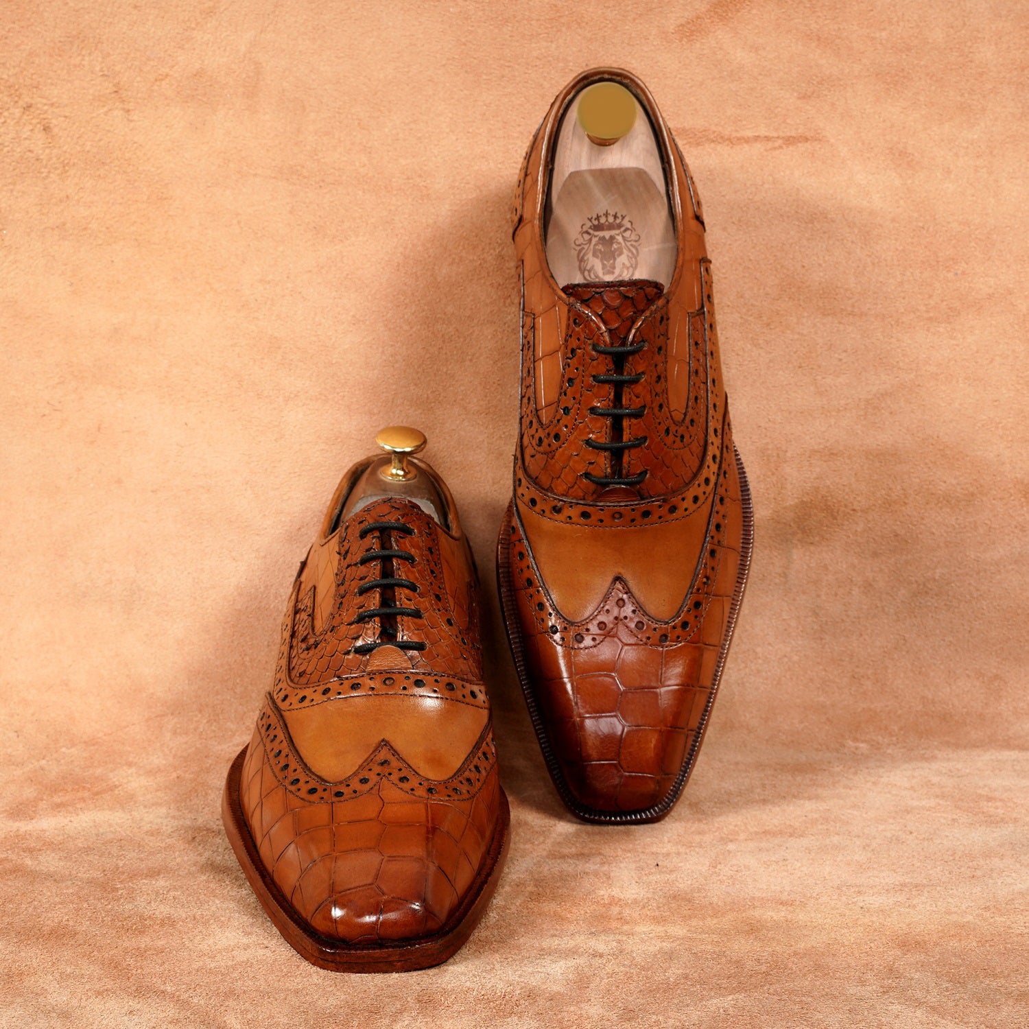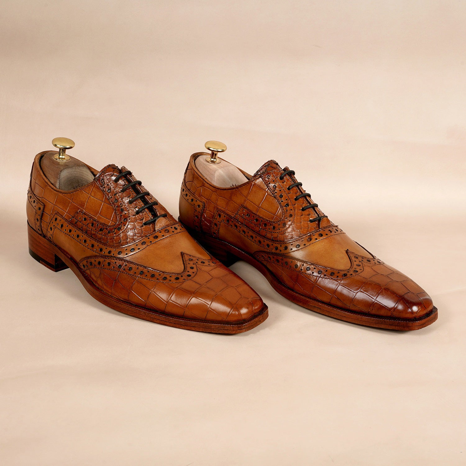 Tan Leather Formal Shoes with Wingtip Punching Brogue Oxford Lace-Up Closure