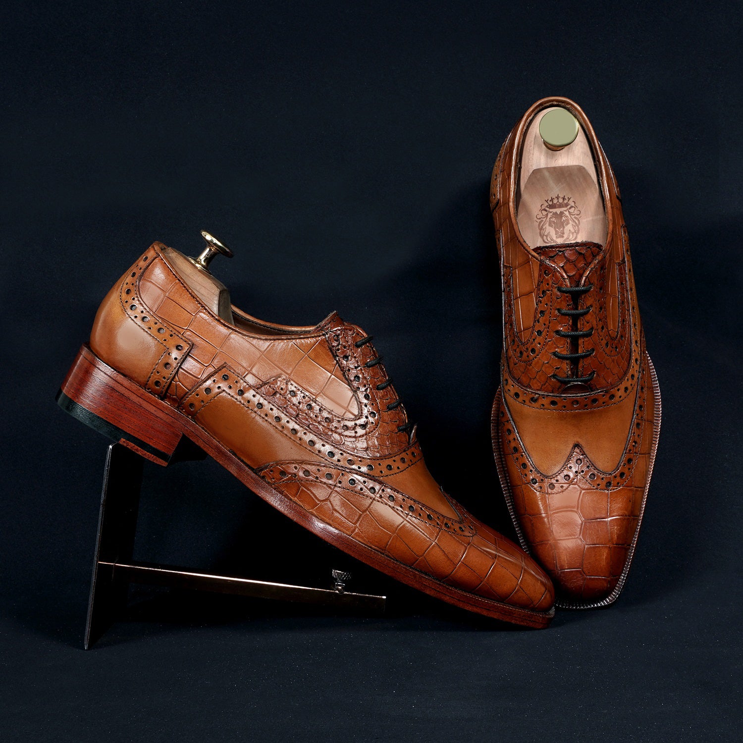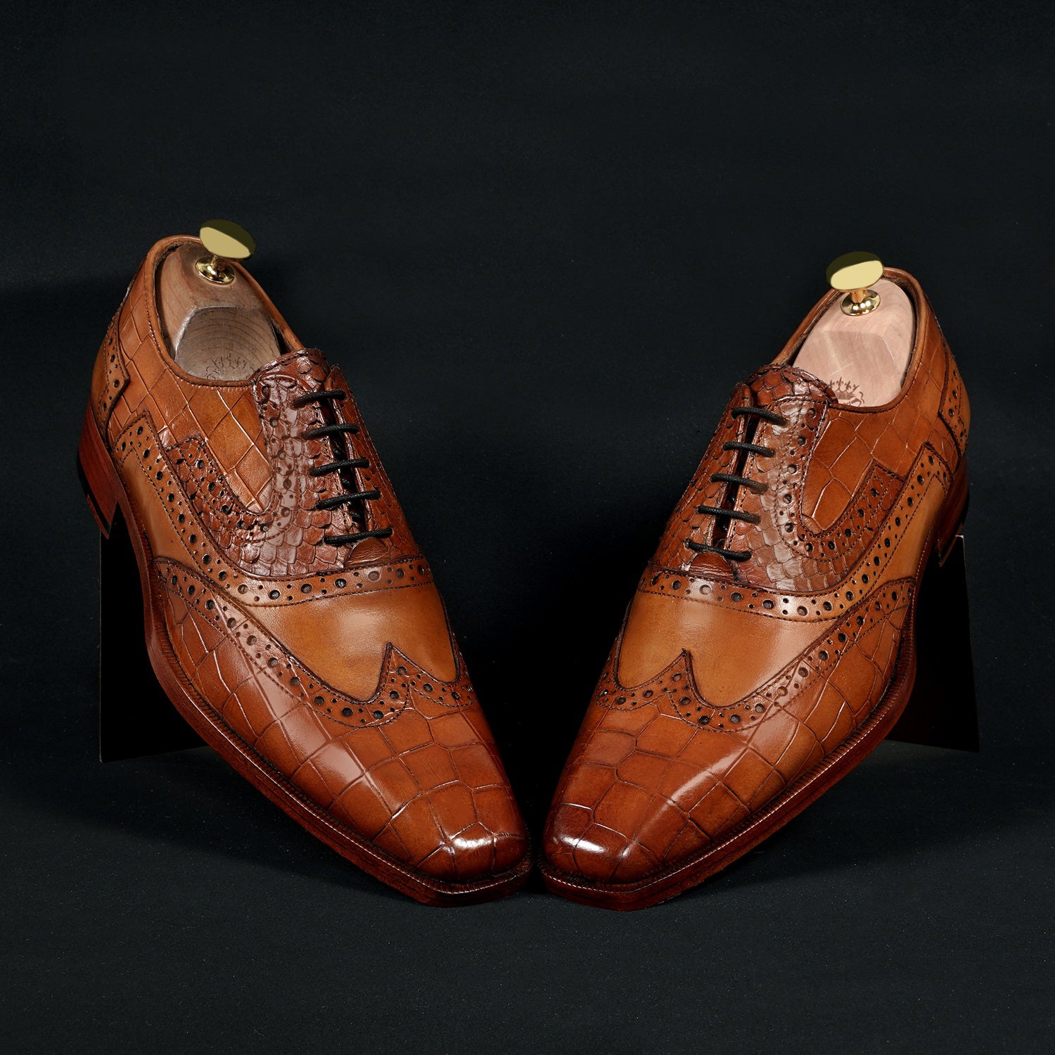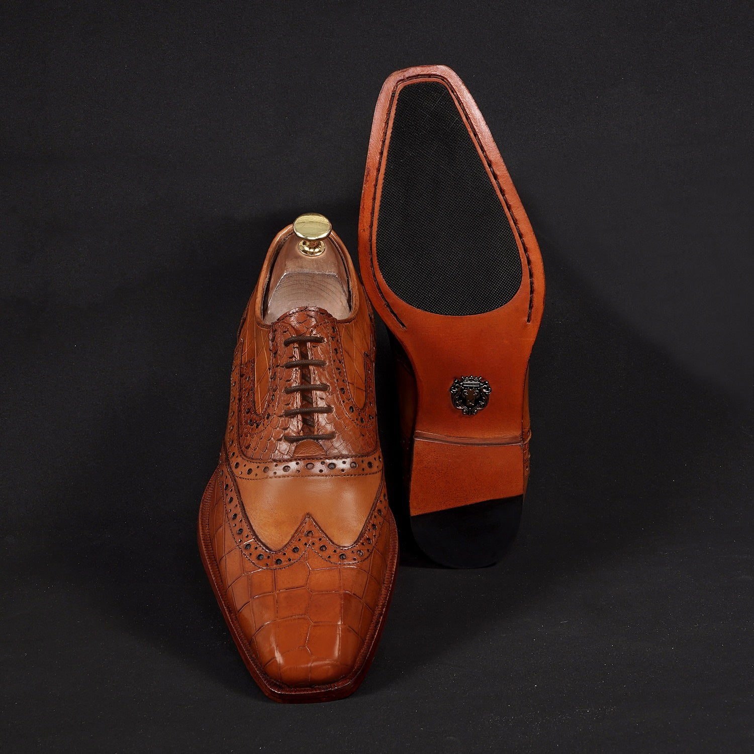 Tan Leather Formal Shoes with Wingtip Punching Brogue Oxford Lace-Up Closure