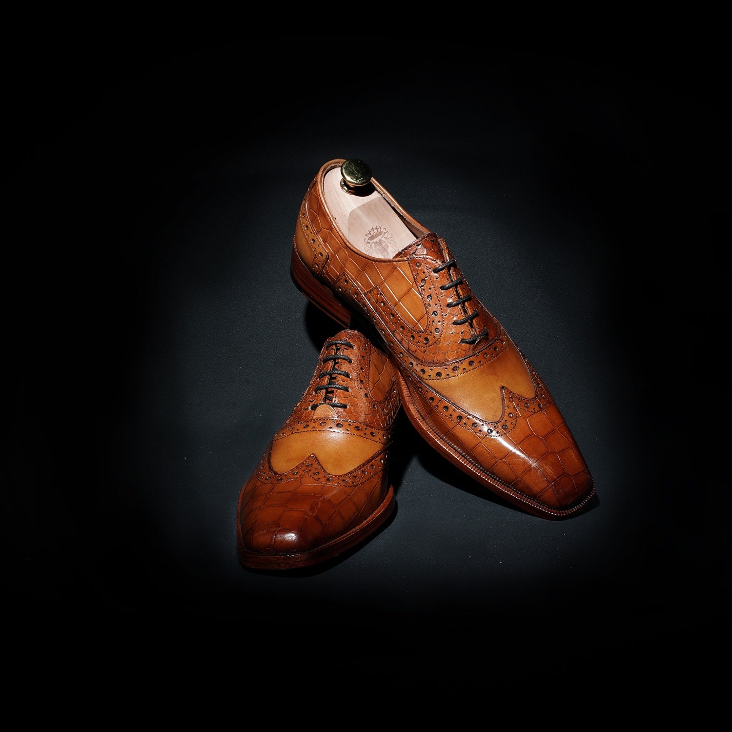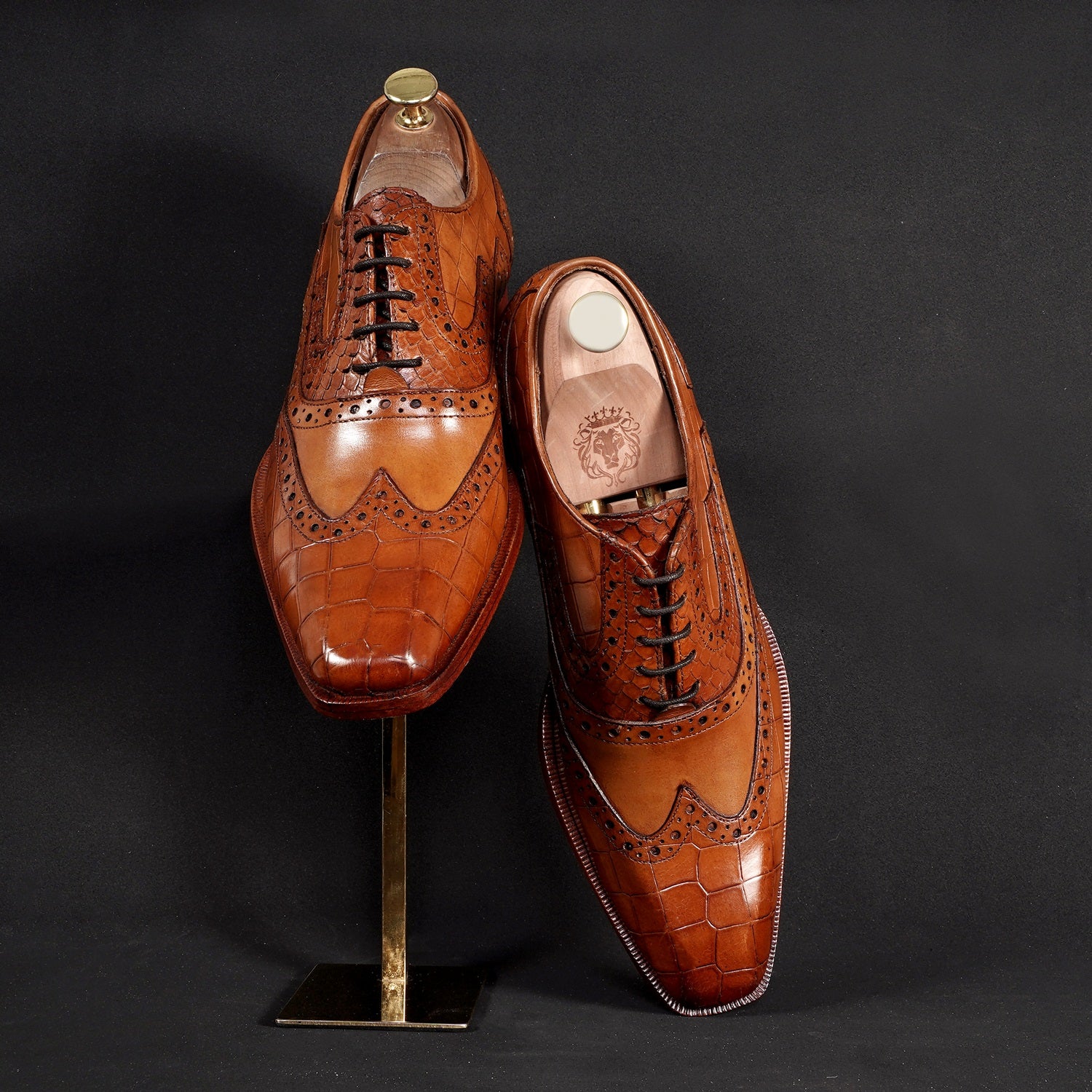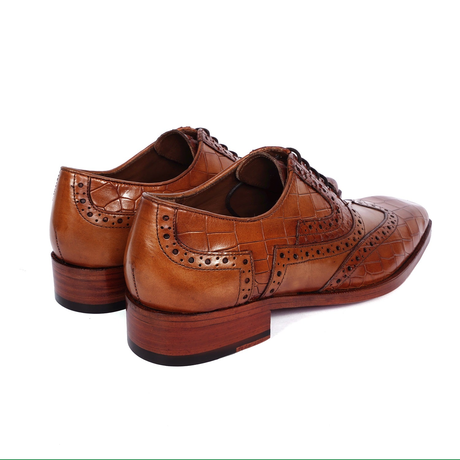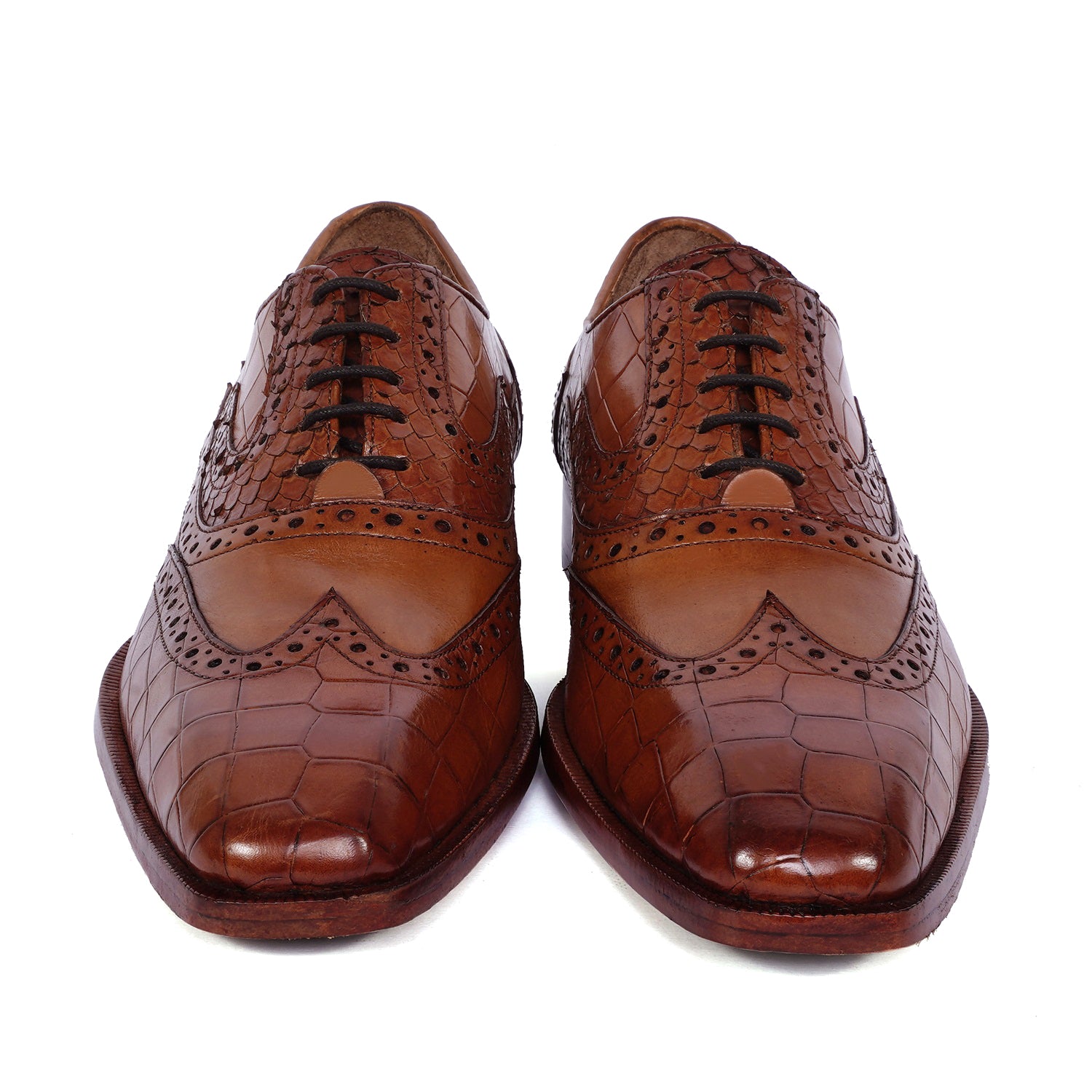 Handcrafted by Brune & Bareskin, they are the perfect combination of genuine, Croco textured leather and snake skin textured leather for a unique look, this design features a squared pointed-tip, a wingtip punching brogue toe, croco textured leather from toe to quarter and around the ankle, and a snake skin textured leather design on the vamp.