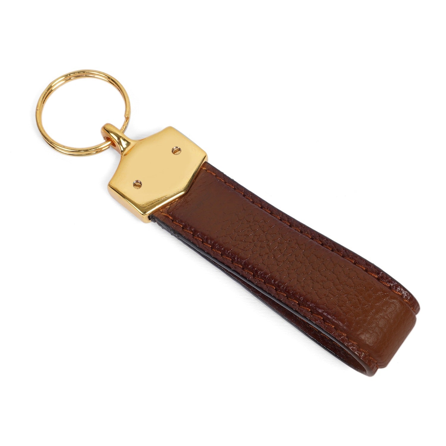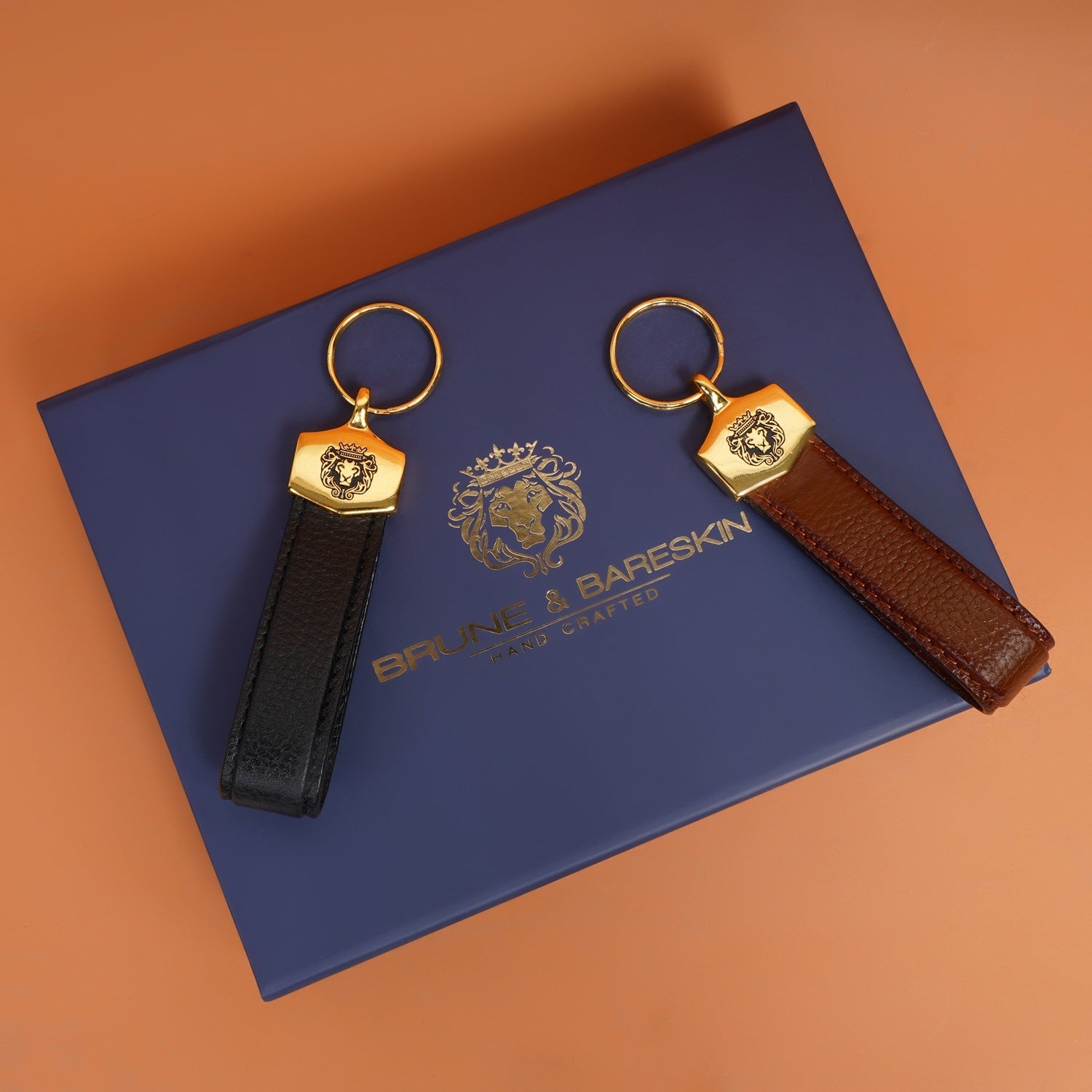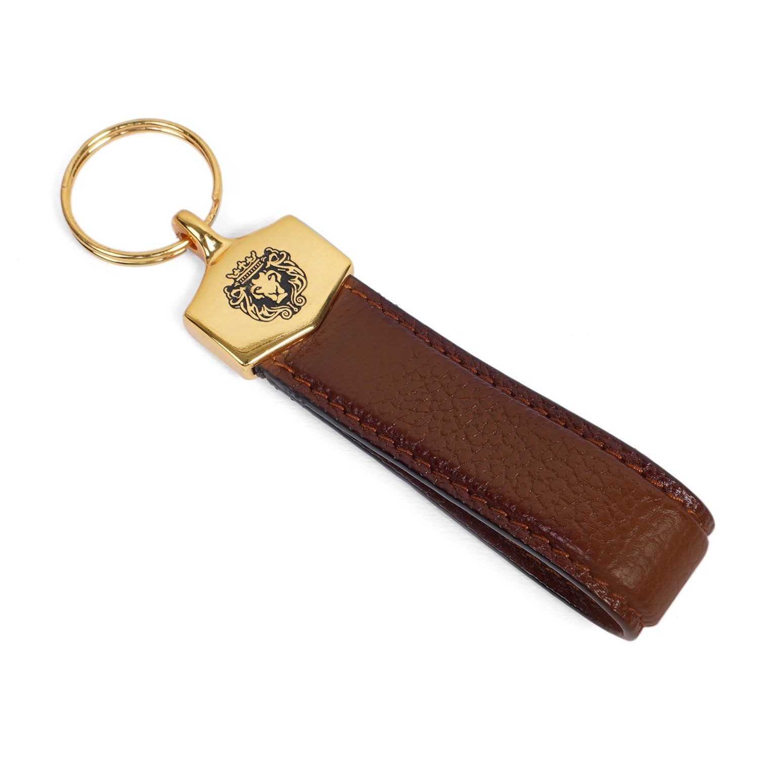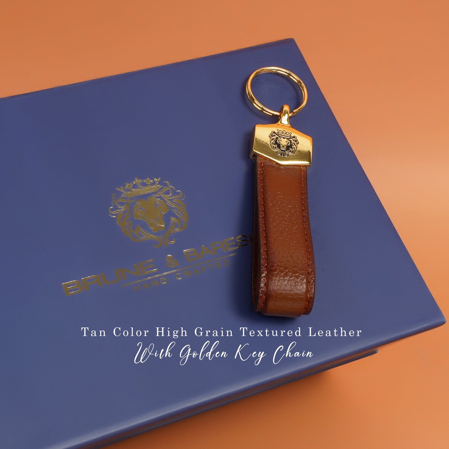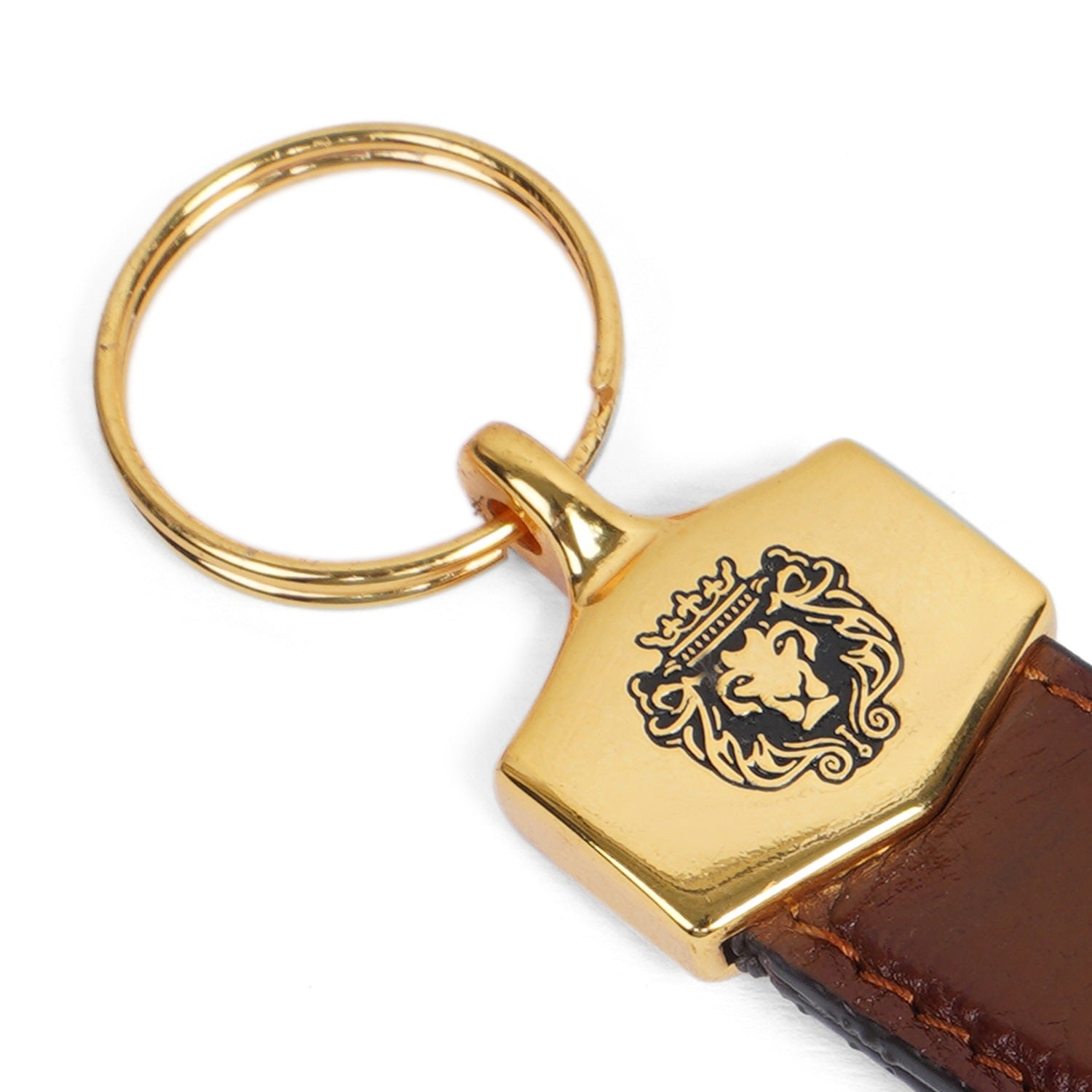 This elegant leather keychain is a stylish travel accessory. The tan color leather enhances looks very chic. The gold finish fittings compliments its overall color. Brune & Bareskin signature lion logo on the center looks very chic. You can also get it customized especially for you with your name initials and favorite color.