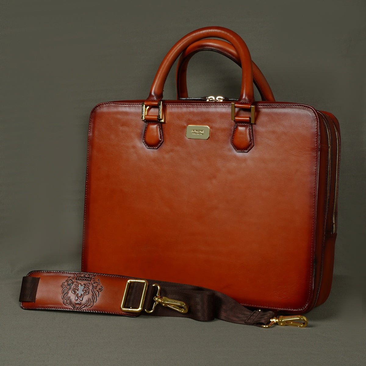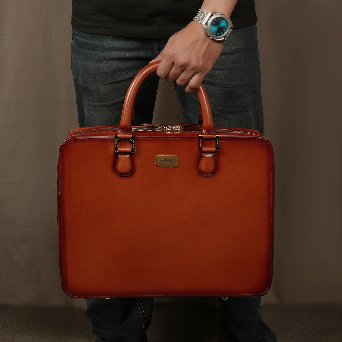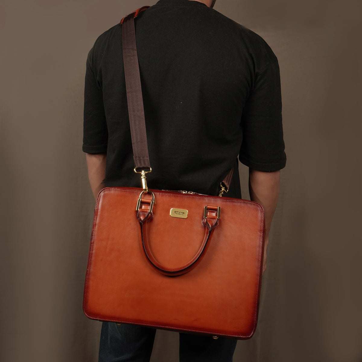 The tan Italian leather office laptop briefcase provides the perfect gentleman look. It has a dedicated laptop sleeve inside with the ultra soft lining. It has a dedicated suitcase opening organizer compartment with multiple pockets. It is a perfect office bag in today's fast pace life. The adjustable shoulder strap connects and removes easily with the hidden hardware loops. You can carry it easily with perfect size carry handles. The roller bag sleeve at the back helps to attach this to trolley bag while travelling. You can get your name mention on it with our Bespoke Services.