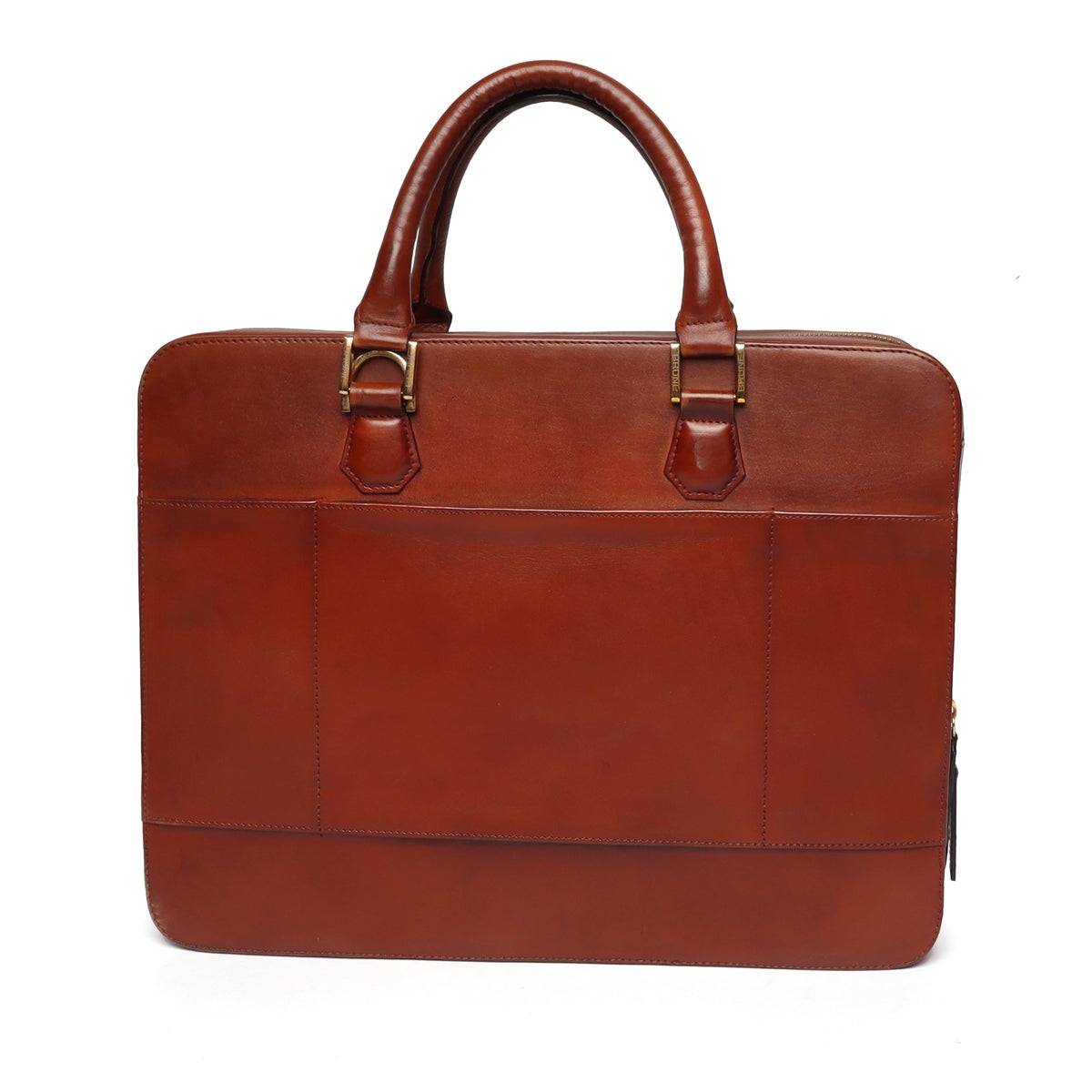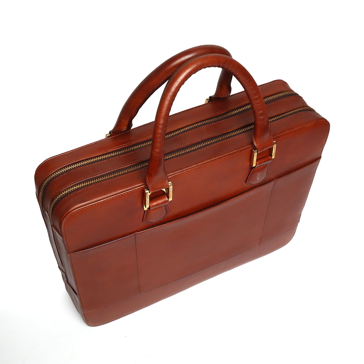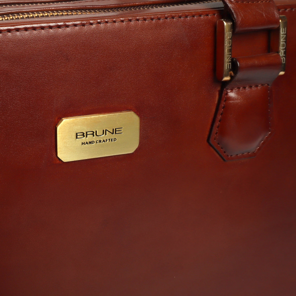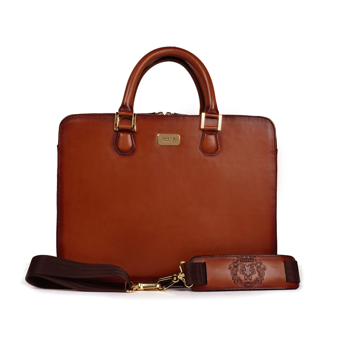 The tan Italian leather office laptop briefcase provides the perfect gentleman look. It has a dedicated laptop sleeve inside with the ultra soft lining. It has a dedicated suitcase opening organizer compartment with multiple pockets. It is a perfect office bag in today's fast pace life. The adjustable shoulder strap connects and removes easily with the hidden hardware loops. You can carry it easily with perfect size carry handles. The roller bag sleeve at the back helps to attach this to trolley bag while travelling. You can get your name mention on it with our Bespoke Services.