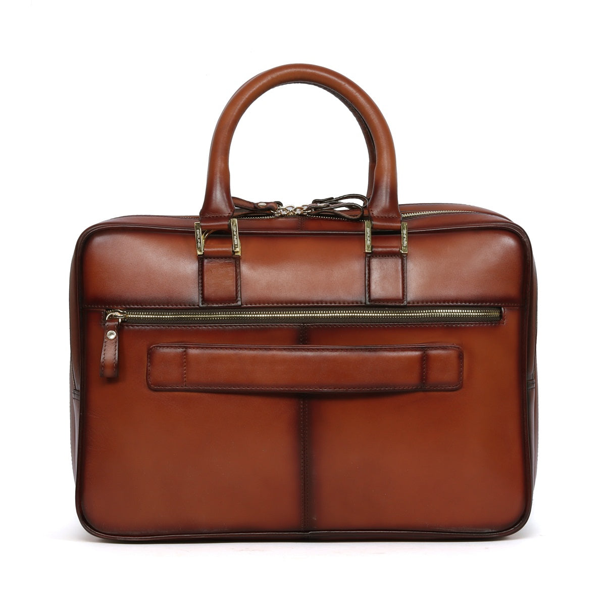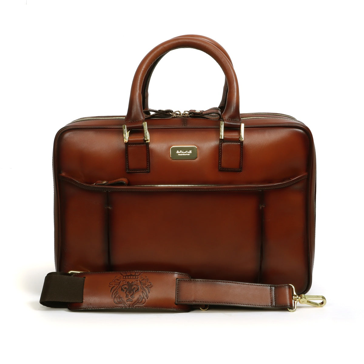 Introducing the epitome of functionality and style – the tan leather laptop briefcase bag with a double zipper compartment, a true masterpiece handcrafted by the artisans at Brune & Bareskin. This briefcase seamlessly marries the timeless charm of tan leather with modern conveniences, catering to the needs of the contemporary professional. The warm tan leather exterior exudes a sense of sophistication and versatility, making it an ideal companion for both formal and casual settings. The golden finish zippers and accessories add a touch of opulence, perfectly complementing the bag's overall aesthetic. Equipped with a thoughtfully designed double zipper compartment, this briefcase ensures organization without compromising on elegance. The adjustable shoulder strap, embossed with the brand's signature lion logo, provides comfort and ease as you navigate through your daily endeavors. Step inside, and you'll discover a world of efficiency. The interior boasts multiple compartments, each purposefully designed to house specific items. From passport and pens to business cards and mobile devices, everything finds its rightful place within the designated slots. The zipper pocket secures your valuables, while the padded laptop sleeve compartment ensures your technology stays safe and sound, even on the go. For added convenience, the exterior is adorned with zipper pockets on both sides. Whether it's a notebook, a charger, or documents you need to keep close, these pockets are ready to accommodate. But the functionality doesn't end there. For those days when you're navigating airports and stations, the trolley straps at the back of the briefcase make it a breeze to slide onto your luggage trolley, keeping your hands free and your journey seamless.