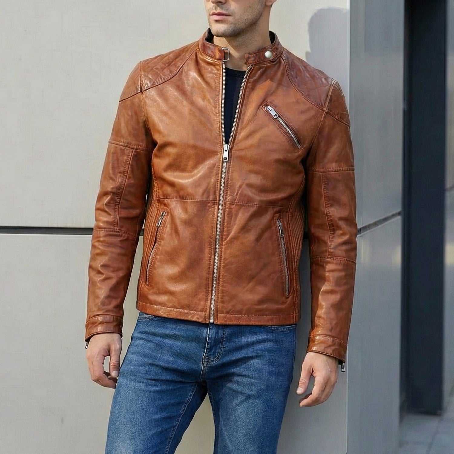 Modern Look Zip Closure Tan Leather Jacket By Brune & Bareskin