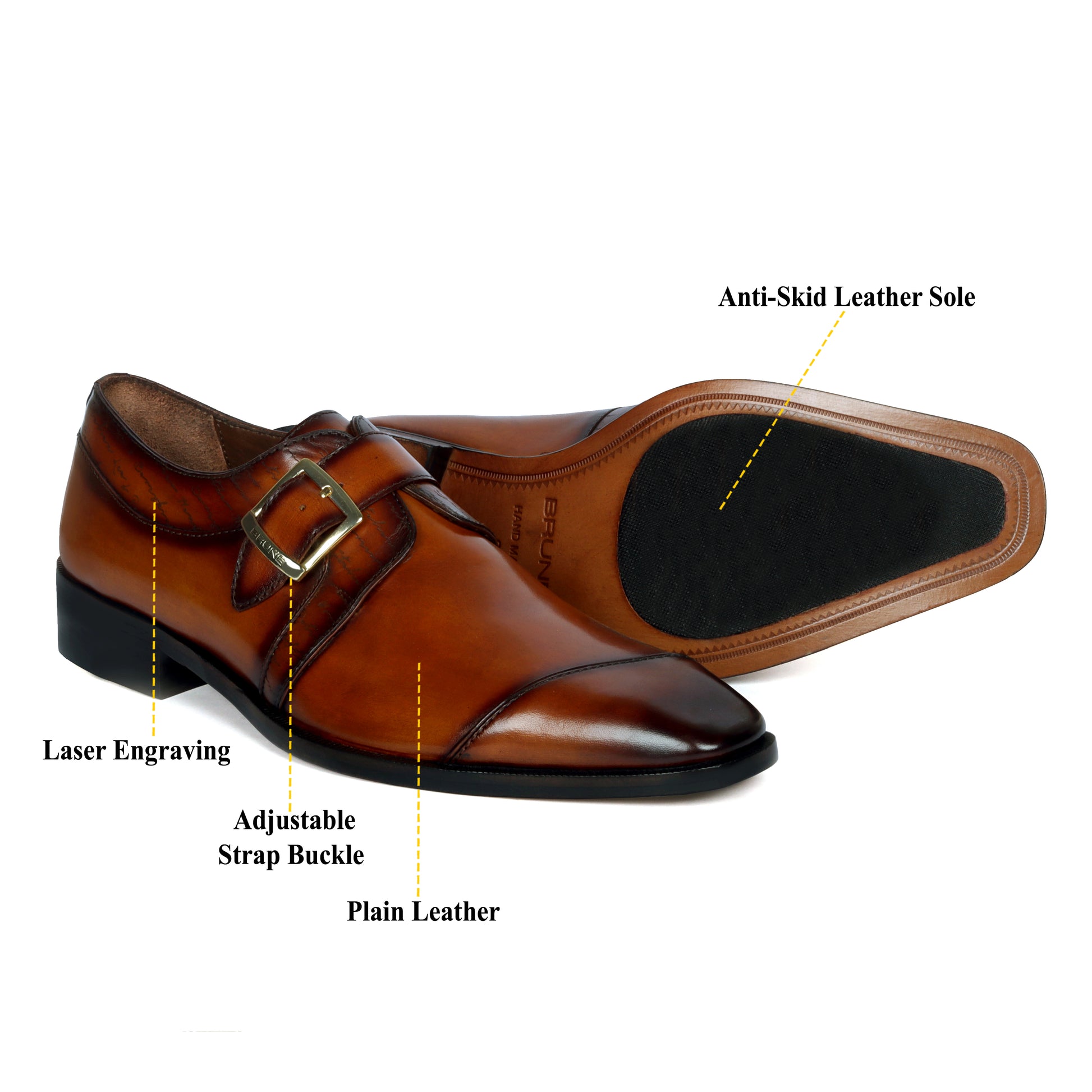 Brune & Bareskin always offers style and convenience to the customer. The right choice of color will make your day. The contrasting laser engraved strap dignified the darker shade of Tan leather perfectly on the shoe. The same is there with these laser engraved slant cap toe single monk slip-on formal shoe, these leather shoes are made up of pure leather with the idea of comfort-ability and vogue in mind.