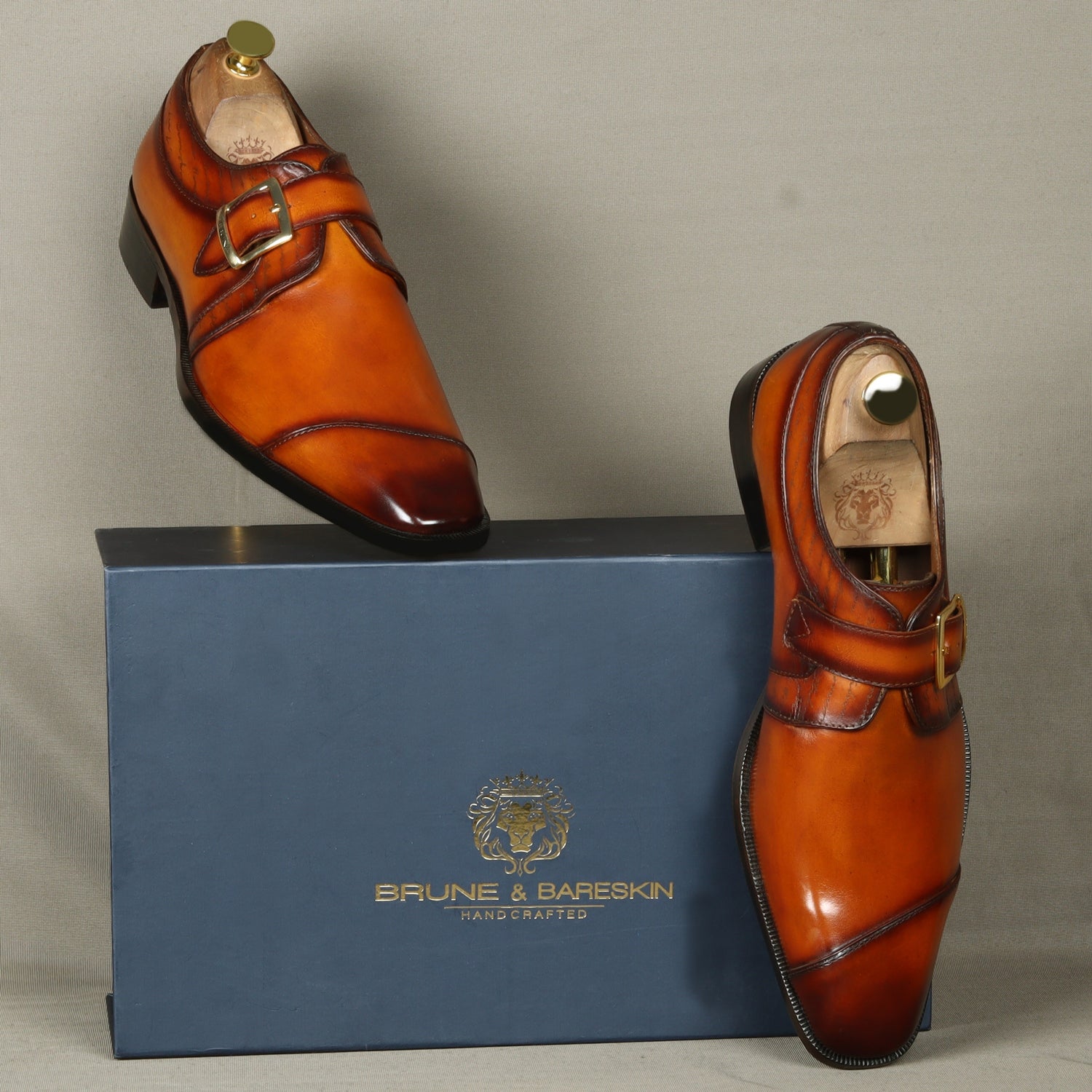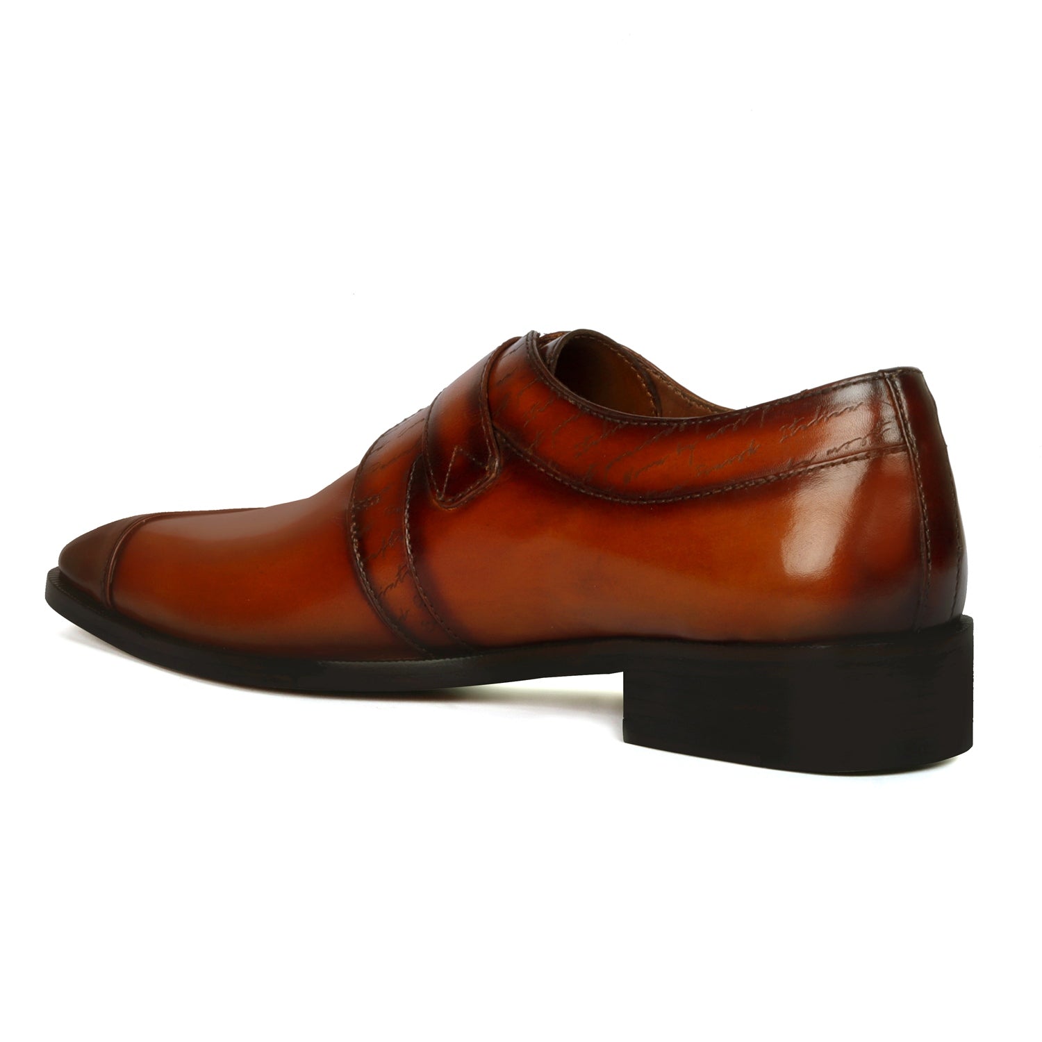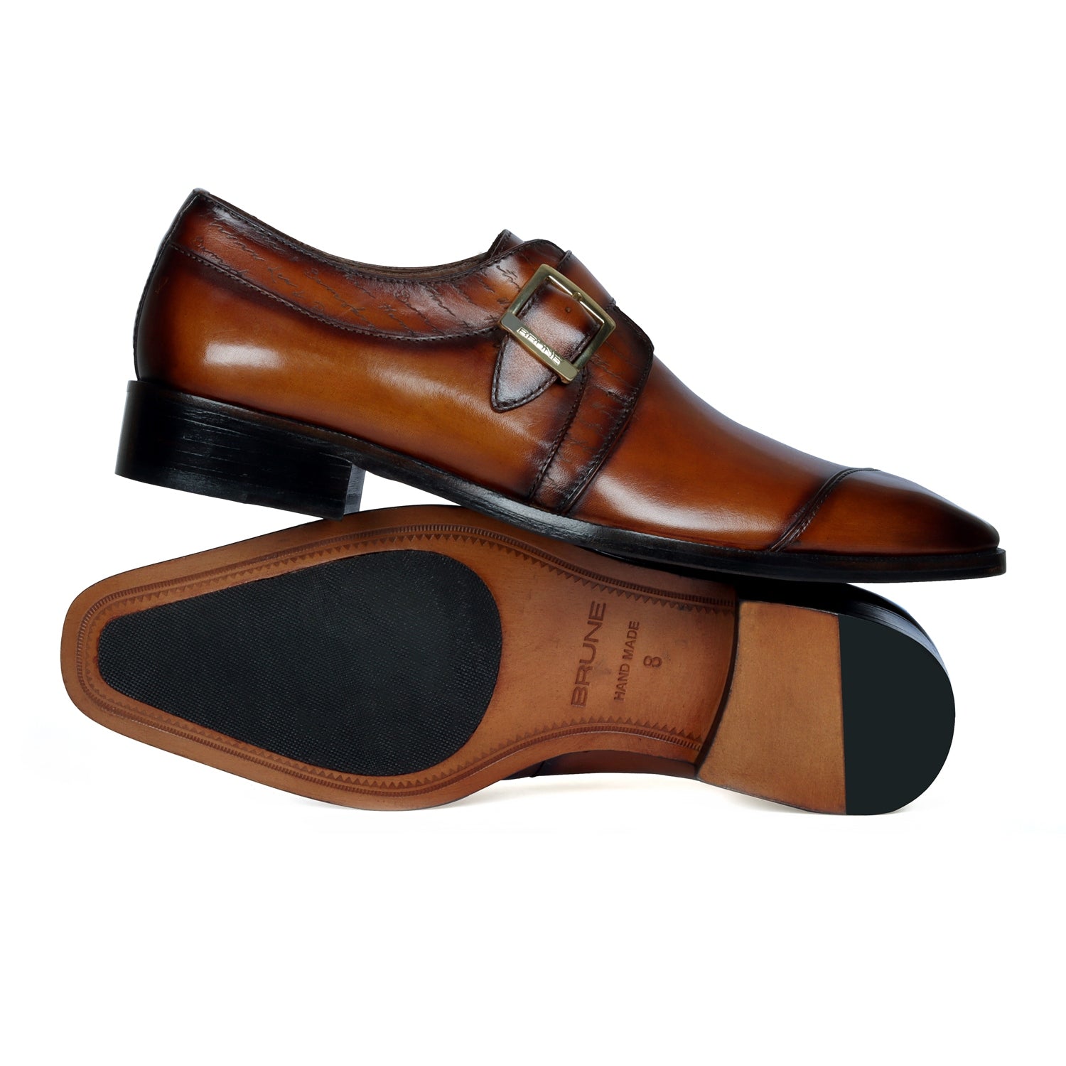 Tan Leather Single Monk Formal Shoes Slant Cap Toe Laser Engraved Top Line By Brune & Bareskin