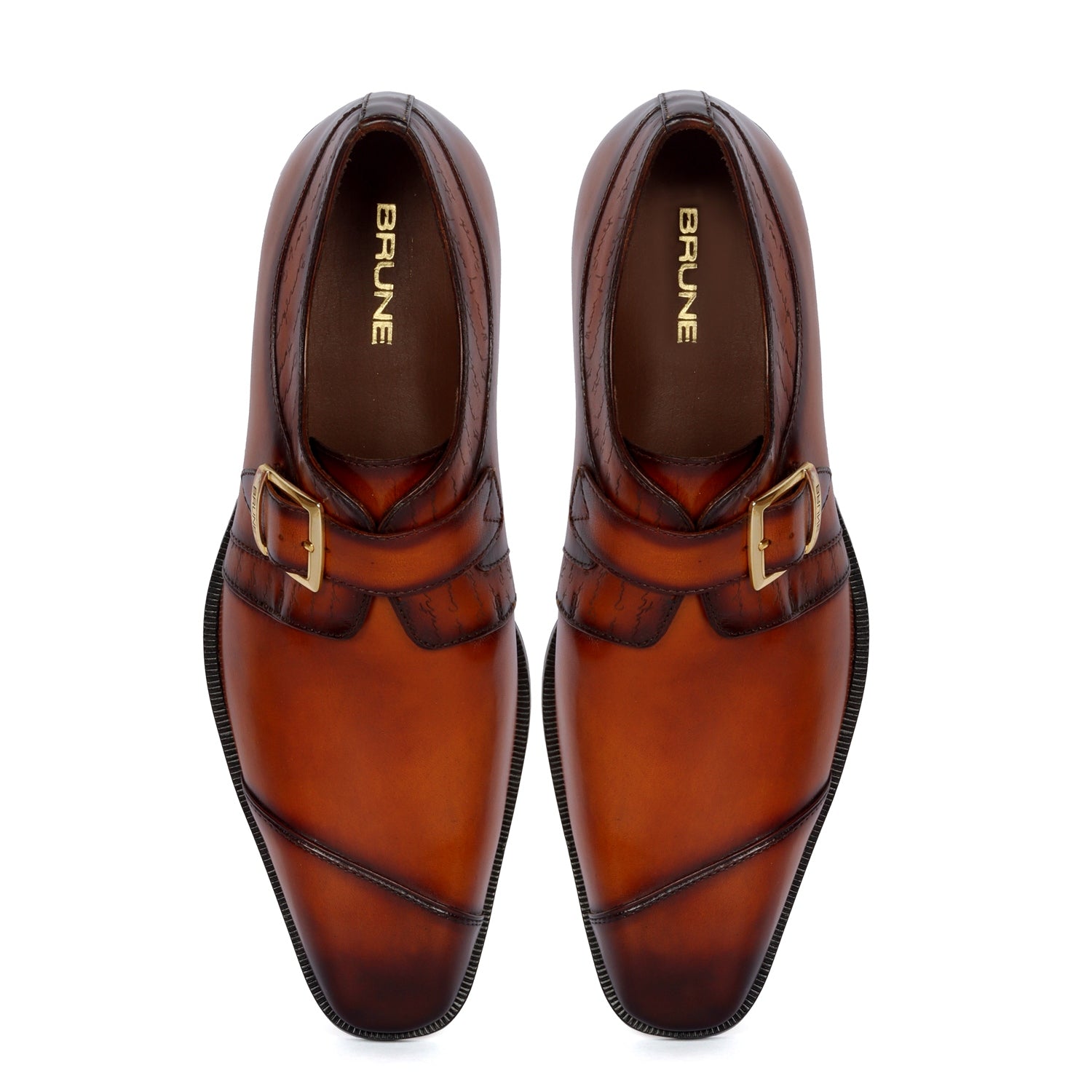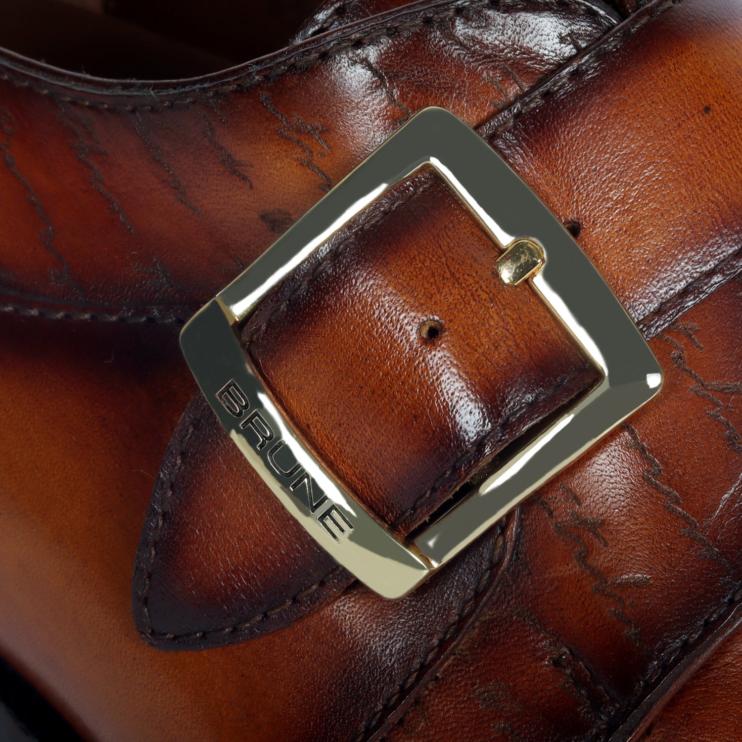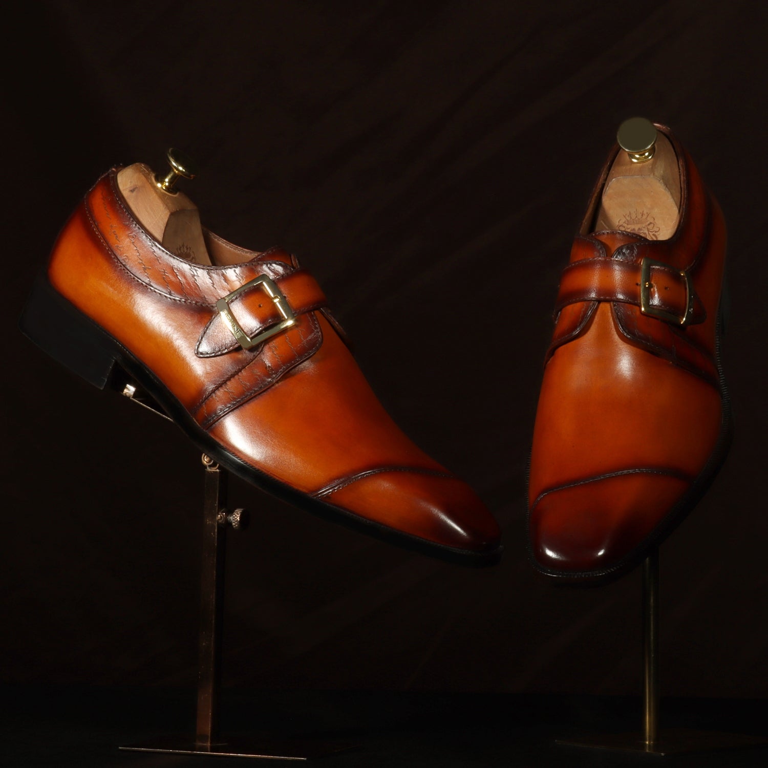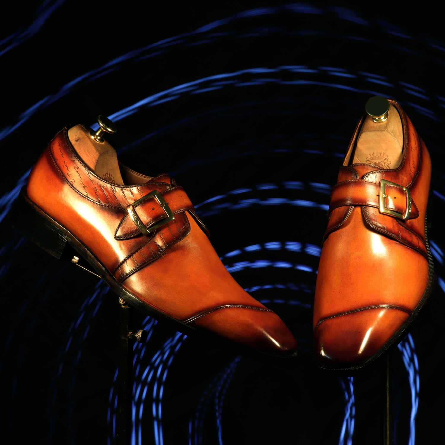 Tan Leather Single Monk Formal Shoes Slant Cap Toe Laser Engraved Top Line By Brune & Bareskin