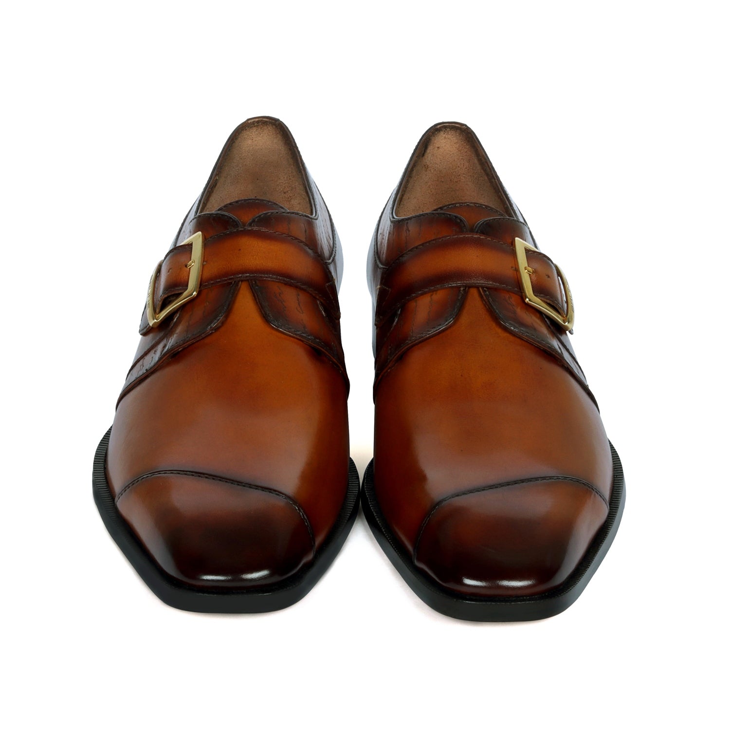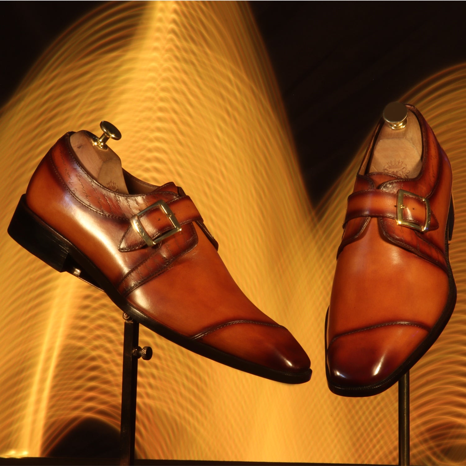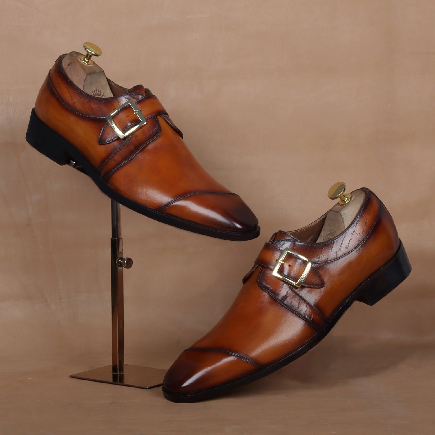 If you prefer the buckle and strap system for your shoes, over lace-ups shoes, then this is a perfect style for you. These Tan burnished colored leather formal men's shoe has a comfortable fit over slip-on and end over the arch of the feet, with the pointed tip of the shoe.