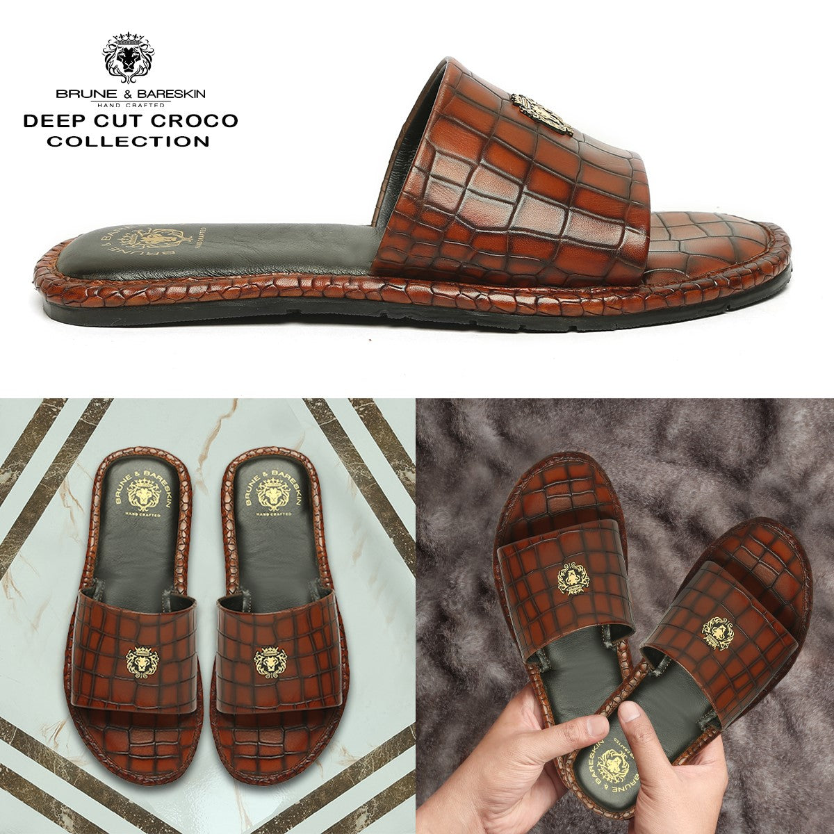 These new deep cut croco leather slippers are made to provide you the utmost comfort with highest level of style quotient. These slippers are crafted with precisely selected deep cut croco leather around the slippers. Hand paint on deep cut croco gives the unique look. The gel injected memory foam provides the cushiony effect on walking. Match the color with our other products to complete your look. You can get it made in your favorite color with our bespoke services.